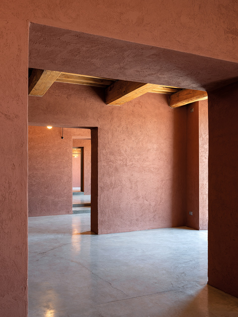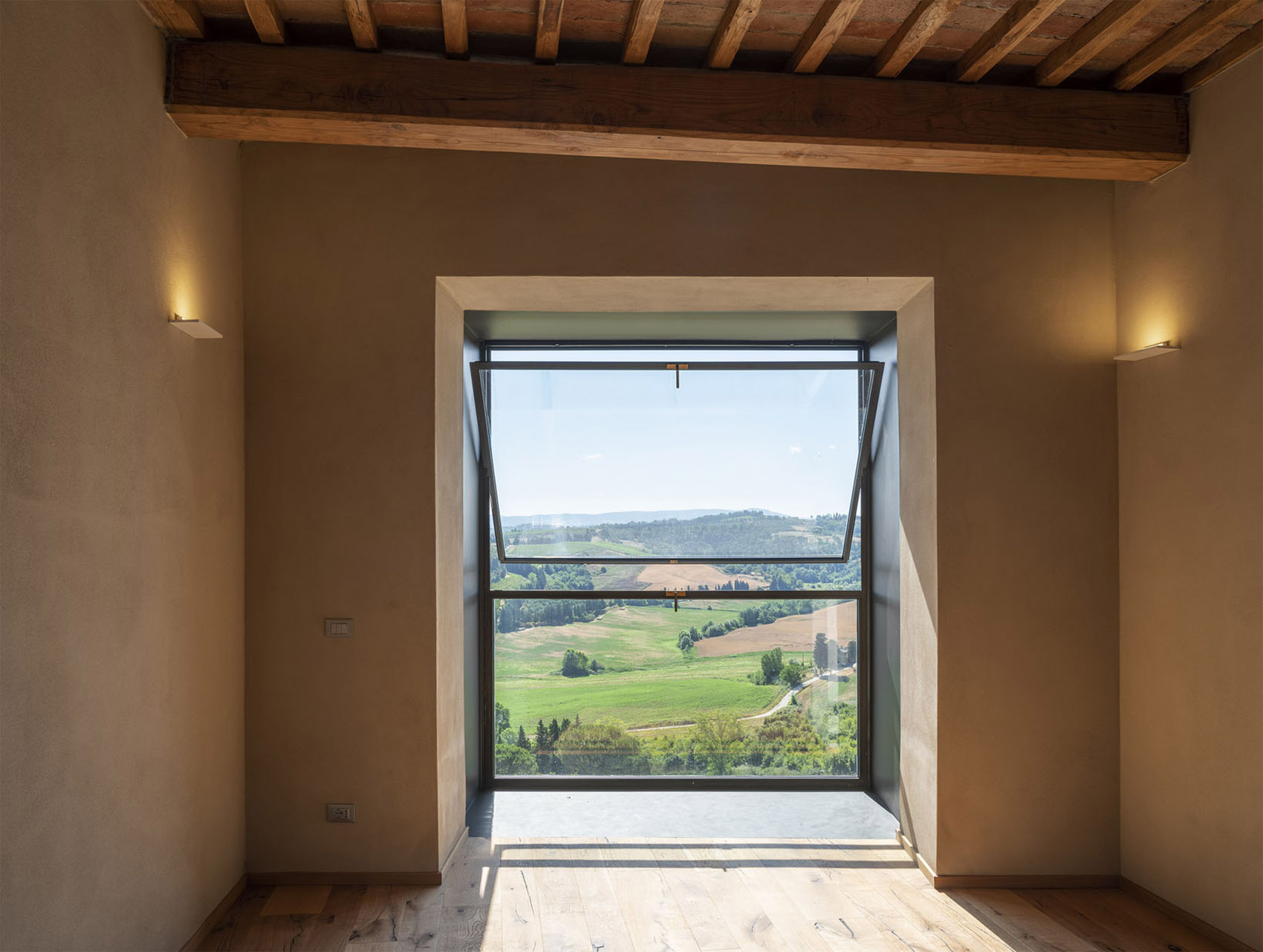 运用现代设计手法对传统元素进行转译。保留原建筑古老的木梁天花板,在屋顶及立面,增加天窗和部分凸窗,给室内带来宜人的日光。向外凸出墙体的窗户,似画框般,将山谷景观引入室内,建筑与自然有机互动。建筑三面均设置玻璃幕墙,构成观景框架,田园山麓全景一览无余。木质内饰,统一的色彩协调新旧建筑之间的整体性,充分尊重Peccioli的历史脉络和自然环境。