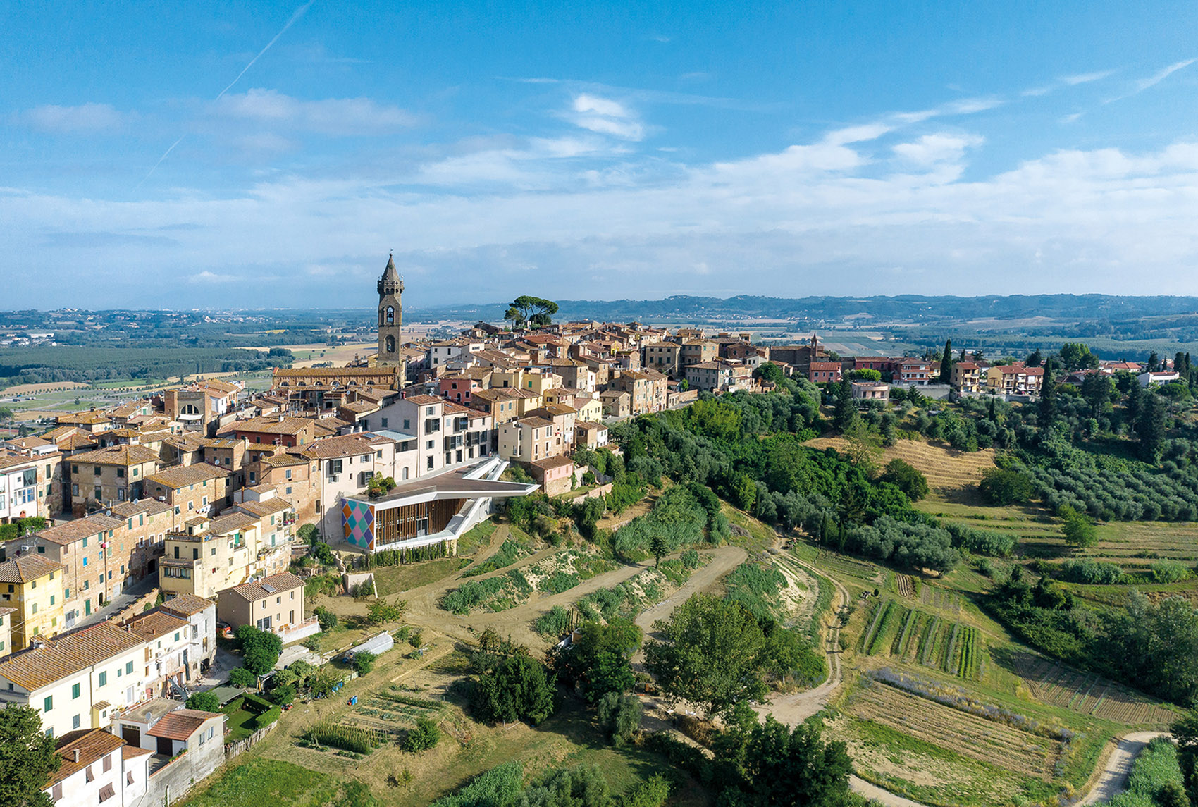 矗立这座伸向山谷的“浮桥”,背靠中世纪古城,沉醉于满眼连绵的托斯卡纳山麓美景…这里是Peccioli佩乔利创意文化中心“永恒之宫”,是这座古老小城连接历史与未来,城市与自然的崭新之桥。Peccioli (佩乔利),位于意大利托斯卡纳,一个以壮丽的田园风光和悠久历史闻名于世的地方。这座中世纪古城依山而建,迷人的阶梯和独具特色的巷弄,蜿蜒于山顶老城中。遍布的古建筑眺望着山谷,完全保留着中世纪的风貌,诉说着千年的繁华与沧桑。