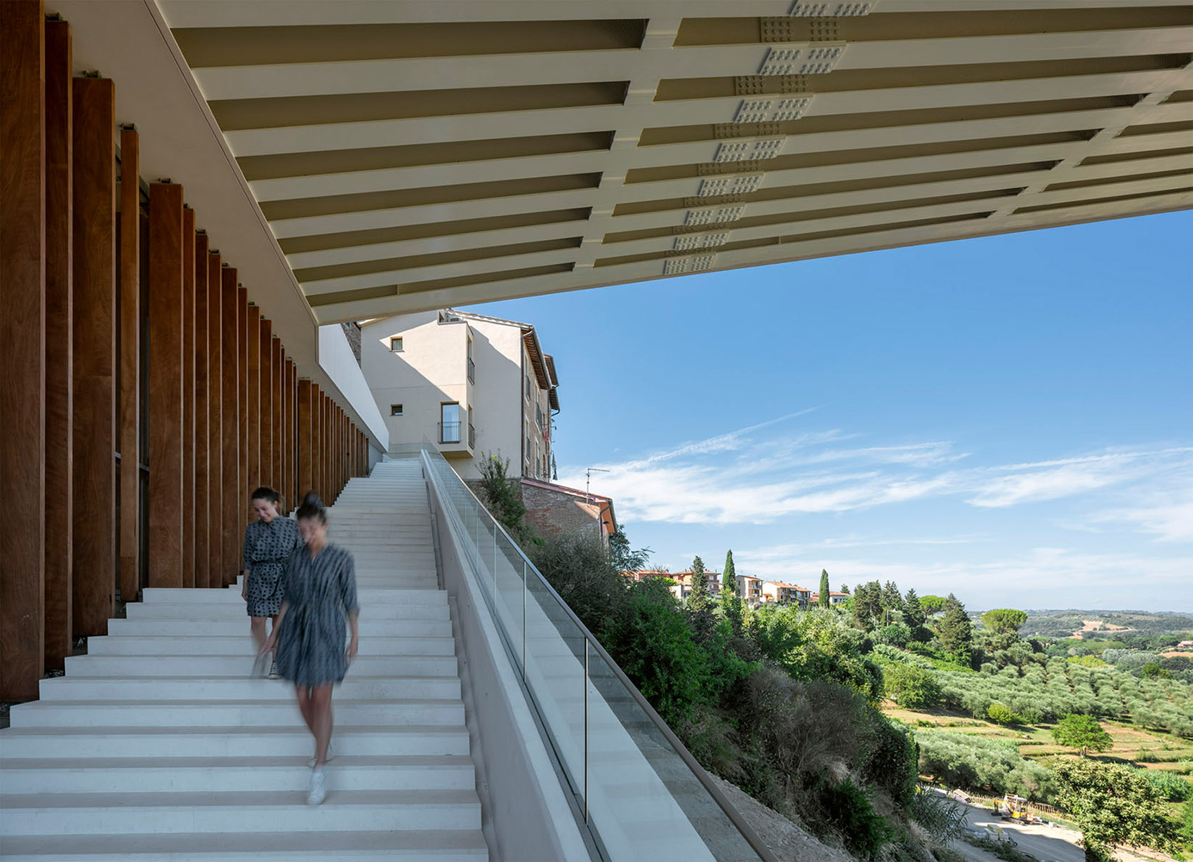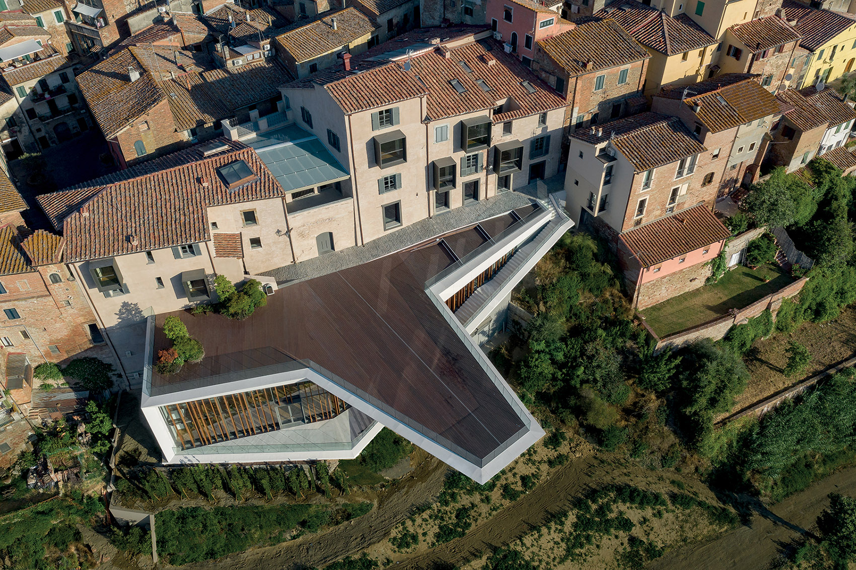 项目位于老城核心的Carraiada大街,由改造后的14世纪的宫殿建筑群和一座新二层建筑组成。Carraiada大街是Peccioli连接新城与老城的主干道,串连主教堂、市政厅等城市的重要节点。新旧功能元素有机分布于该综合体的多个楼层中,包括公寓、展览馆、联合办公空间、多媒体图书馆、公共会议室、咖啡馆和餐厅,以及一个600平方米壮观的悬挑观景台,融入山谷景观。
