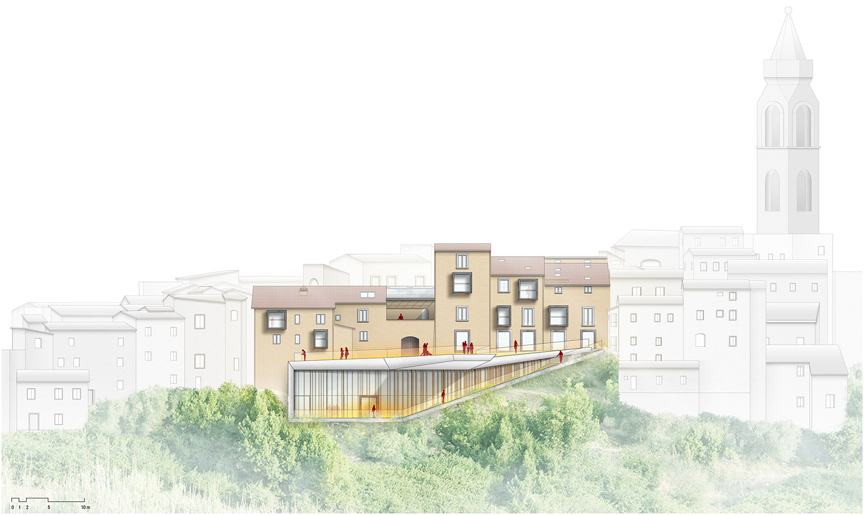 “浮桥”悬于山谷,距地面20米高,可直接从街道进入,丰富城市空间结构,为市民和游客带来多样的生活体验。设计打破了传统中世纪城镇的建筑布局, 仿佛是从防御城墙上打开的一条通道,伸向山谷。创建建筑与自然之间的对话平台,加强了建筑、人与自然之间的联系。
