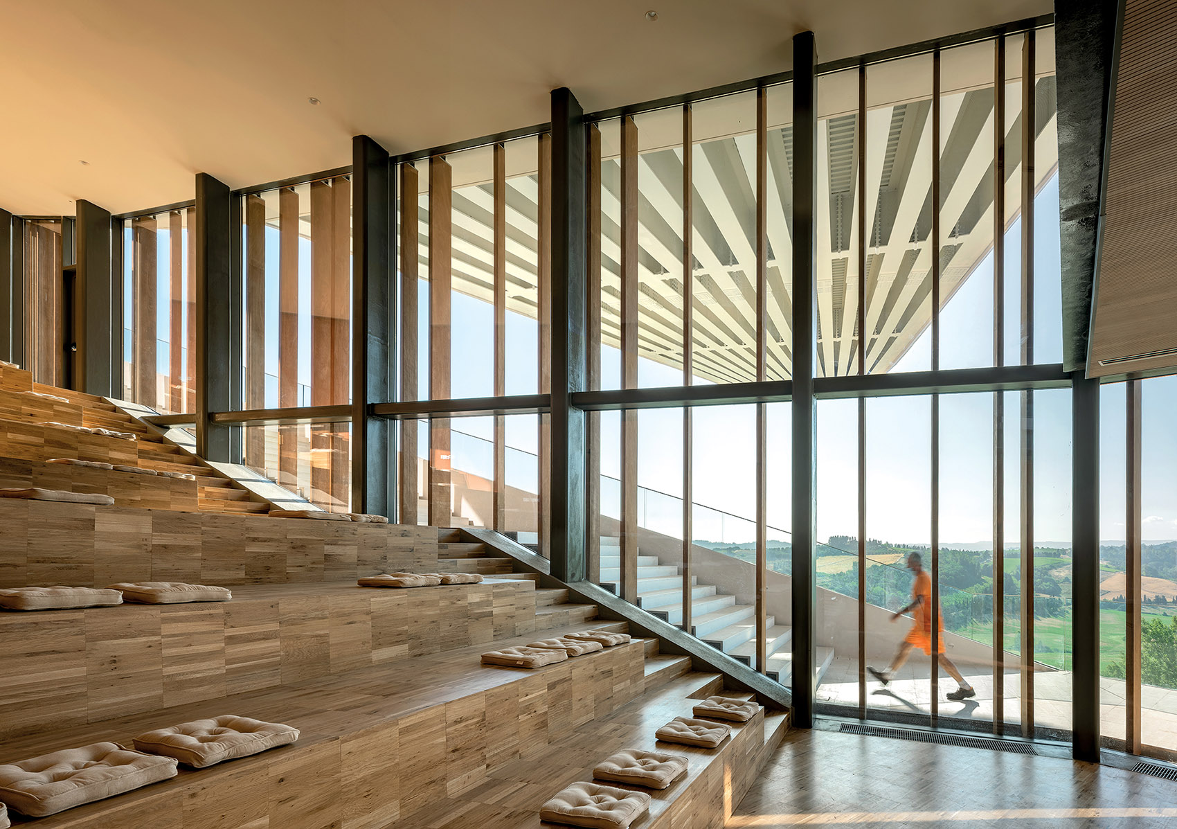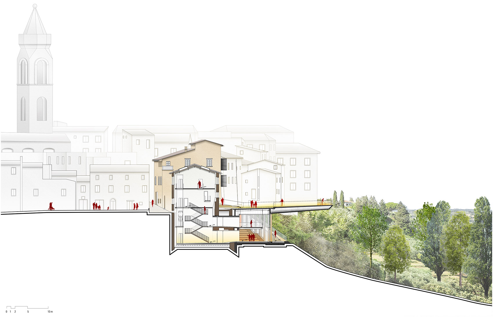 室内沿山坡设置开放式阶梯,可用于会议活动、交流和展览等。底部空间设置咖啡馆和餐厅,面朝山谷,山麓美景尽收眼底。建筑展示了建筑师对意大利山城特性的回应,连续的狭窄小巷通向宽阔而开放的城市空间,豁然开朗,创造出视觉的惊喜。这里可容纳多种公共活动,文化艺术表演、音乐会、露天影院等。在这里,历史、文明与自然在空中交织,展示出现代建筑如何自然融为意大利山城的一部分,打造面向未来的“活着的博物馆”,适应城市的可持续发展。