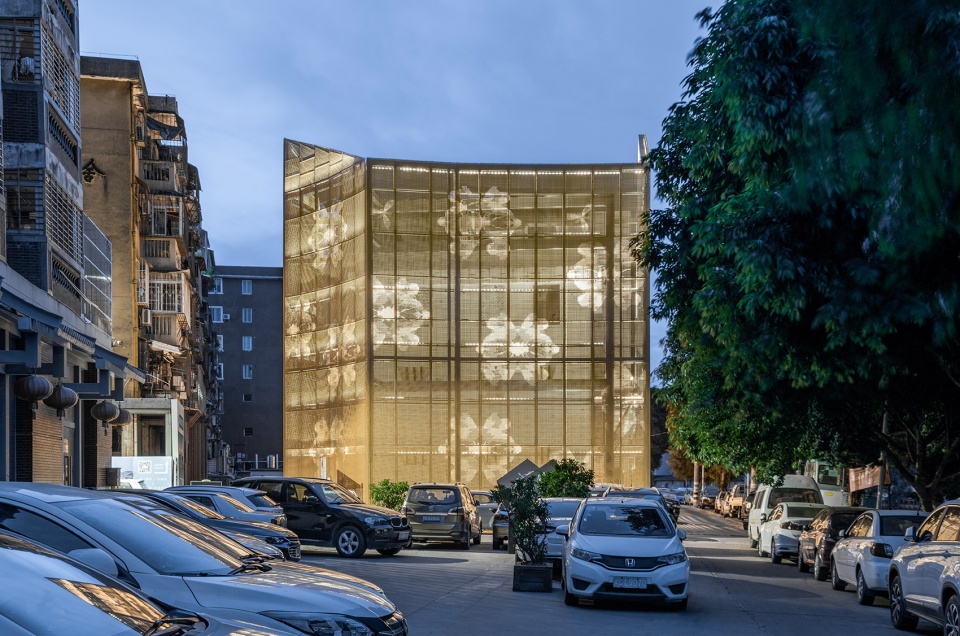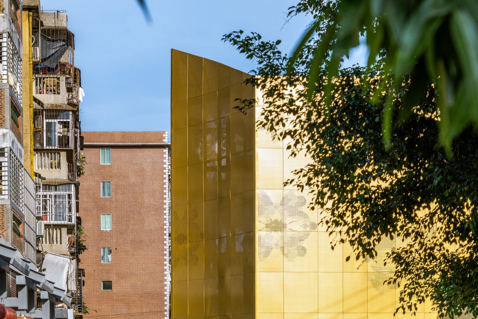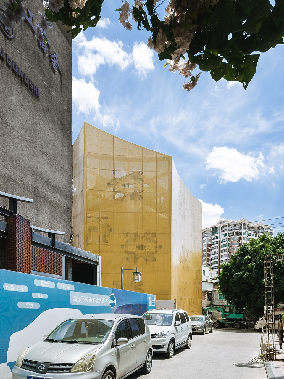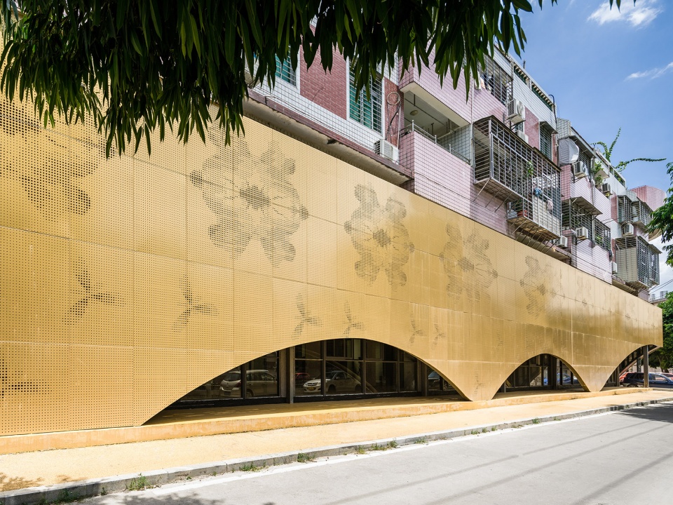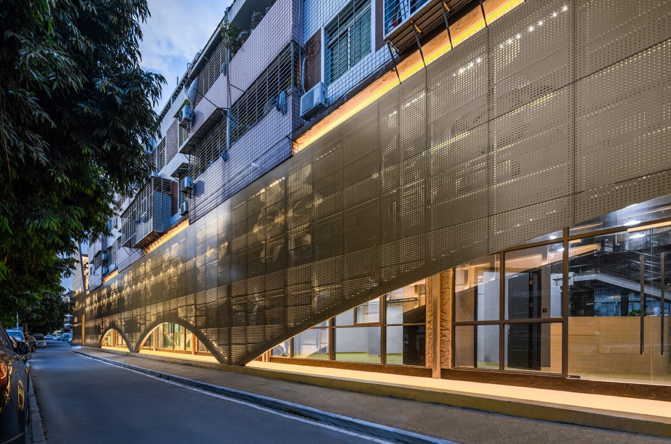 福建隆重的婚嫁现场给了设计师灵感,我们选用金色的穿孔铝板作为立面,只有金色才能表达泉州曾经的远东第一港口的辉煌历史以及有效地占据新门街的要隘。