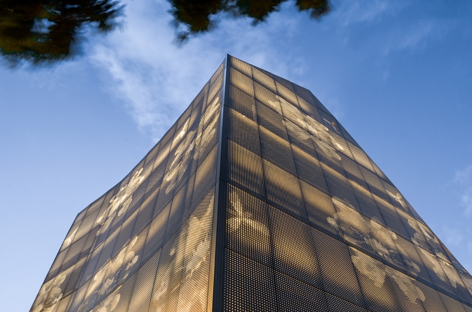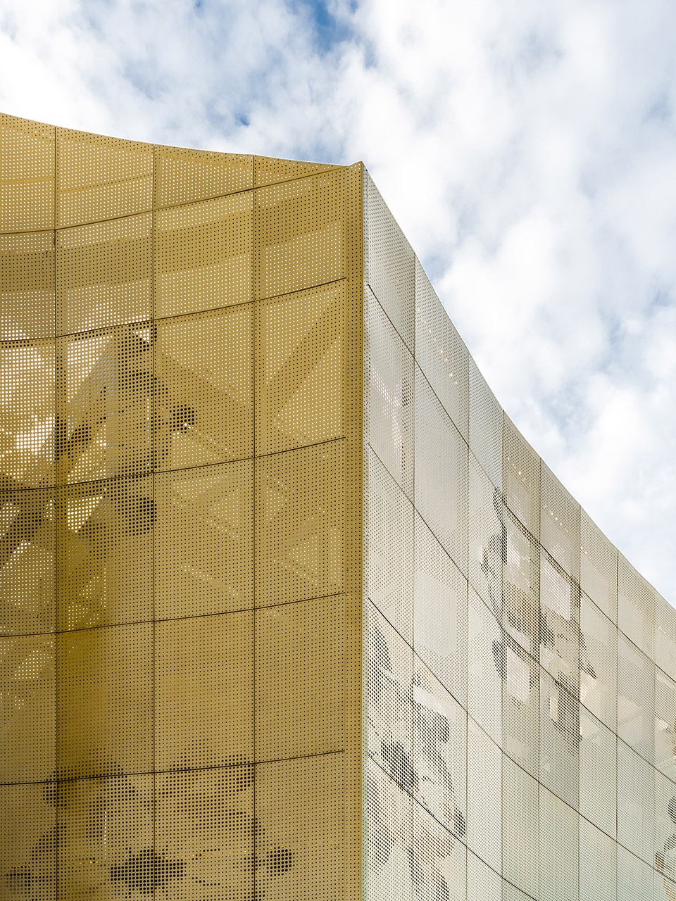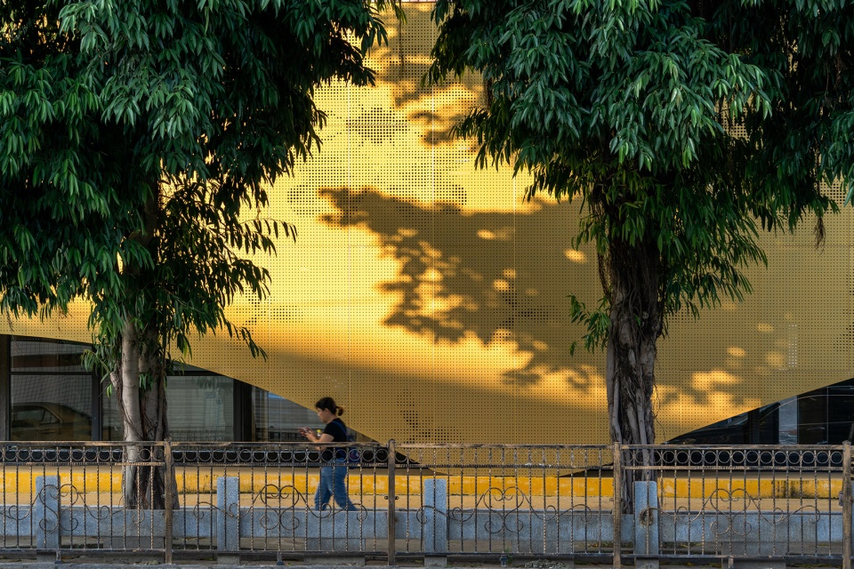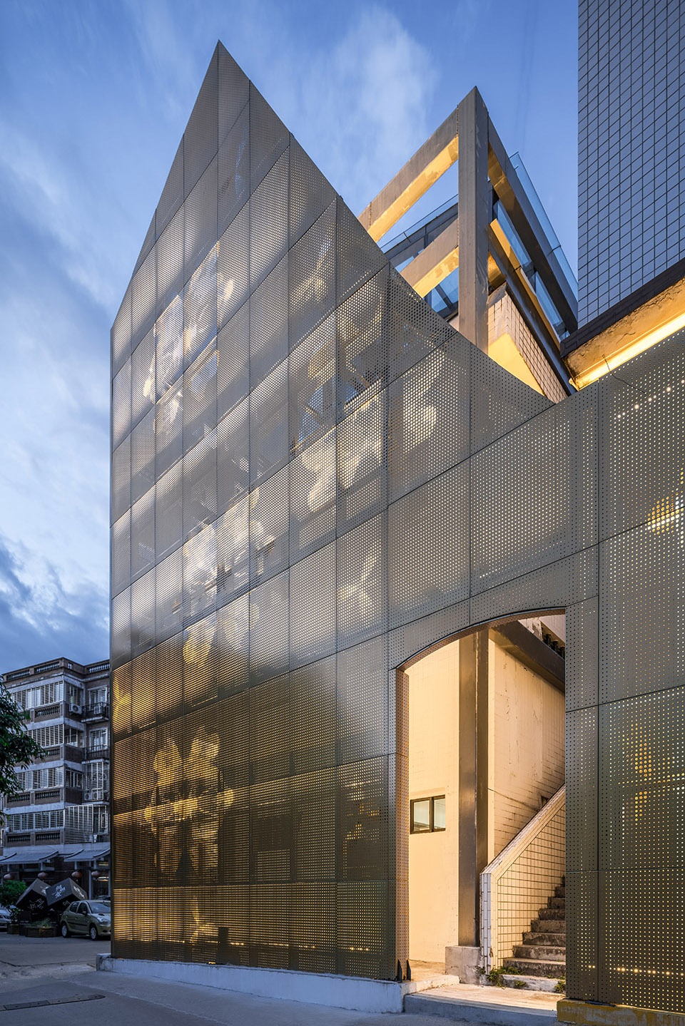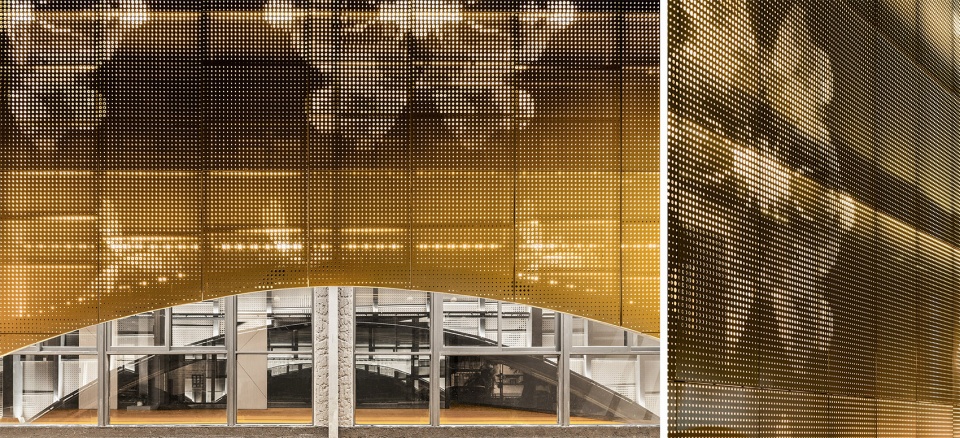 ▼项目外观局部,选用金色的穿孔铝板作为立面