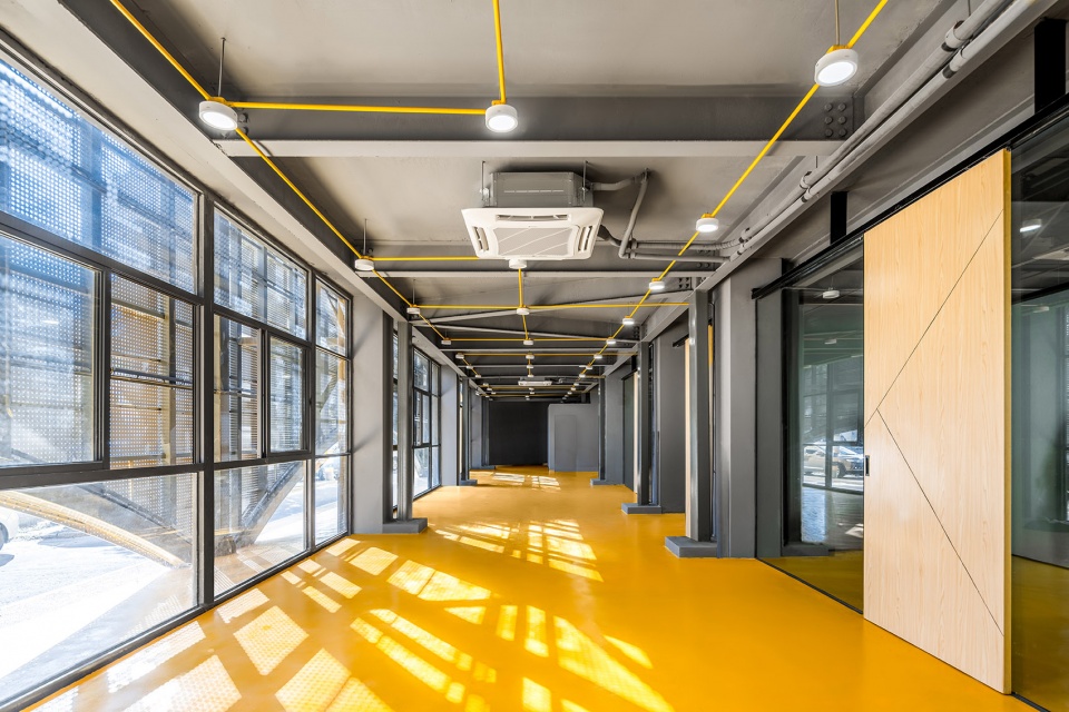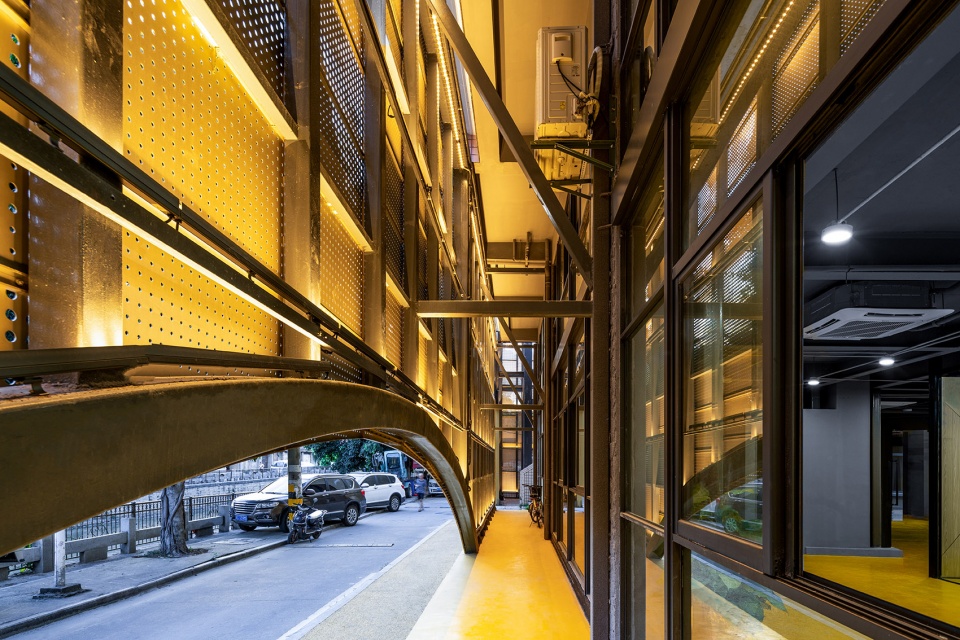 黄色沥青铺满空地,衔接了室内的黄色地坪,呼应立面的金色并明确了设计的边界。