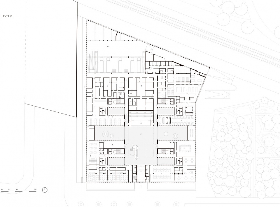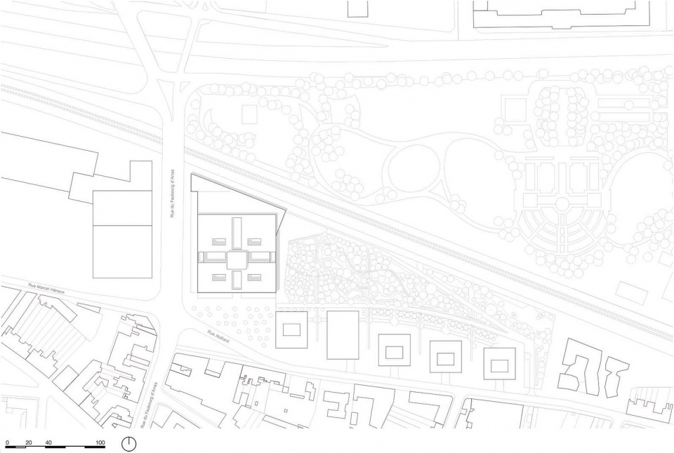 工艺贸易商会(CMA)位于前 17 世纪沃班要塞的边缘,现在被一条高速环路所取代。北面,一条铁路和里尔植物园(Jardin des Plantes de Lille)界定了基地的边界。南面,阿贝拉德街划定了一个由KAAAN Architecten 建筑事务所和 PDAA 共同设计的范围更大的总体规划区域。它包括了 CMA 商会总部大楼、五座建筑组成的未来综合体和一个公园。公园横跨场地,作为附近花园的沿伸。