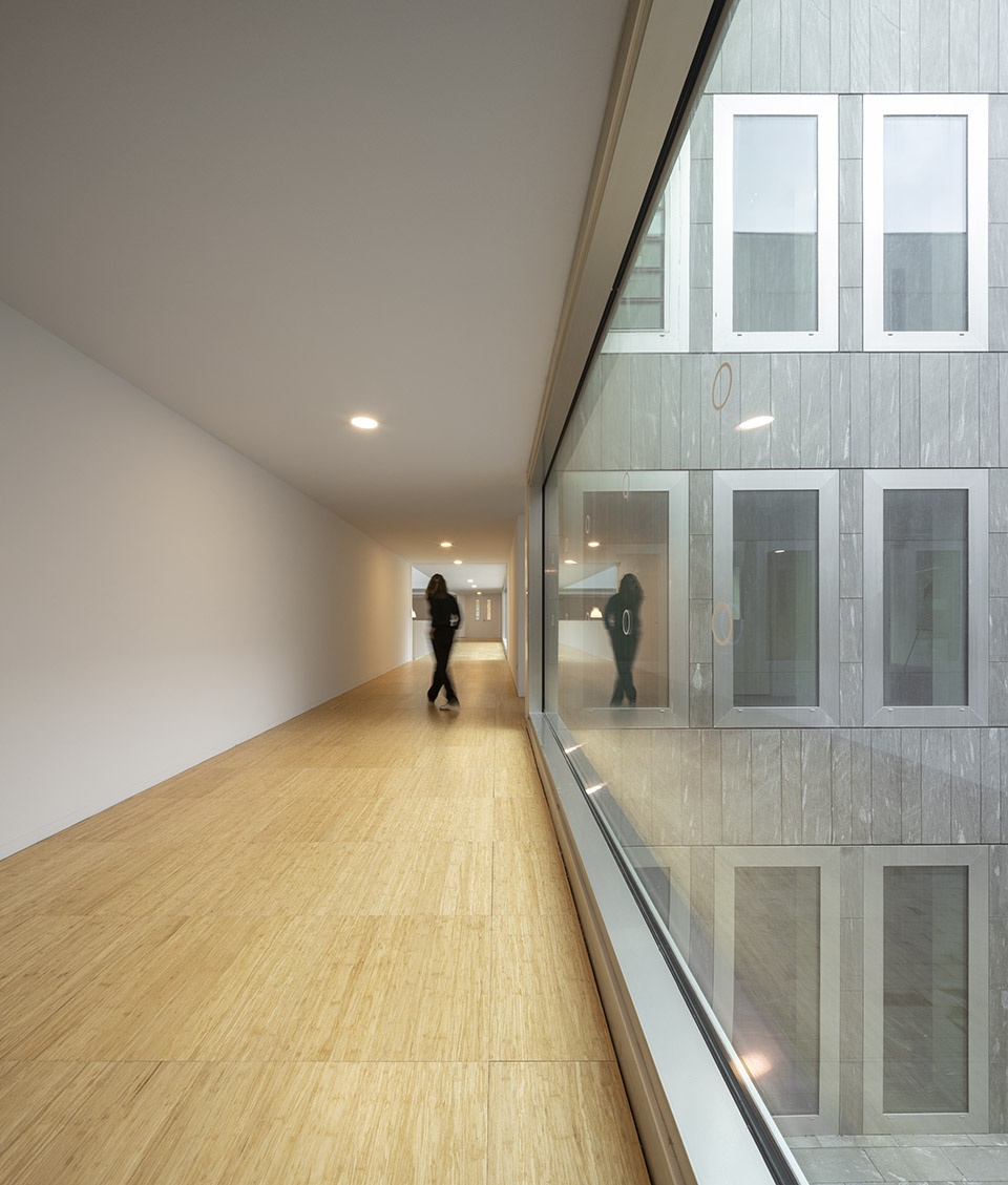 此外,天井外墙的大型抛光铝窗框设计独具匠心,包裹瓦尔斯石英岩。这是一种非常结实、紧凑和抗霜冻的瑞士石材。这种石材也被用于庭院地板和入口大厅,以强化室内外之间的联系。