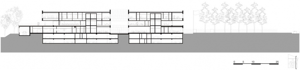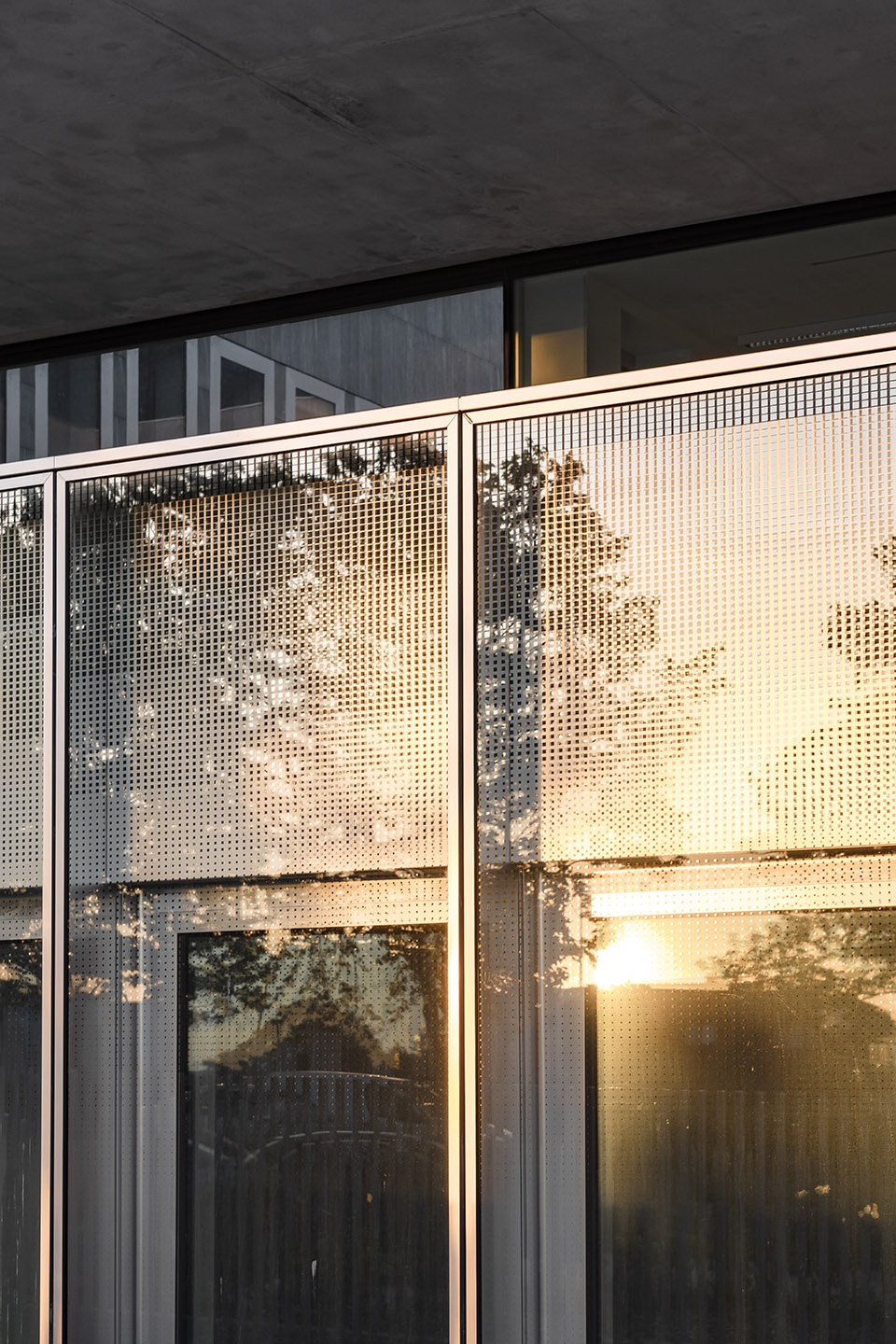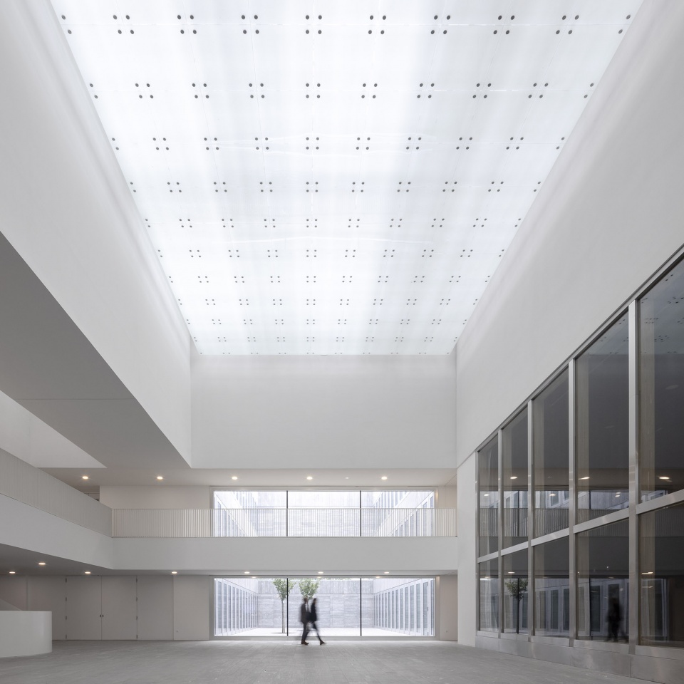 为了与城市肌理和周围景观加强联结,建筑师非常注重使用自然材料:玻璃和石材。首层和三层由模块化的双层玻璃幕墙包裹,确保了室内环控制和高质量的声学效果。每个通高模块都有一个可以打开的内部抛光铝窗和一个固定的外部玻璃面板。外部玻璃面板上渐变的反光印刷图案,使建筑融入自然的同时,在视线高度创造出一个完全透明的区域。
