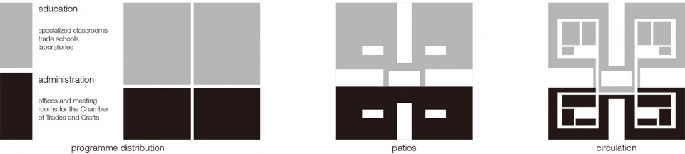 该建筑两个位于不同楼层的公共广场引人注目。位于底层的是新的工匠广场(南面),而二层北面是一个宽敞的露台。露台使项目与阿拉斯郊区街(Rue du Faubourg d’Arras)通过一座桥连接起来。两个公共入口都由一系列具有代表性的空间连接起来:南部广场、入口大厅、礼堂及其门厅,以及一个可以俯瞰北部露台的宽阔开口。此外,每个入口服务于两个主要的建筑区域:学徒培训中心和致力于手工艺事业发展的办公室。