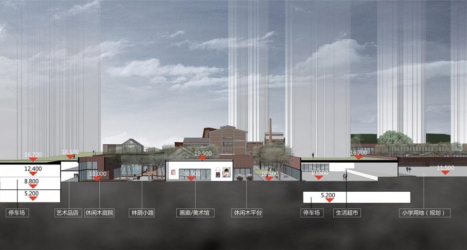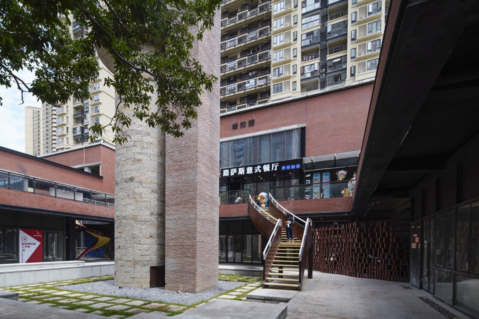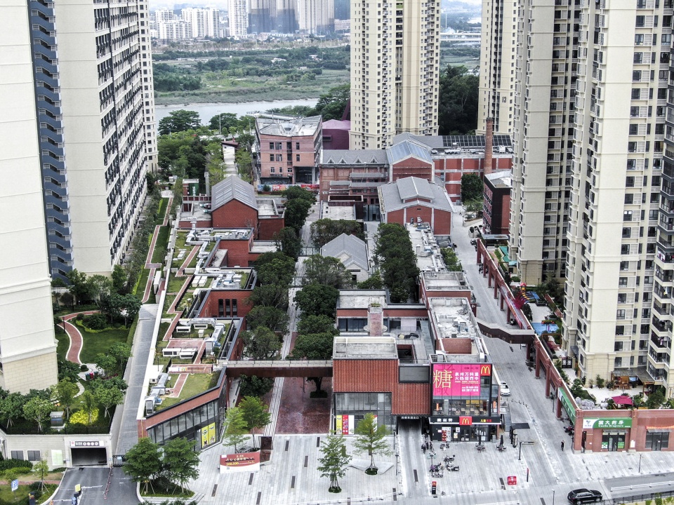 与此同时,设计师保留沿用了从前运输甘蔗(制糖原料)的廊架元素衔接弥合了滨江路与场地的巨大高差,强调了主要商业厅堂与游览线路的轴线关系,明确了主要广场空间的进入秩序,同时也解决了住区与商业区的空间衔接问题。