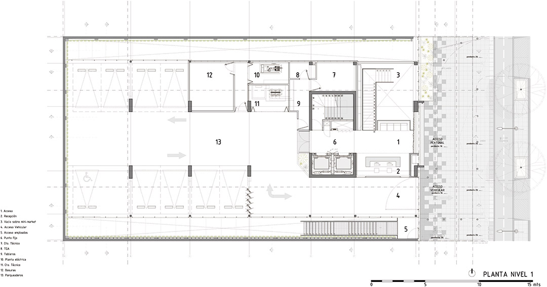车道和人行道位于同一层。从天窗投进的阳光照亮位于地下层的公共区域。