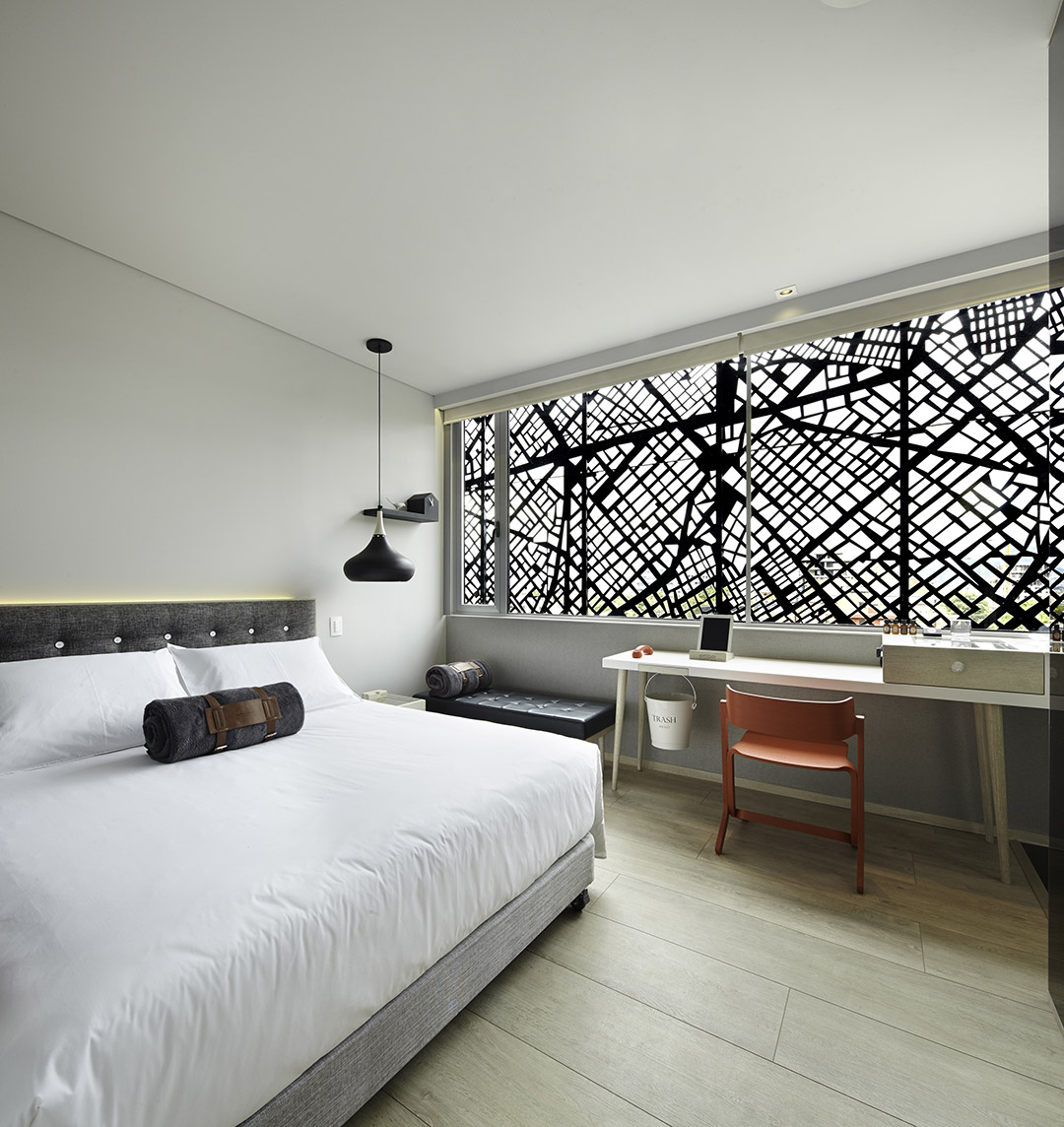 ▼酒店客房,窗外是穿孔金属表皮–其机理是抽象化的城市地图