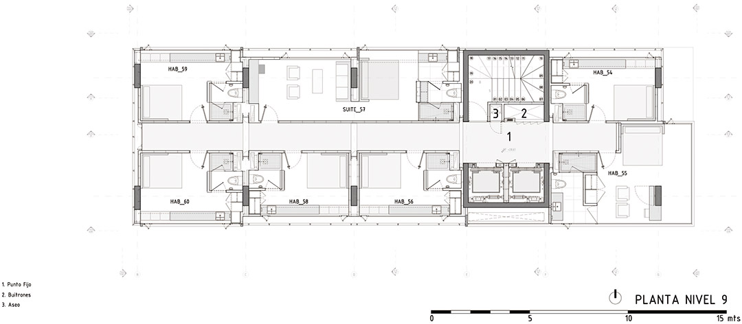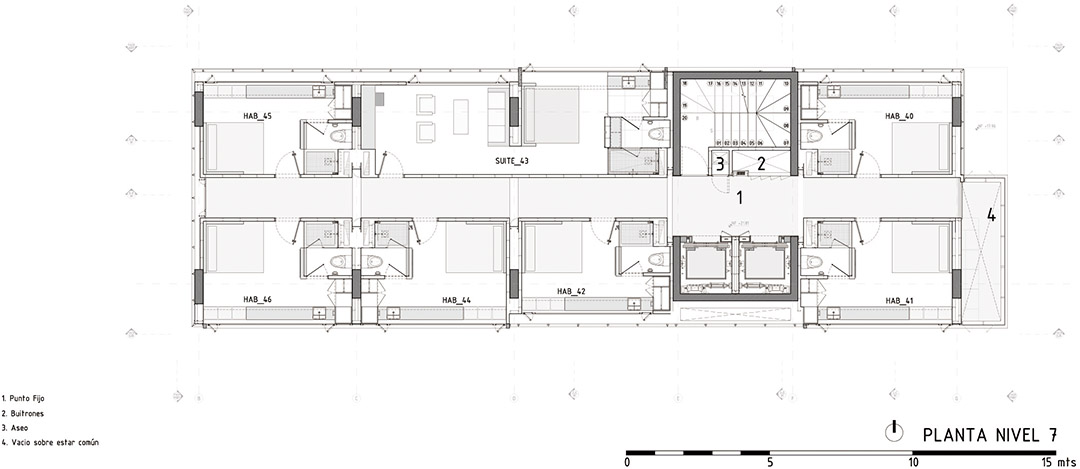 酒店层叠的小房间通过中央廊道连接起来。固定的多孔金属百叶窗、大型落地窗以及悬浮在主街道上方的窗户等三种不同类型的窗户以及与城市的视觉联系是该酒店最大的特色。部分悬浮窗户甚至被当做小房间使用。