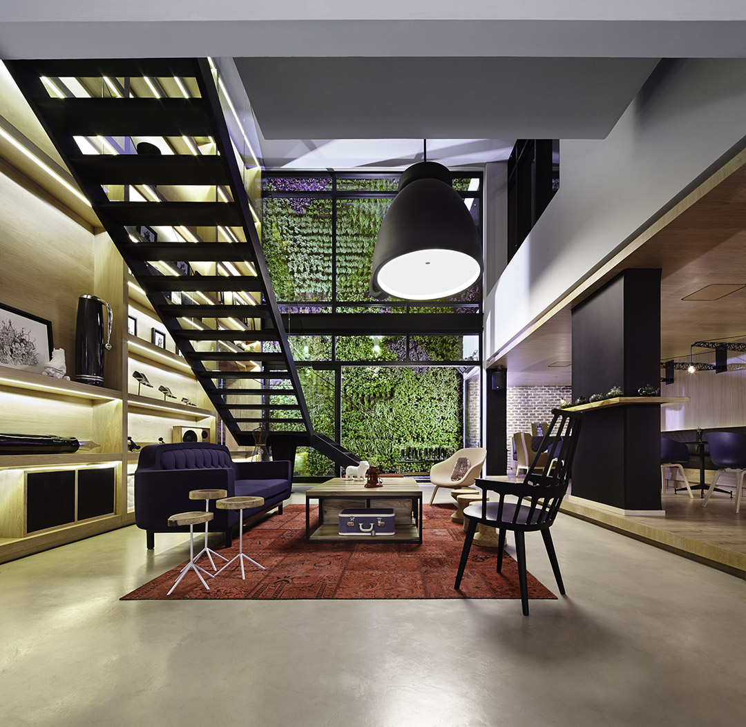 ▼酒店大堂公共空间。一面墙是垂直绿化空间。自然光从建筑与垂直绿化墙之间的缝隙天窗洒进