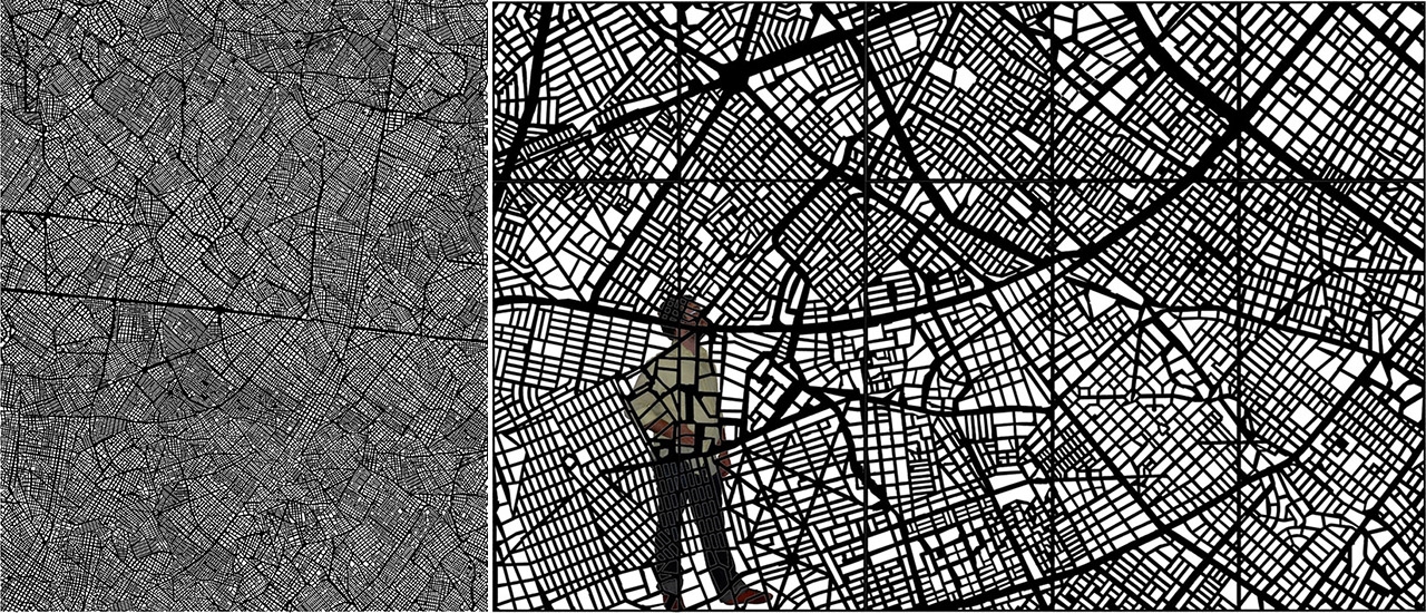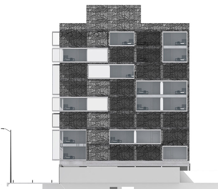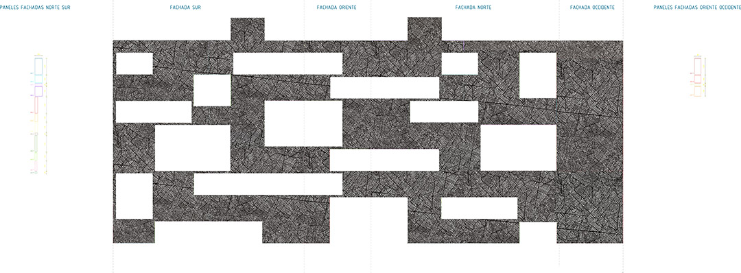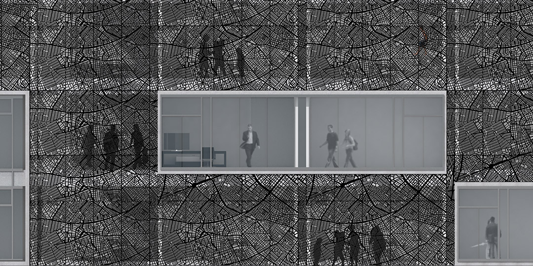 ▼将城市抽象化地图的机理运用在建筑外表皮的金属穿孔板上