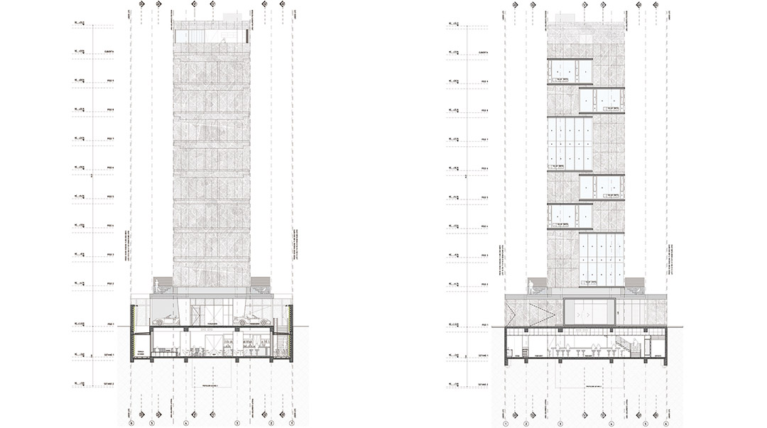 ▼(左)建筑拥有修长的体量与开放式立面(右)立面由玻璃落地窗,玻璃凸窗以及穿孔金属百页组成