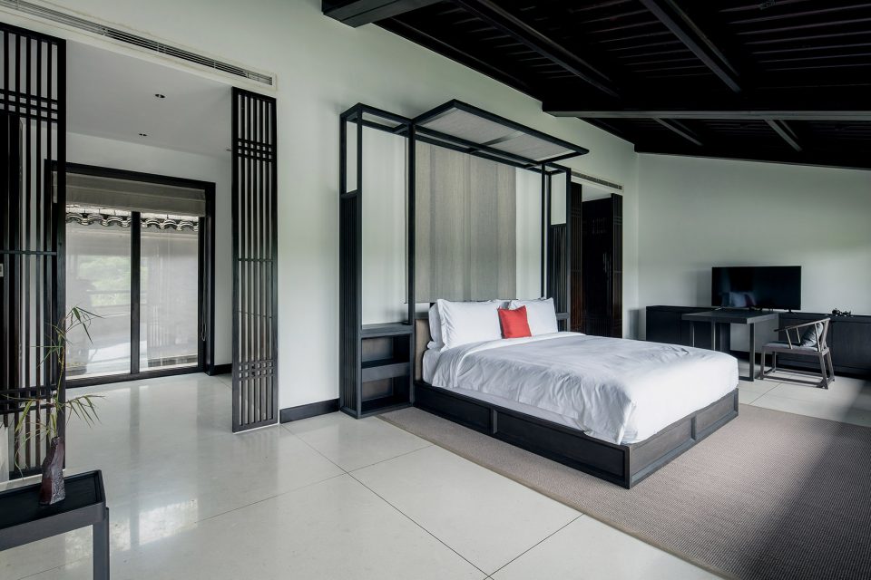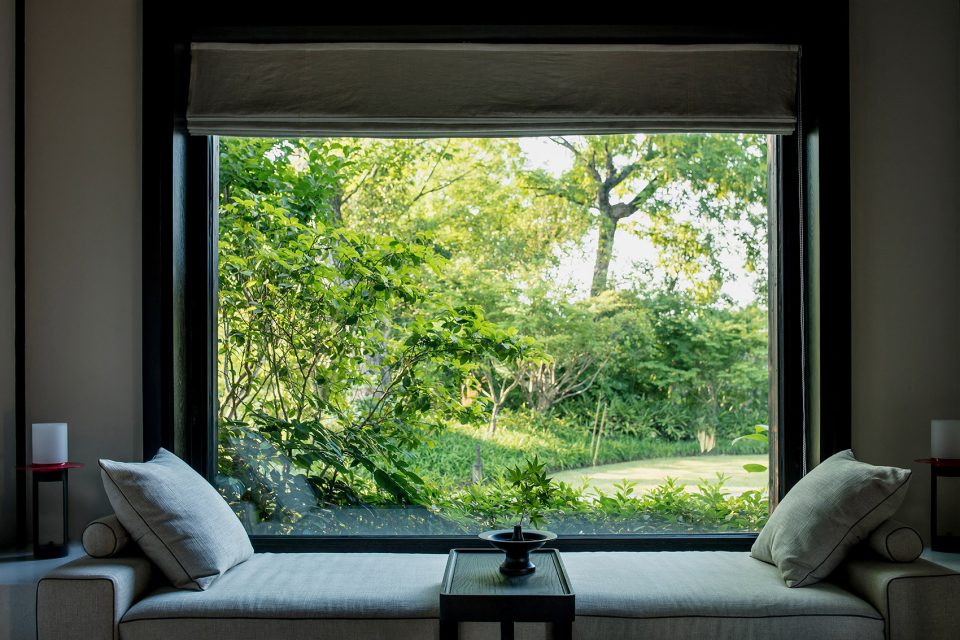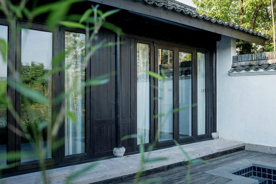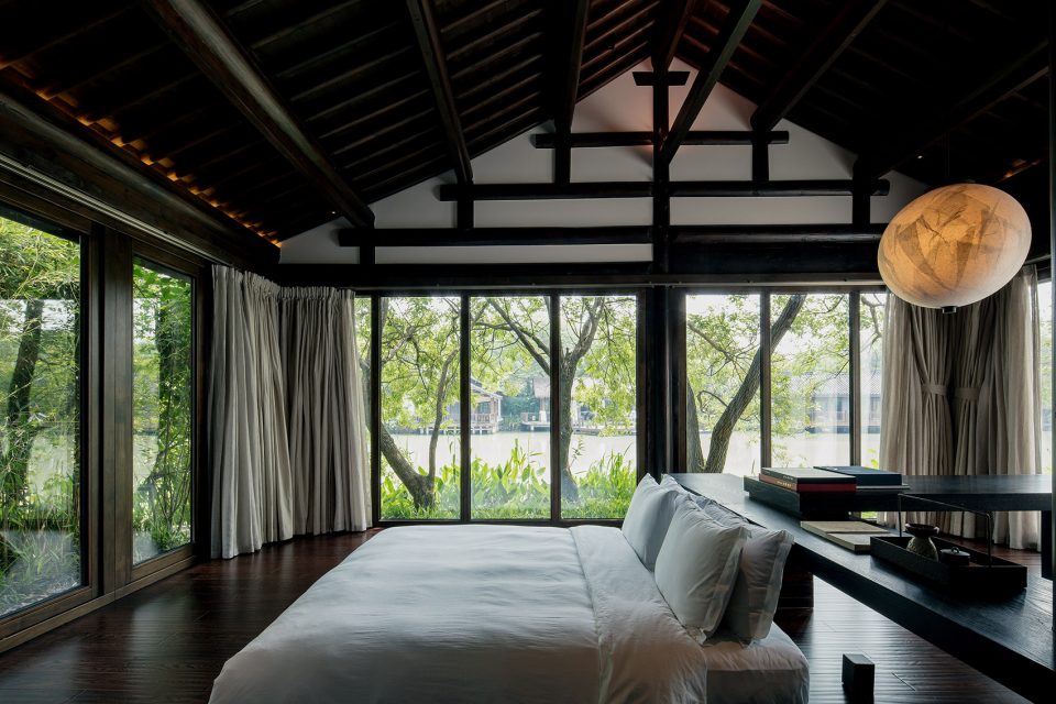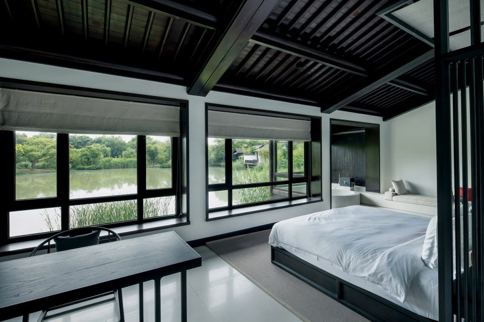 窗,成为重要的媒介。传统中式的建筑,注重隐、闭,惯以镂空的窗格采光。在张炜伦的设计视角中,当代的中式建筑,不应因循守旧,应当传递当代的居住精神,让天光水色,满盈室内,无处不在。她在设计中,以大面积开窗面打破了建筑的闭合感。框架结构与明朗玻璃窗,将室外的水云天,与室内闲逸之心,融为一体。户外露台、汤池的无边界设计,让歇息的居者与西溪静逸水域更为相融。室内空间的序列,不设实体隔断,仅透过装饰自然过渡。将床榻、卧具、浴池均面向风景,带来深度的沉浸体验。晨起、闲坐、品茗、沐浴…每一个瞬间,都在风景簇拥与环抱大景小景之间。