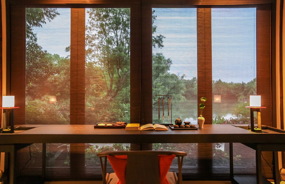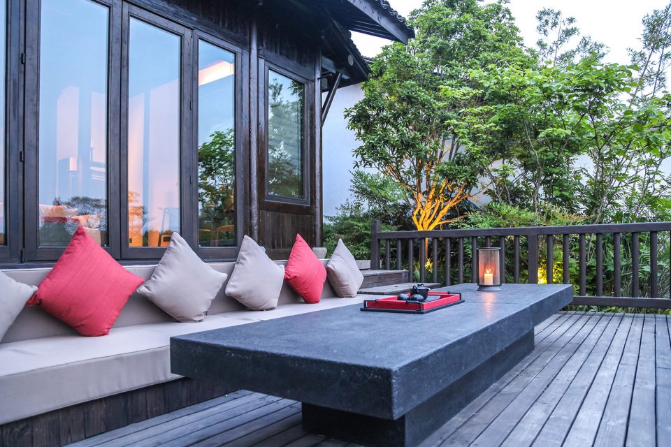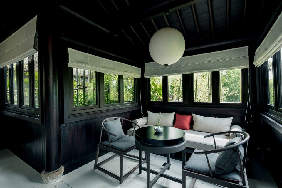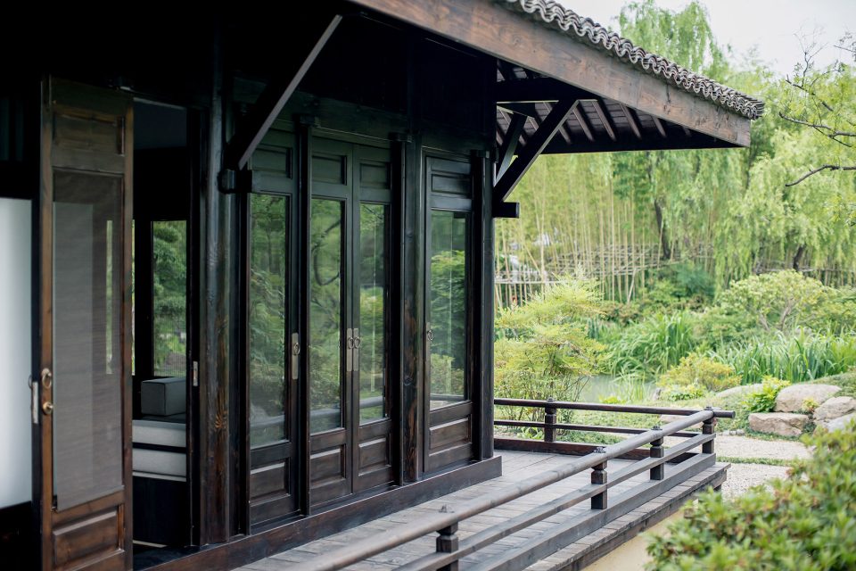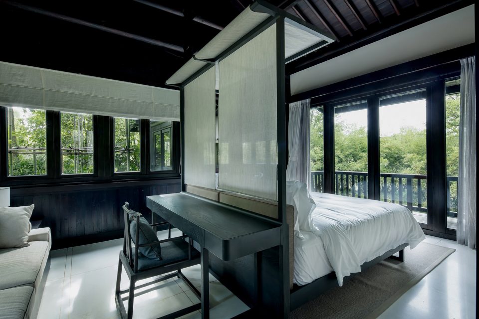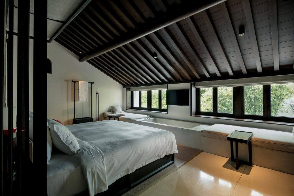 窗,成为重要的媒介。传统中式的建筑,注重隐、闭,惯以镂空的窗格采光。在张炜伦的设计视角中,当代的中式建筑,不应因循守旧,应当传递当代的居住精神,让天光水色,满盈室内,无处不在。她在设计中,以大面积开窗面打破了建筑的闭合感。框架结构与明朗玻璃窗,将室外的水云天,与室内闲逸之心,融为一体。户外露台、汤池的无边界设计,让歇息的居者与西溪静逸水域更为相融。室内空间的序列,不设实体隔断,仅透过装饰自然过渡。将床榻、卧具、浴池均面向风景,带来深度的沉浸体验。晨起、闲坐、品茗、沐浴…每一个瞬间,都在风景簇拥与环抱大景小景之间。