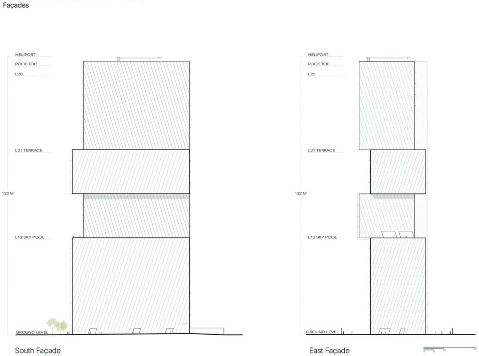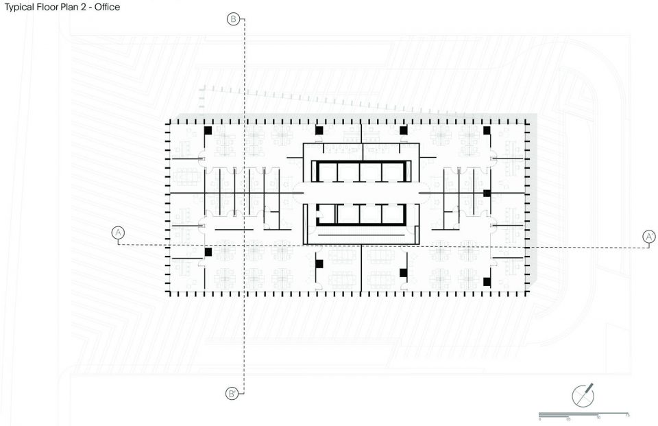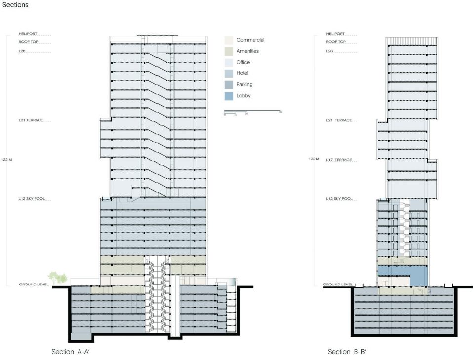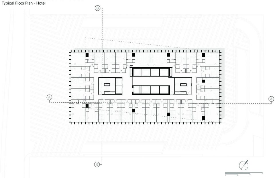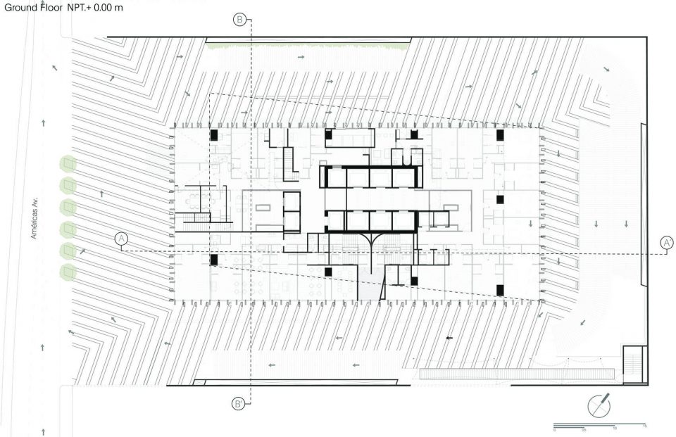 建筑底层是一个广场,一个大型的公共空间,为建筑周边各种交通功能提供服务。建筑内部的核心筒中共有三组电梯服务于酒店、办公空间、停车场和后勤工作。车辆和行人入口设在一个有着导向性铺装和垂直绿化的空间。天然石灰石不同的颜色组成了铺装的主要纹理,这个在地面上随机的组合,延续了建筑外表皮的机理。
