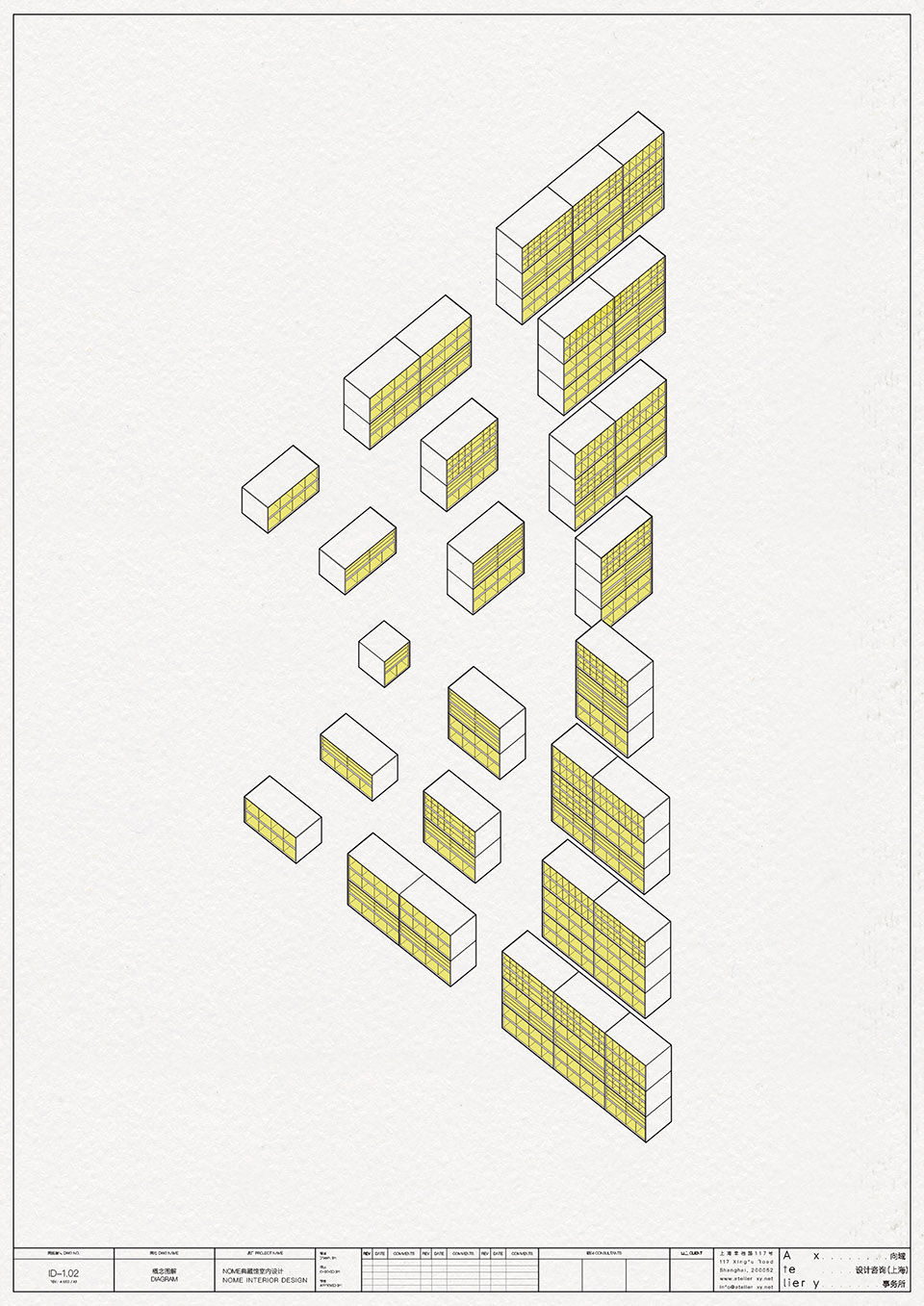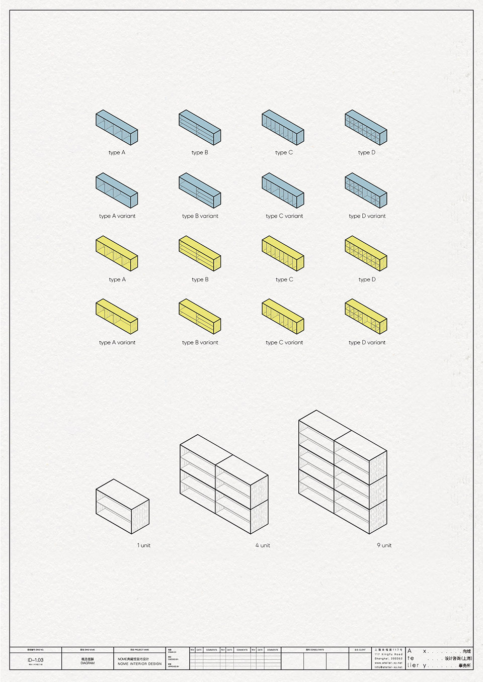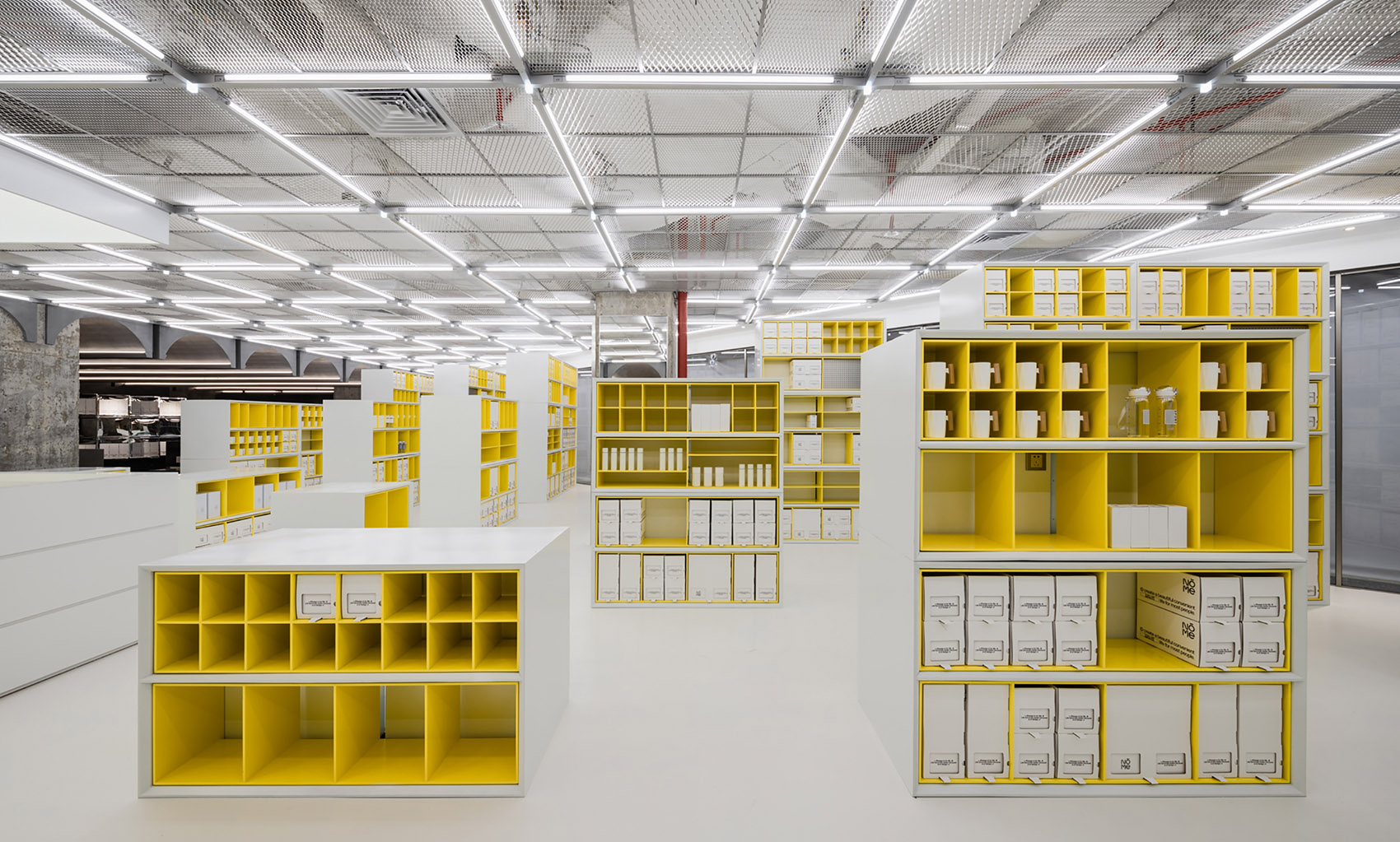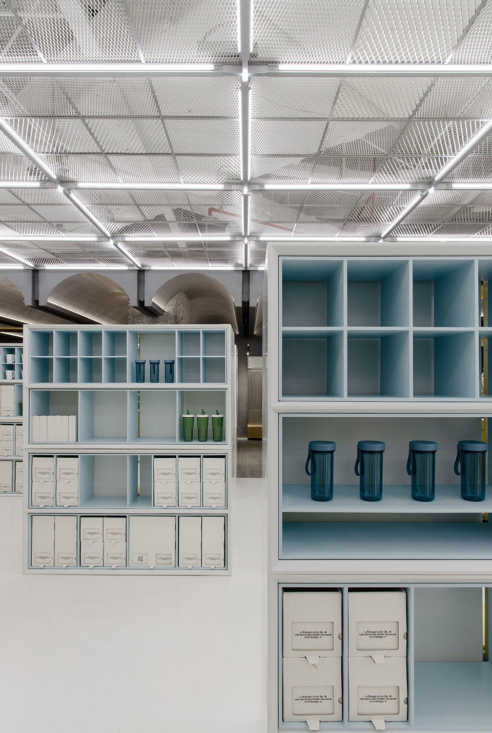 货柜⾼度呈阶梯状由⾼向低进⾏矩阵式排列,它们整⻬坐落在既定的轴线上,形成有趣的秩序。更有趣的是货柜的两⾯被分别设计成⻩⾊和蓝⾊。客⼈⾏⾛于店铺,因为观察⻆度的不同,店铺道具呈现出截然不同的颜⾊。空间的韵律由此产⽣。如何将种类繁多、数以万计的产品井然有序地进⾏陈列和仓储是在这个项⽬中设计师⾯临最⼤的难题。需要被重点陈列的产品被放置于货柜的视线⻩⾦区,⽽仓储的功能则被安放在客⼈不容易够得到的货柜最⾼处和最底部。