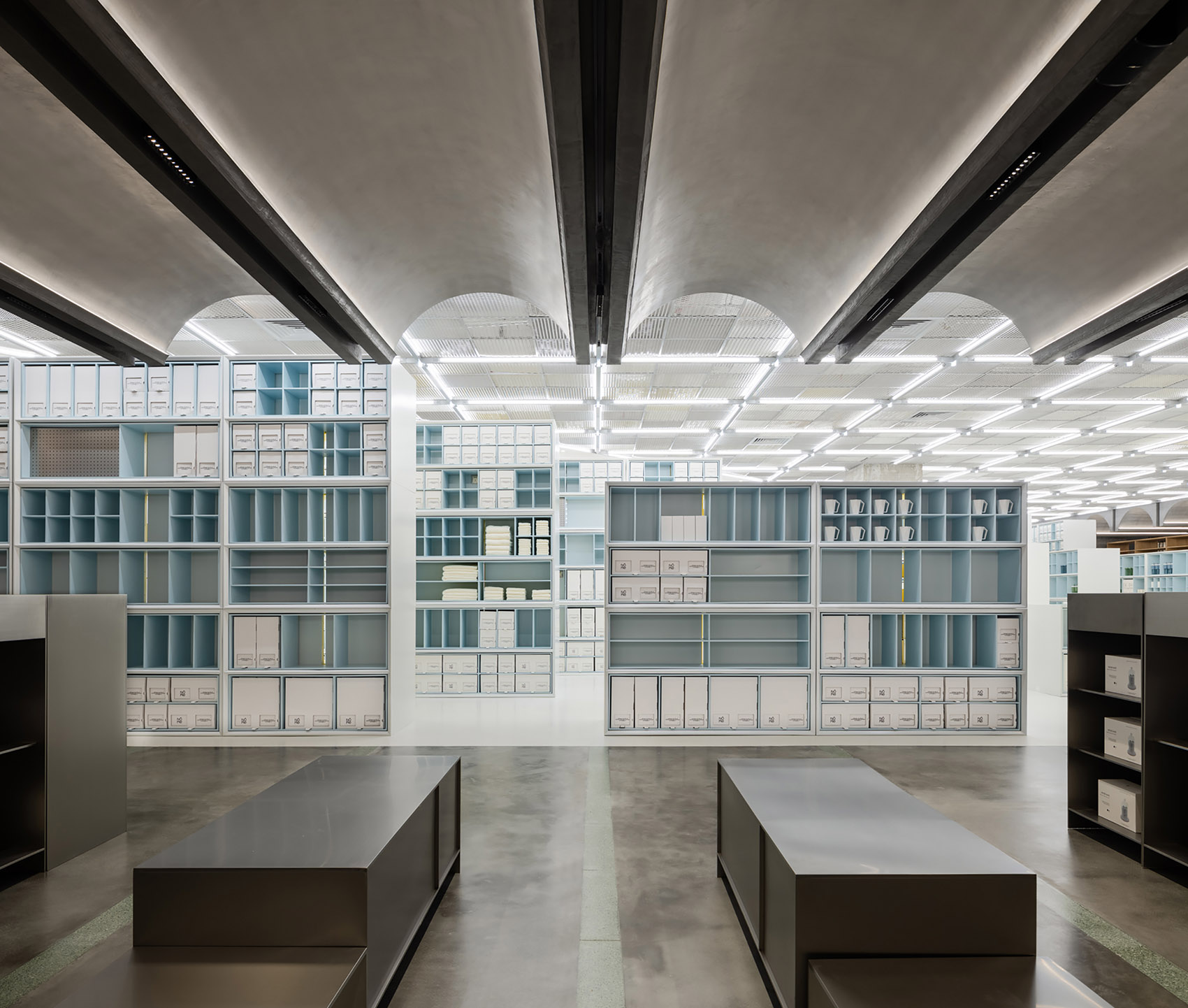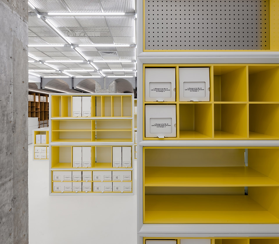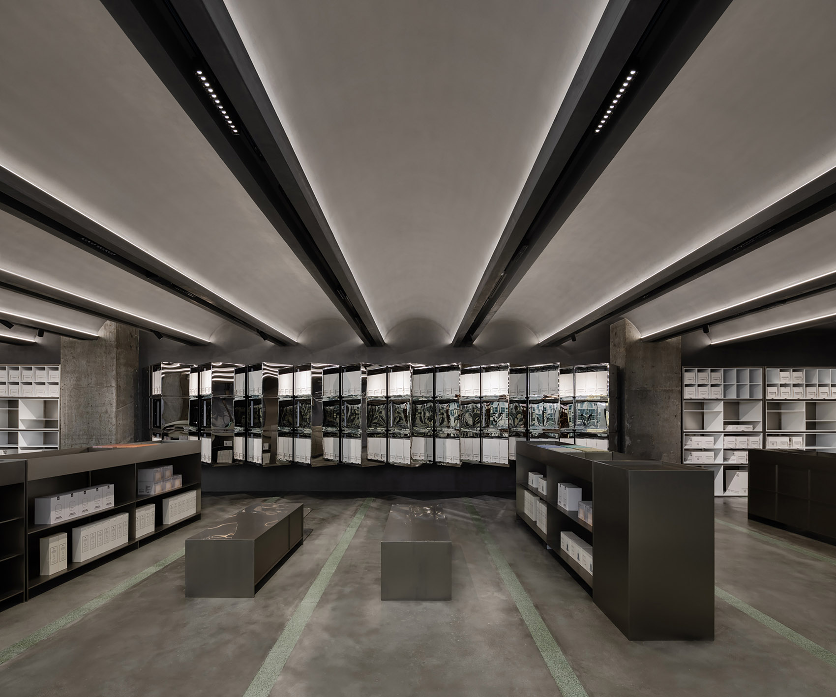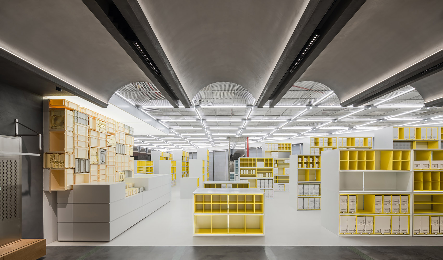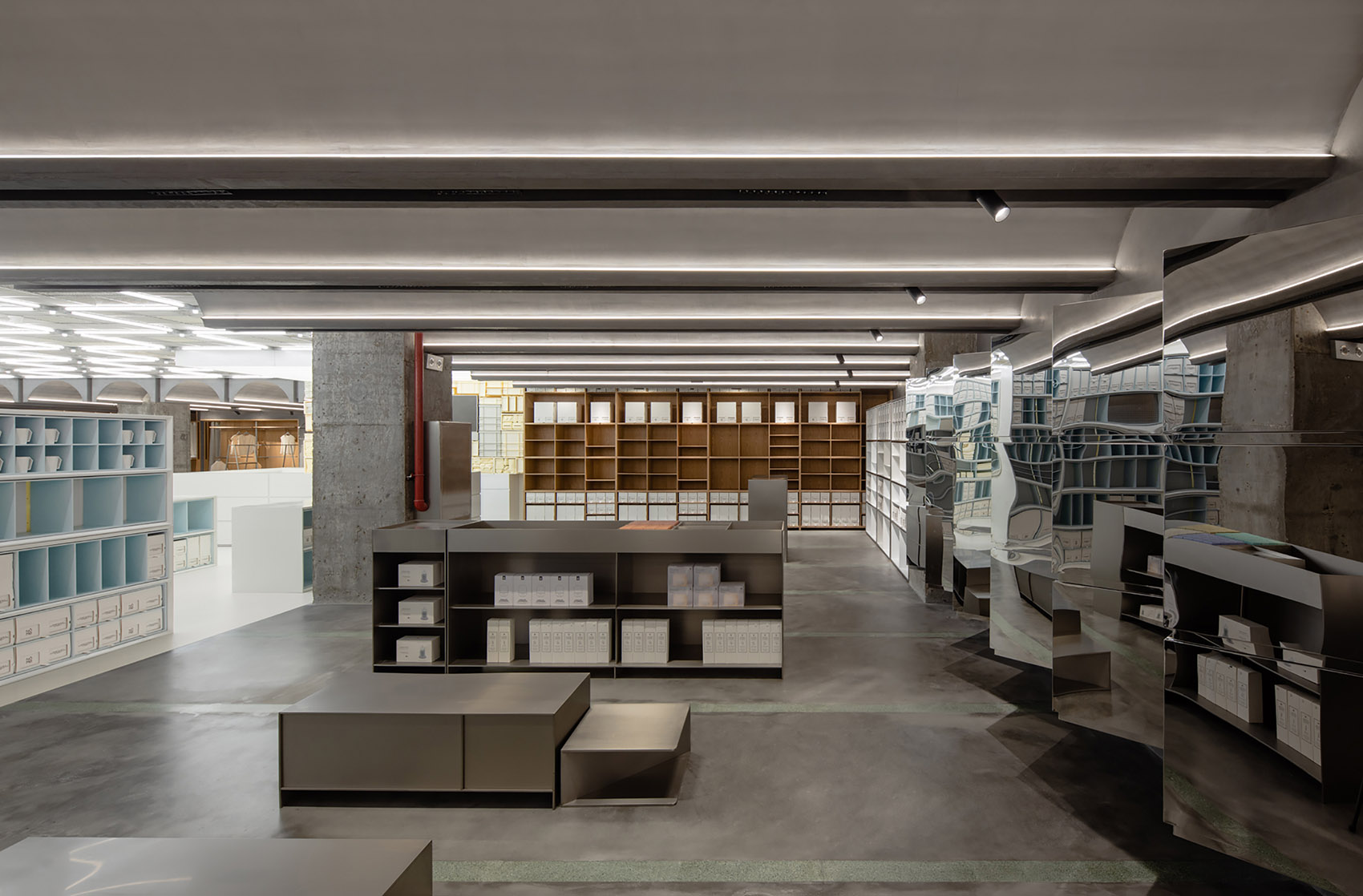 “传统的典藏馆是专业机构或个⼈⽤于记录⽂件、藏品收藏,⼤多⽤于科研或⽂化传播。”当⼈们谈起典藏馆,最明显的视觉标志便是极具规模的整⻬货架。设计师提取相关视觉元素与建筑学理论结合,打造符合NOME⽓质的空间。将零售空间视为archive, 其藏品也从原来的记录和收藏功能转换为陈列储藏极具设计感的商品。