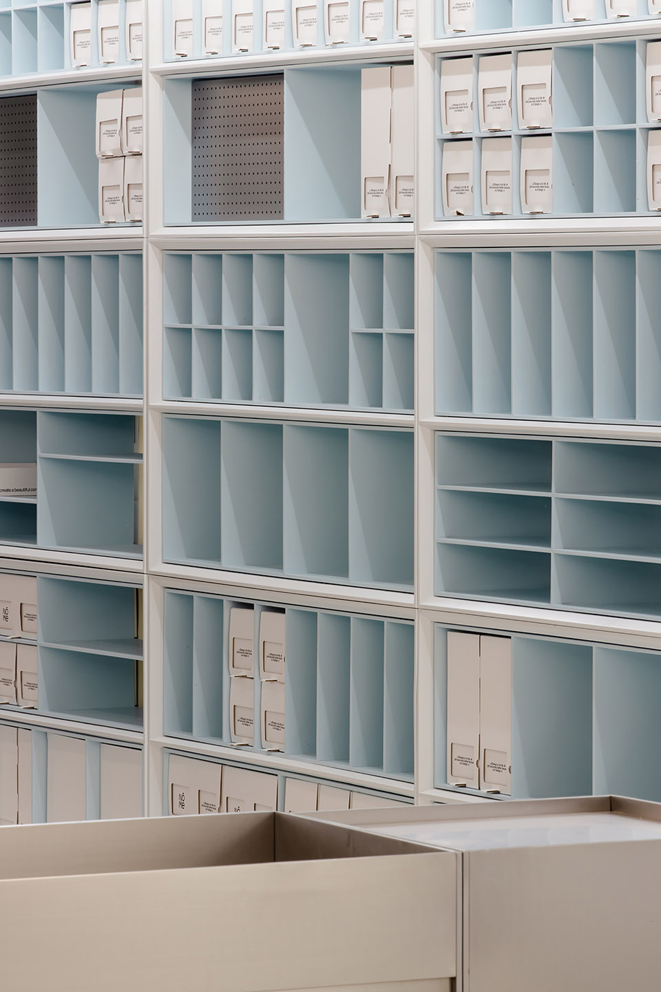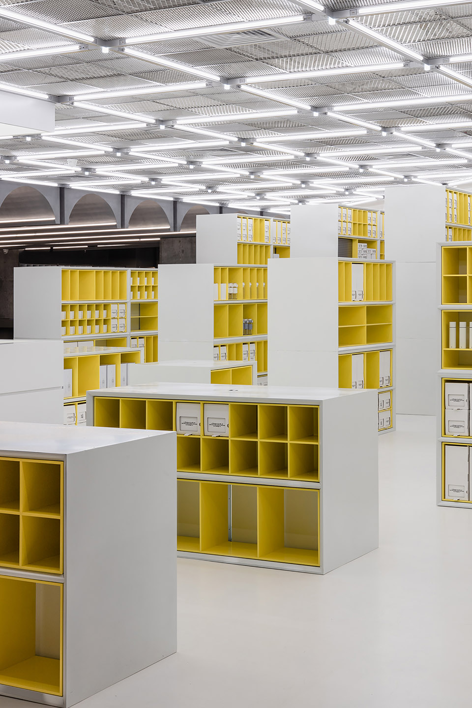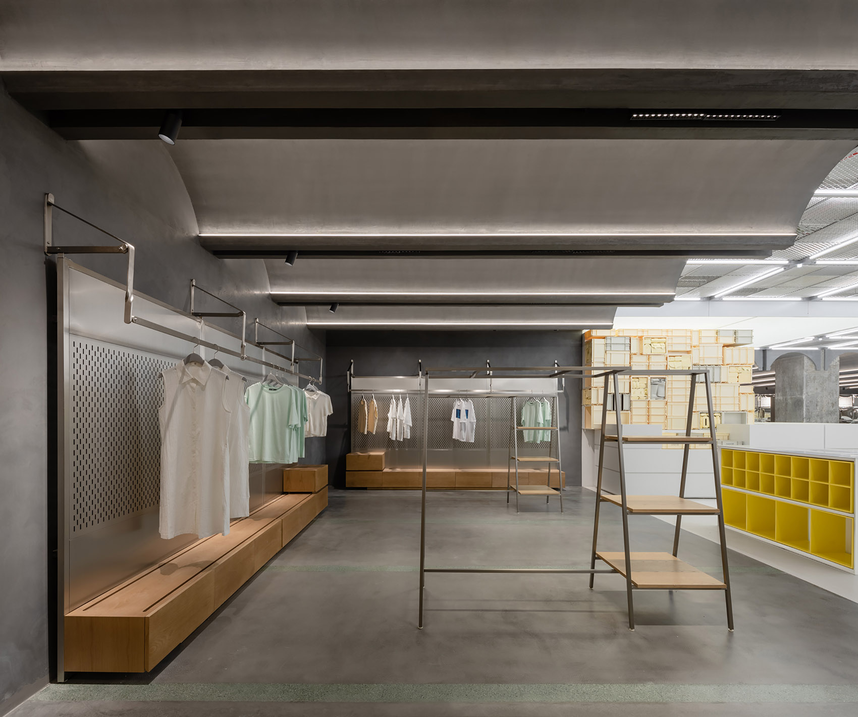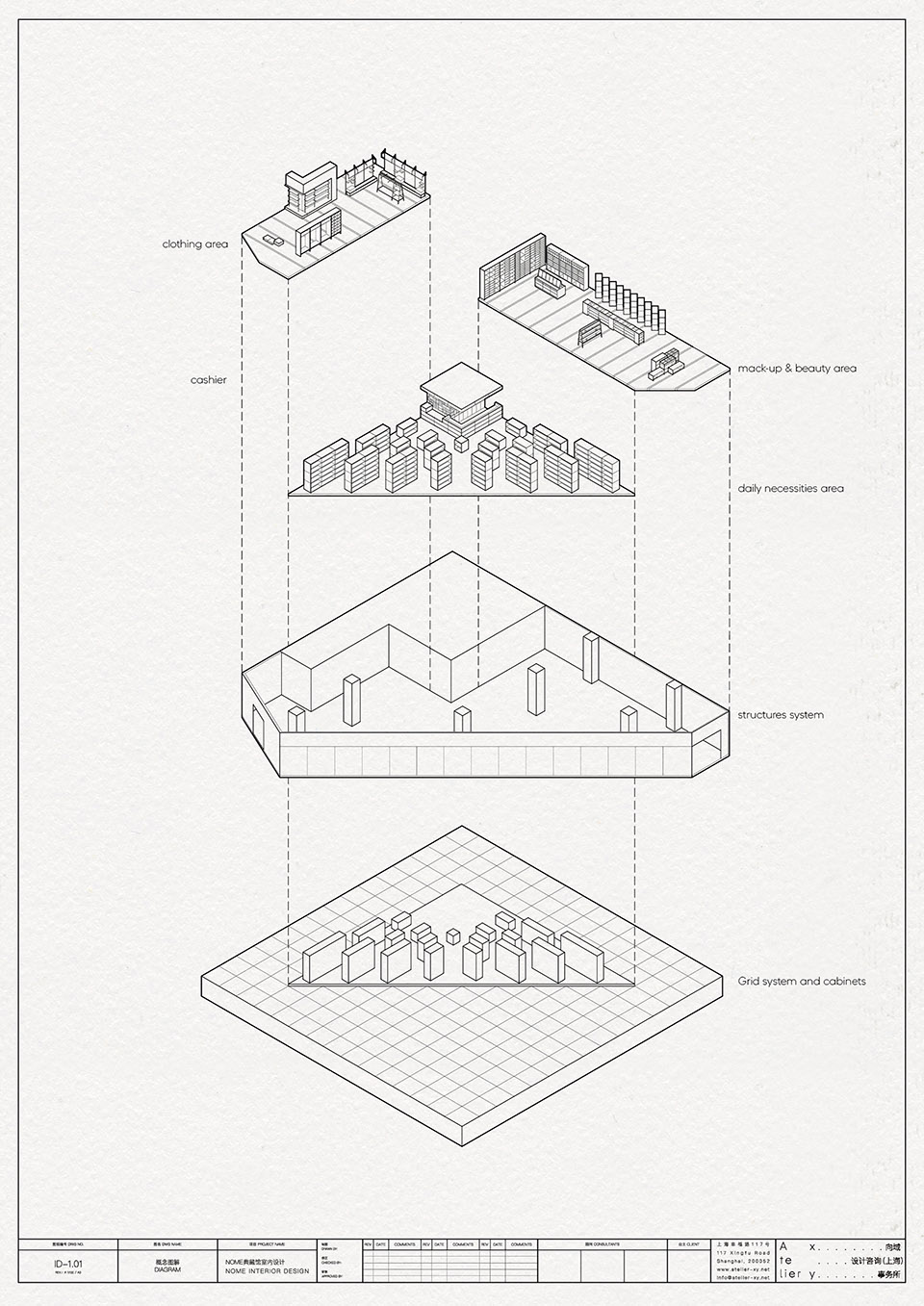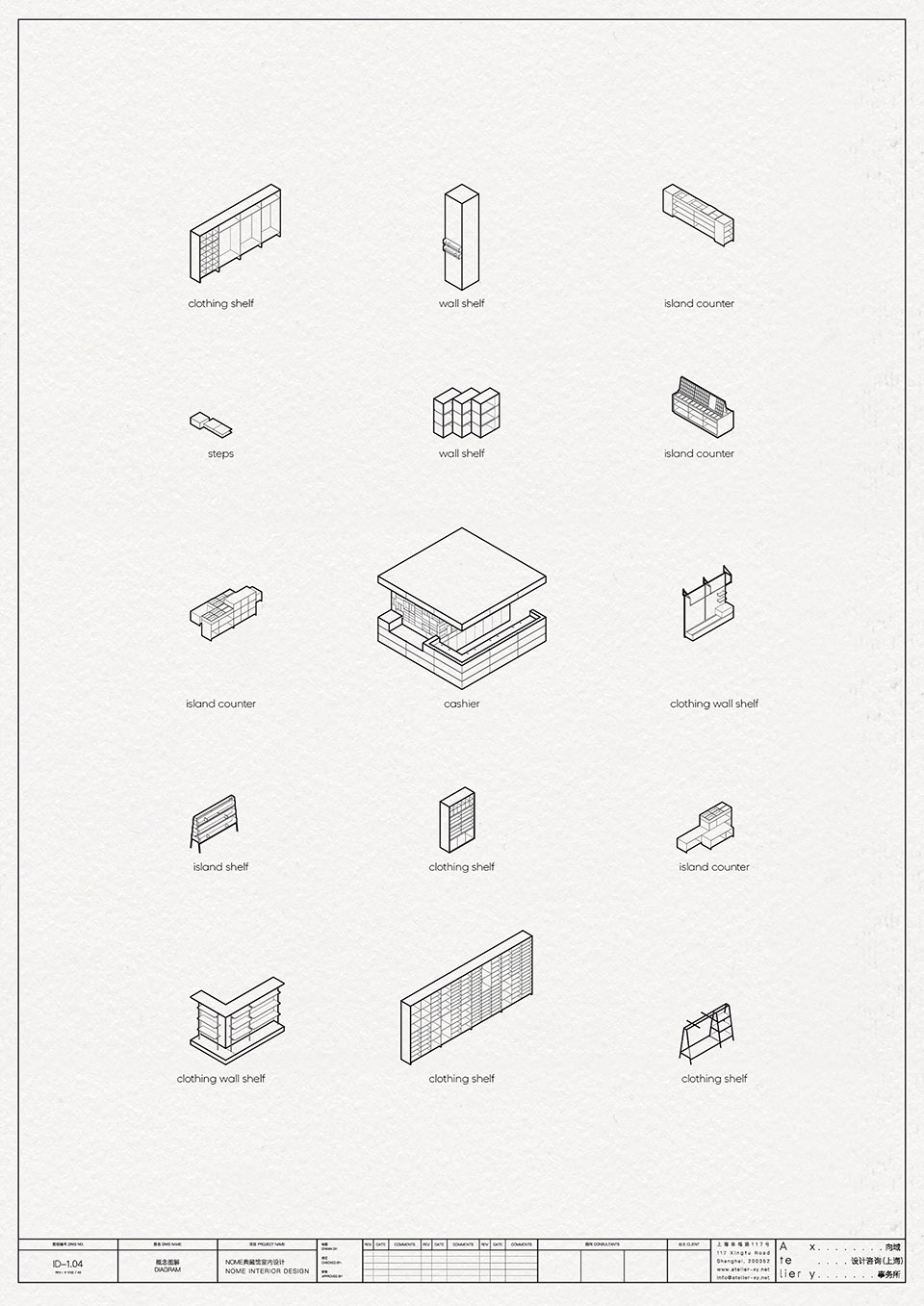 “传统的典藏馆是专业机构或个⼈⽤于记录⽂件、藏品收藏,⼤多⽤于科研或⽂化传播。”当⼈们谈起典藏馆,最明显的视觉标志便是极具规模的整⻬货架。设计师提取相关视觉元素与建筑学理论结合,打造符合NOME⽓质的空间。将零售空间视为archive, 其藏品也从原来的记录和收藏功能转换为陈列储藏极具设计感的商品。