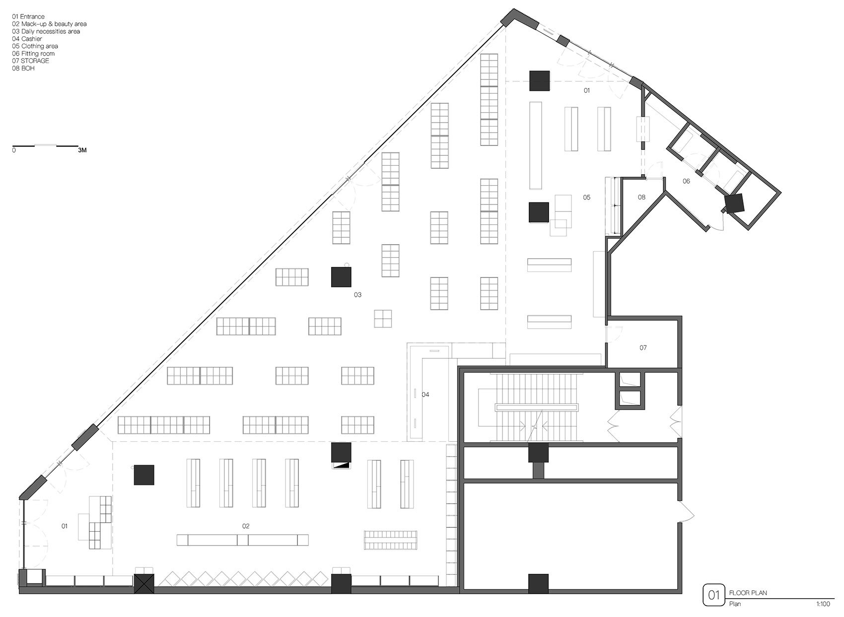 三⻆形的中央区是整个设计的核⼼,并将店铺划分成了:中央区、服装区和美妆区。⼤体量的货架根据轴线的划分从外向内、由⾼到低依次递减排列,不论从哪⼀个⻆度观看都呈现出阶梯状的秩序感。当顾客穿梭于货架之间,会因为货架的排列流线⾃然⽽然地⾛向收银台。