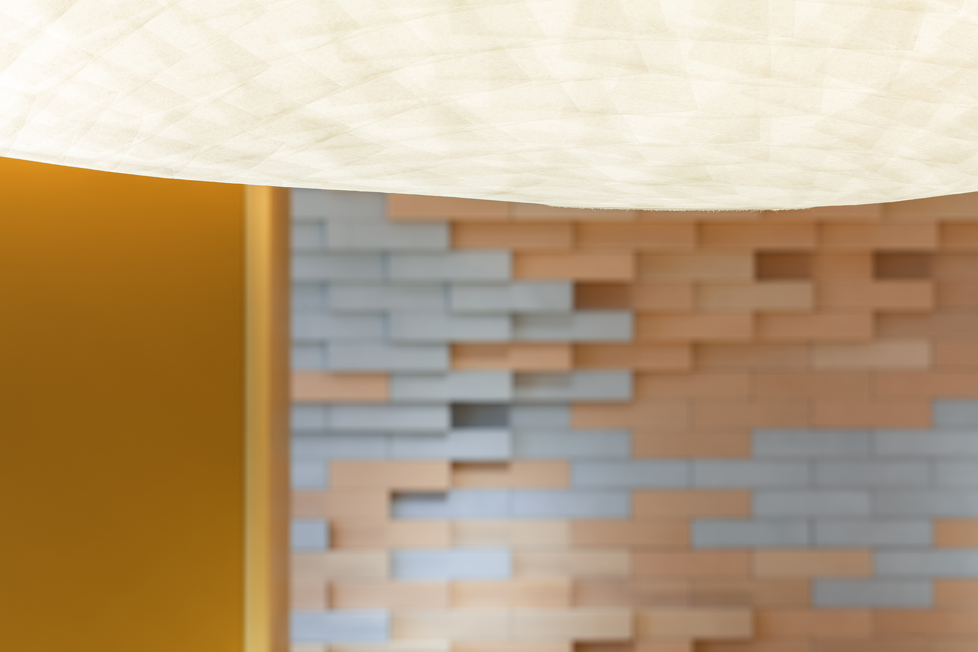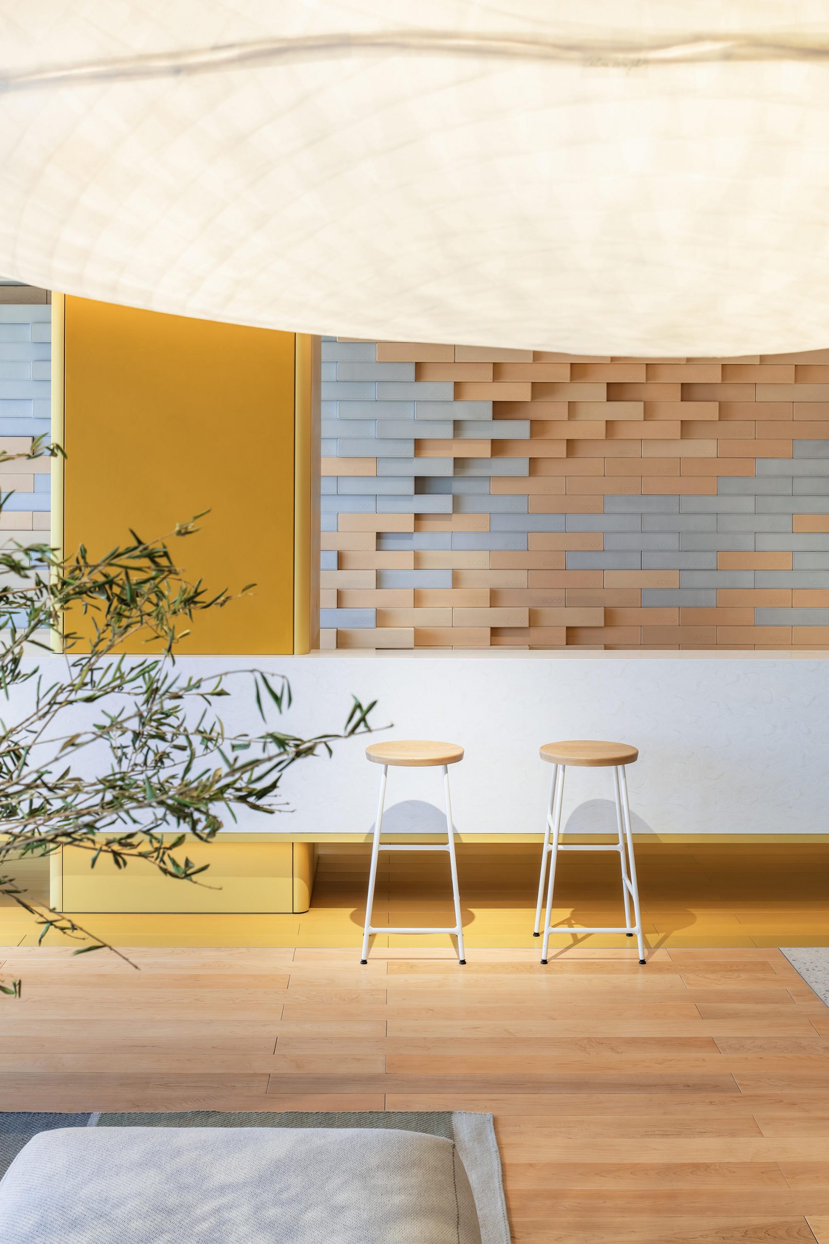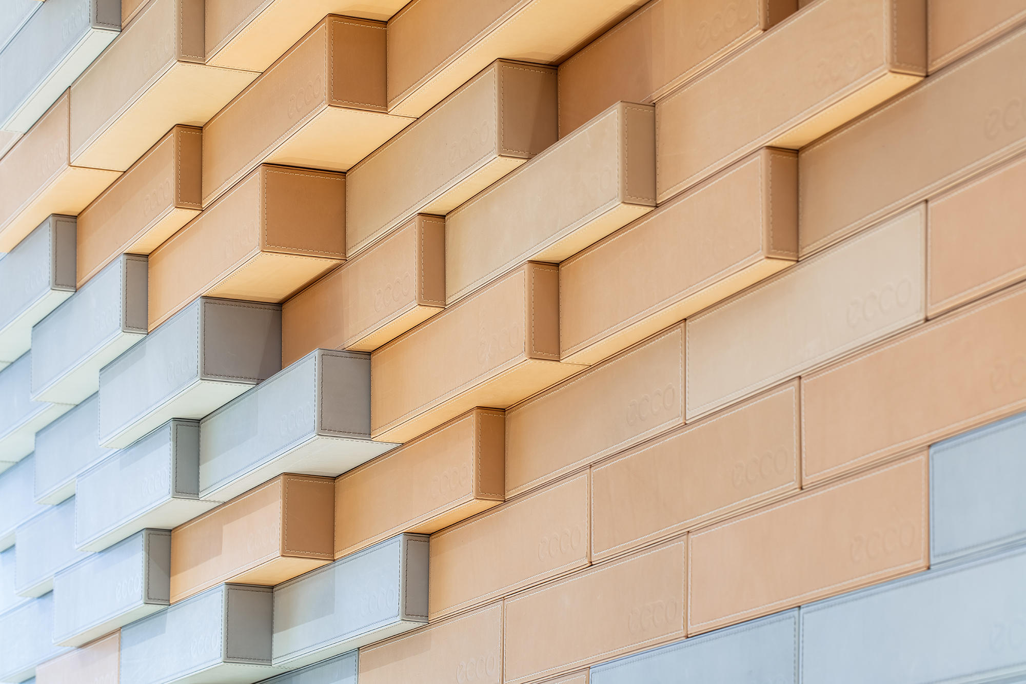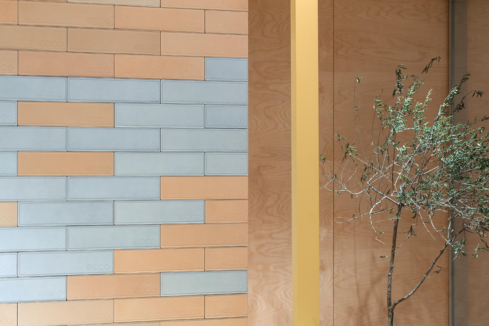 ECCO品牌的标识墙以纯粹的白色与暗光呈现,独立放置于空间一侧。设计师提炼西安斑驳古老的有形文化遗产——城墙,同时辅以ECCO精神内含的“皮革创新”,为接待区打造一面混合不同颜色的皮砖墙,以不同的颜色的皮砖对应皮料制作的不同阶段,同时和西安城墙的历史变迁联系。