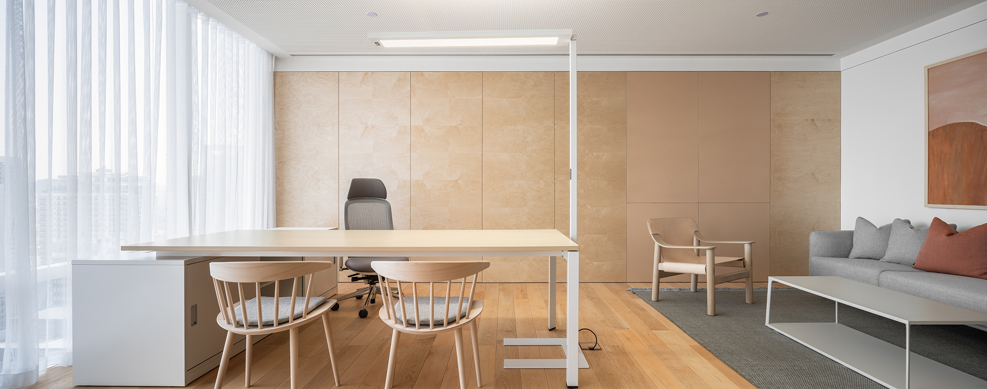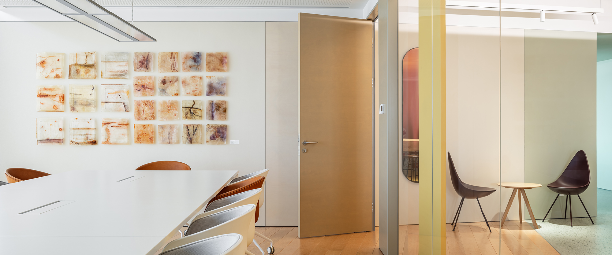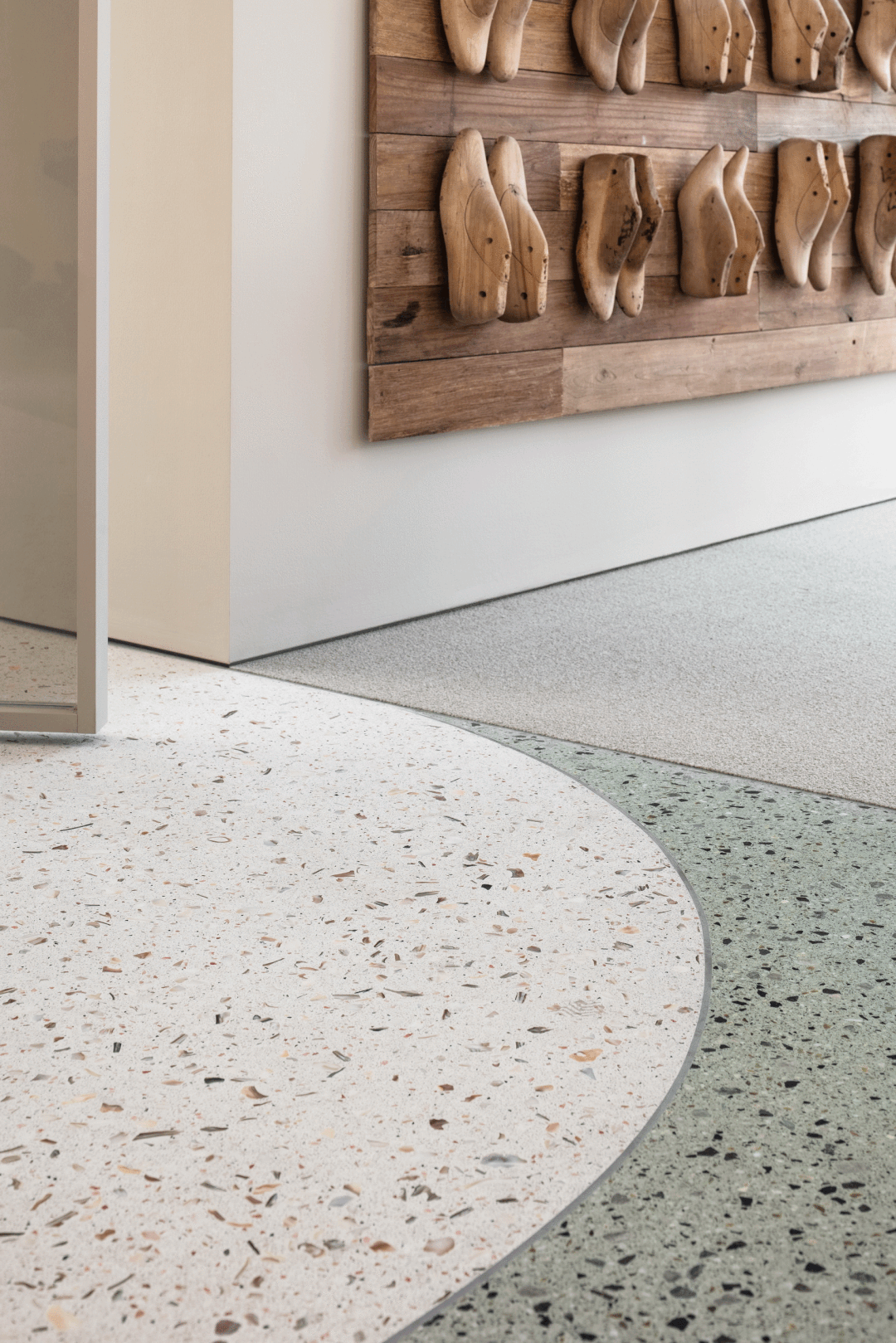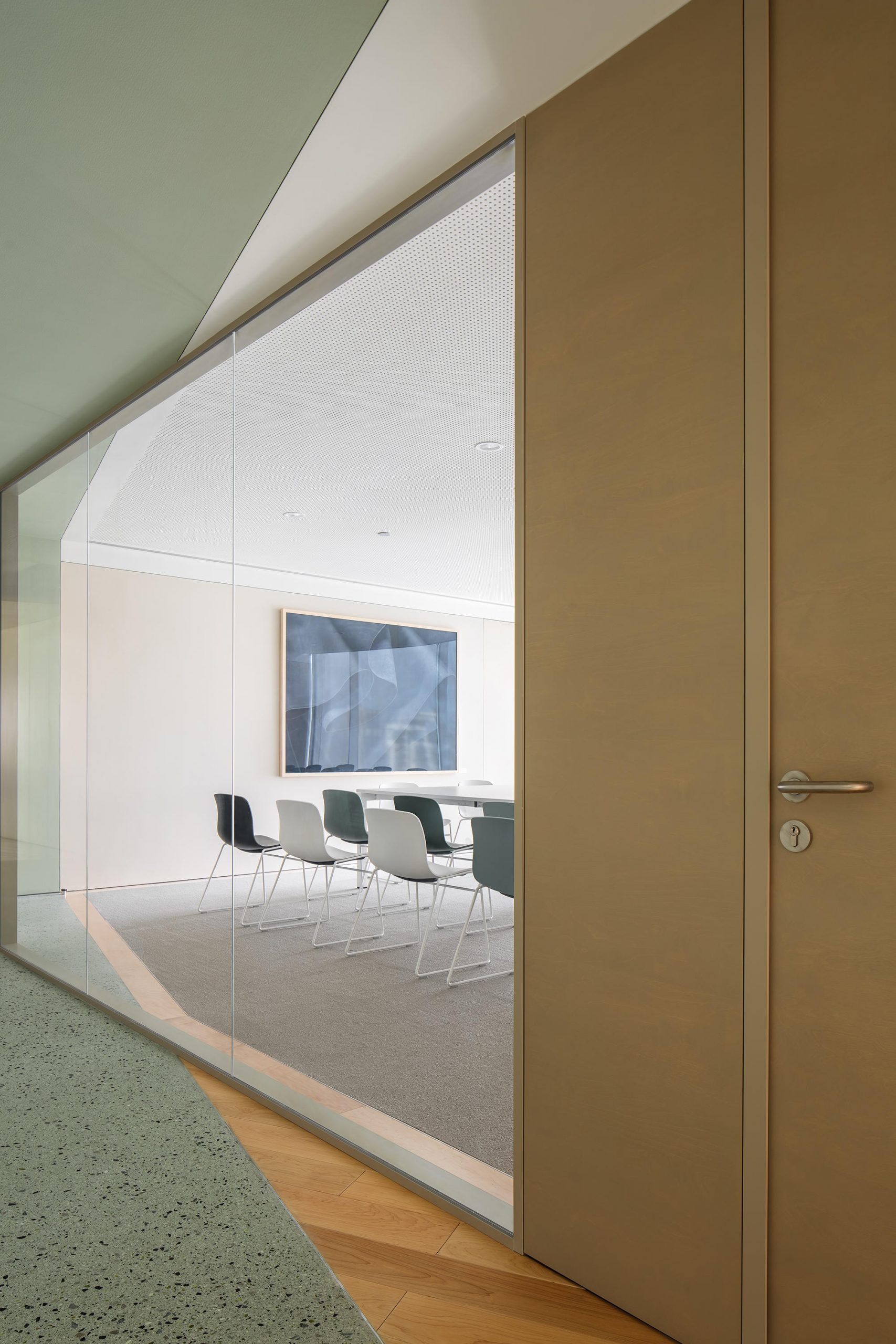 空间主材:水磨石、地毯、木地板、穿孔石膏板、涂料、毛毡、木材、皮革、玻璃