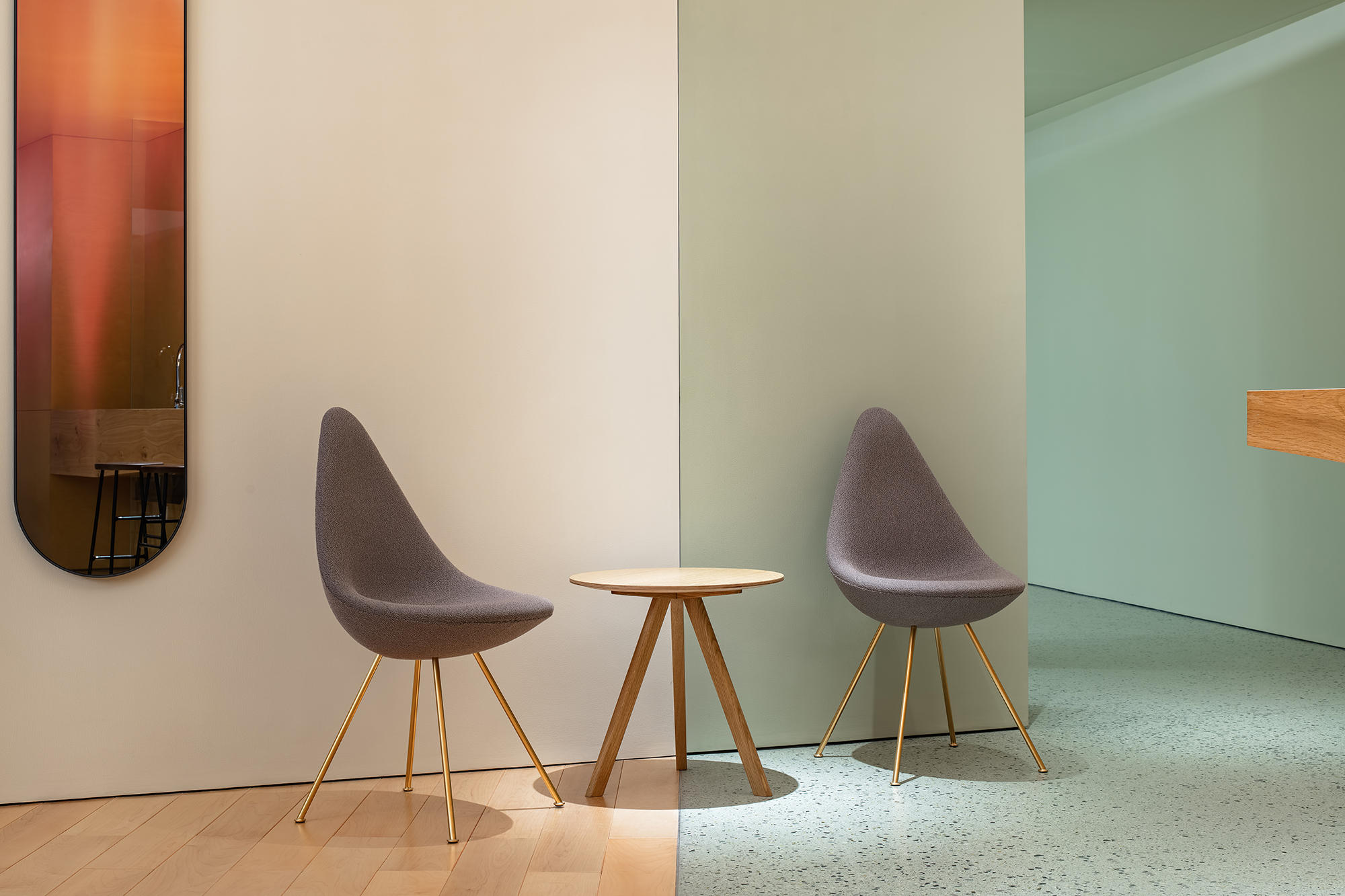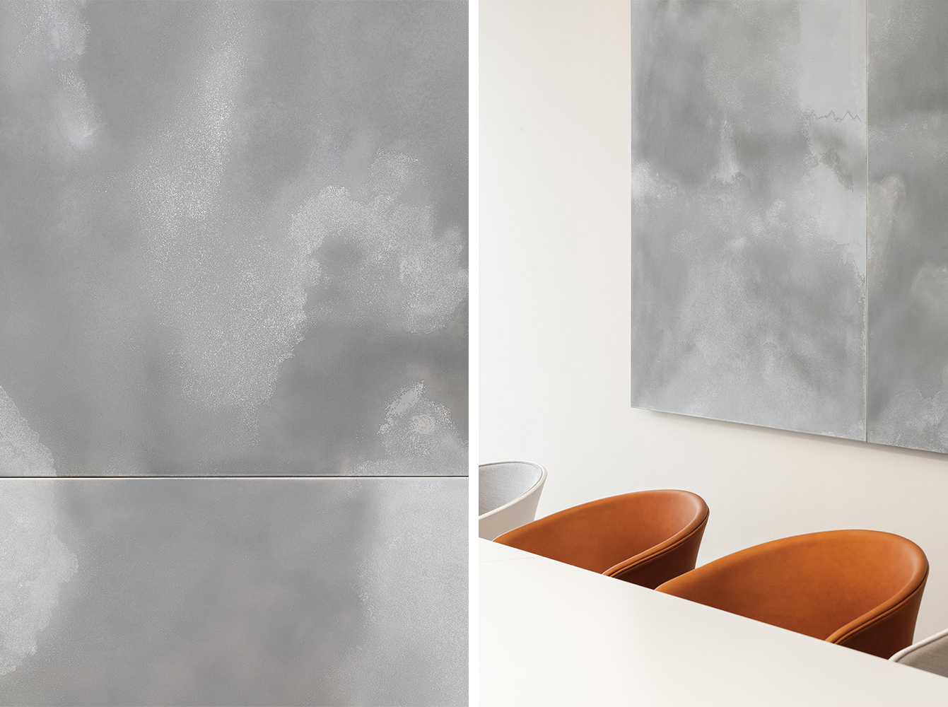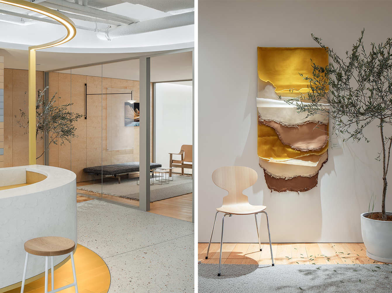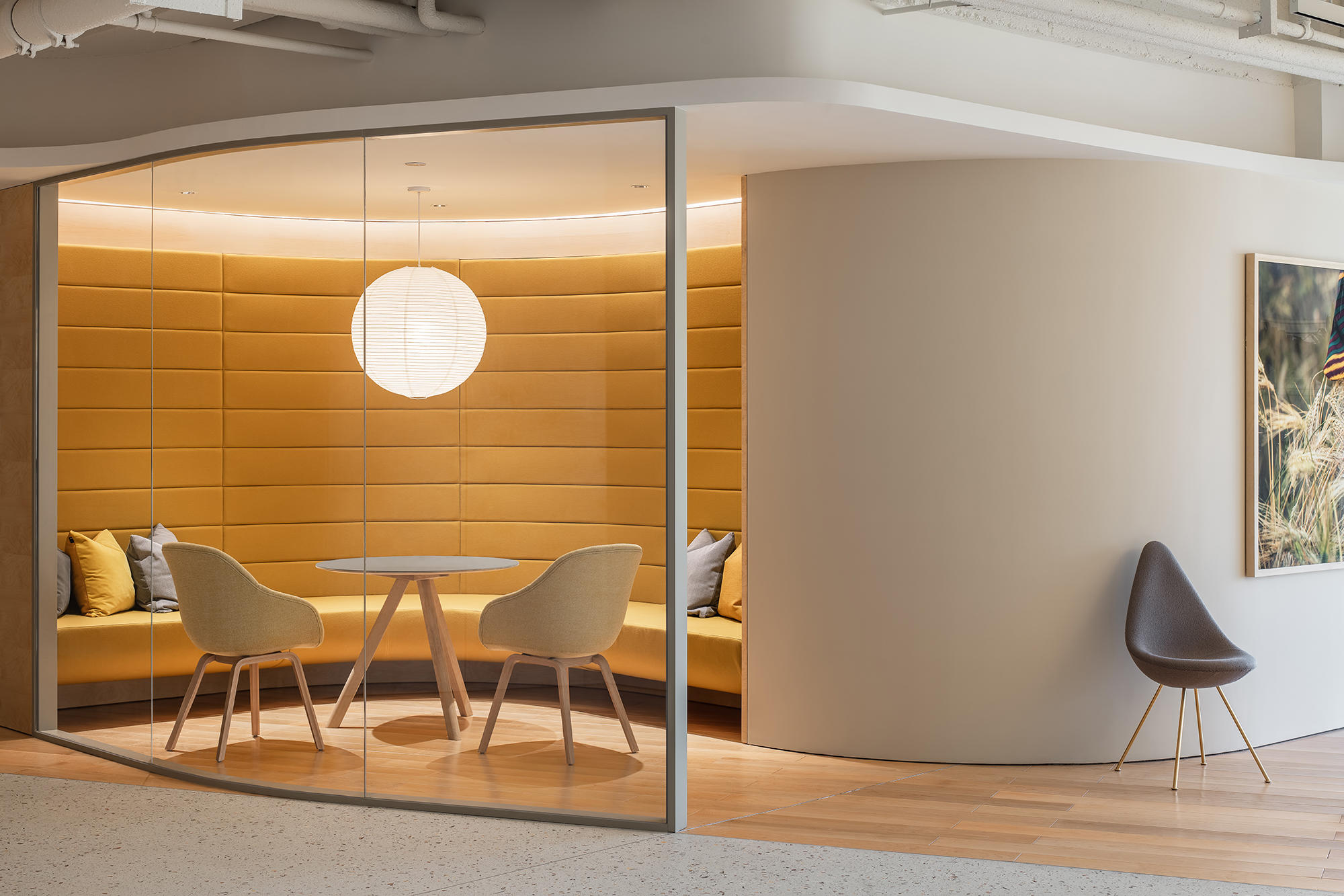 空间主材:水磨石、地毯、木地板、穿孔石膏板、涂料、毛毡、木材、皮革、玻璃