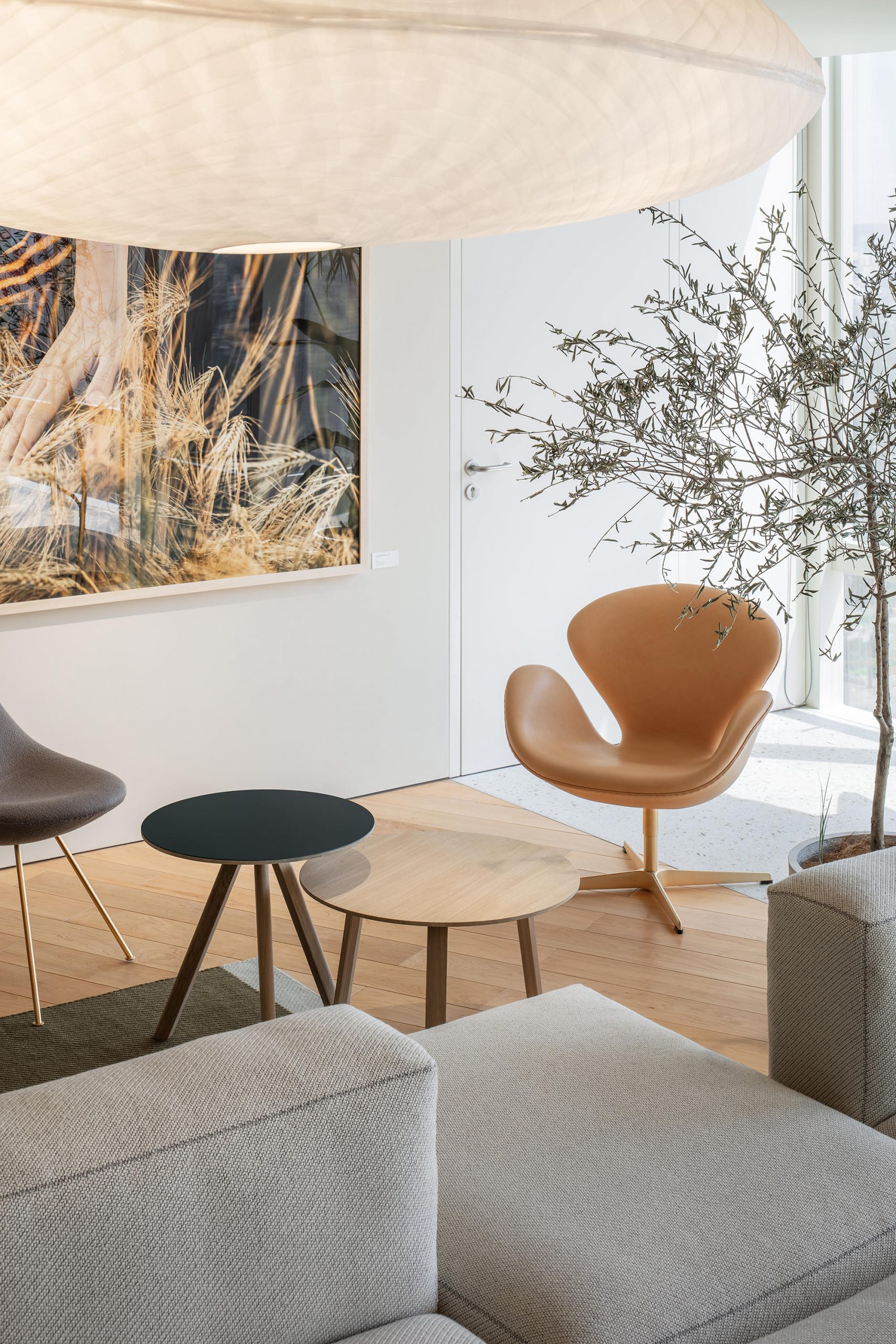 接待区以开放式格局容纳等候区,不同角度和距离之间形成多层次的视觉画面。墙面上悬挂的照片取材自丹麦ECCO工厂旁的麦田,既反映了ECCO的品牌文化,又为空间增添了自然元素,让来访者感受专属ECCO品牌的空间气质。