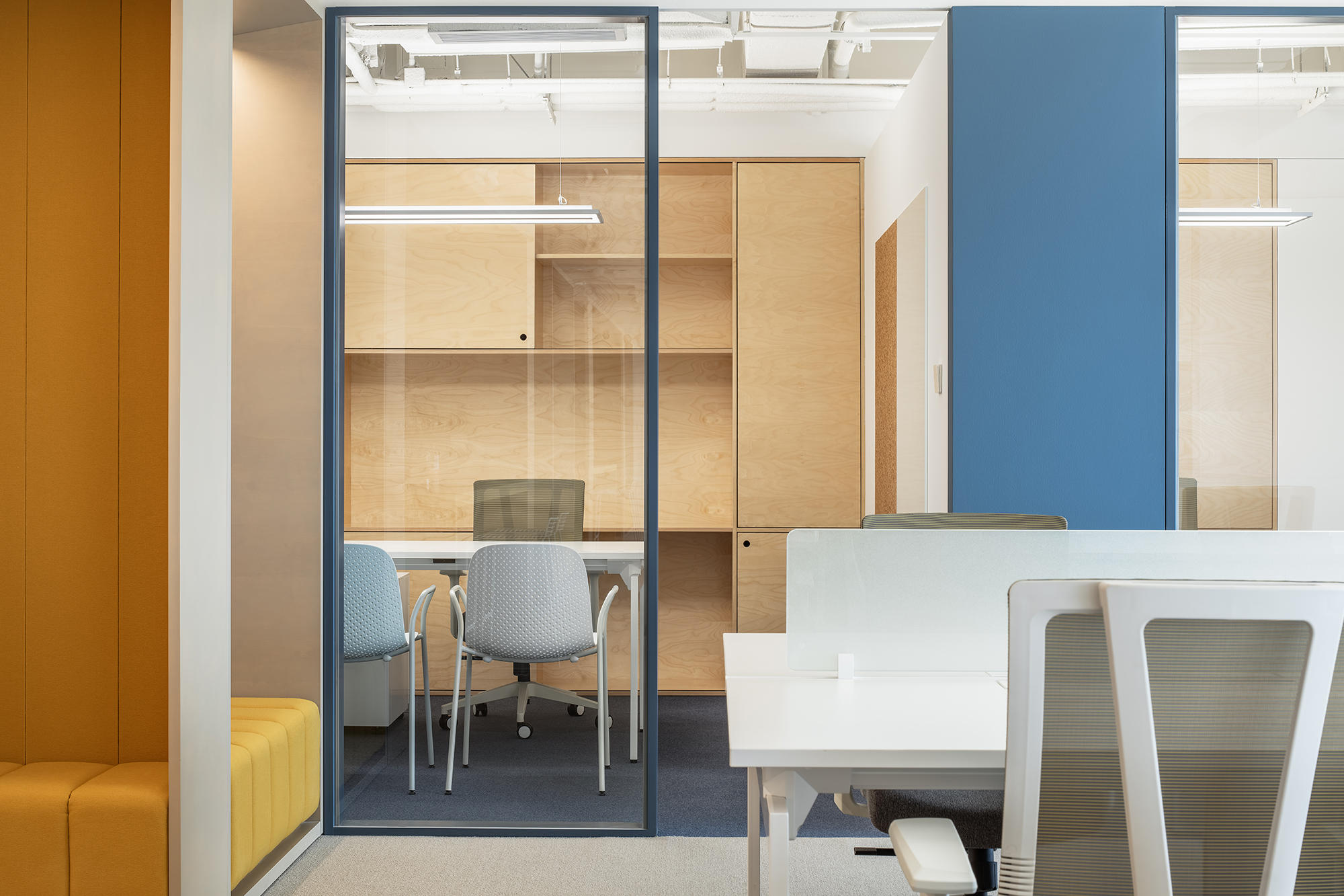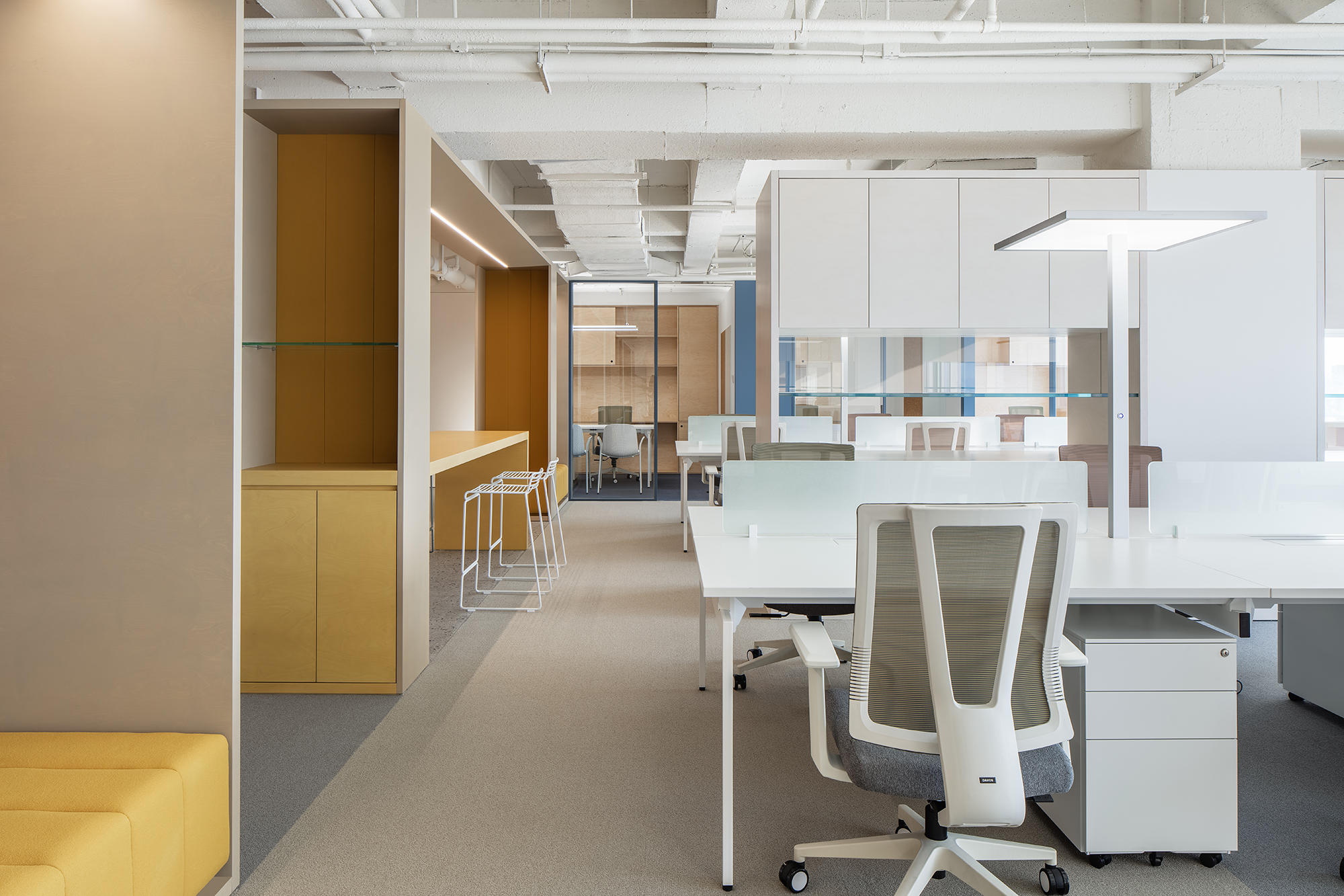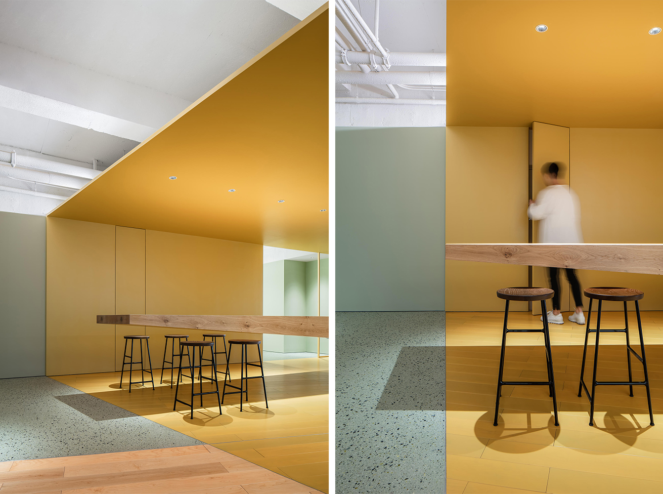 设计师划分会议室外部空间用于打造茶歇区,以亮黄色凸显功能区域,顶部天花的半封闭设计给予露天歇息的氛围。横向悬空木制桌面内置钢结构,增强稳定性的同时隐藏于墙面之中,用于分隔不同行径路线。