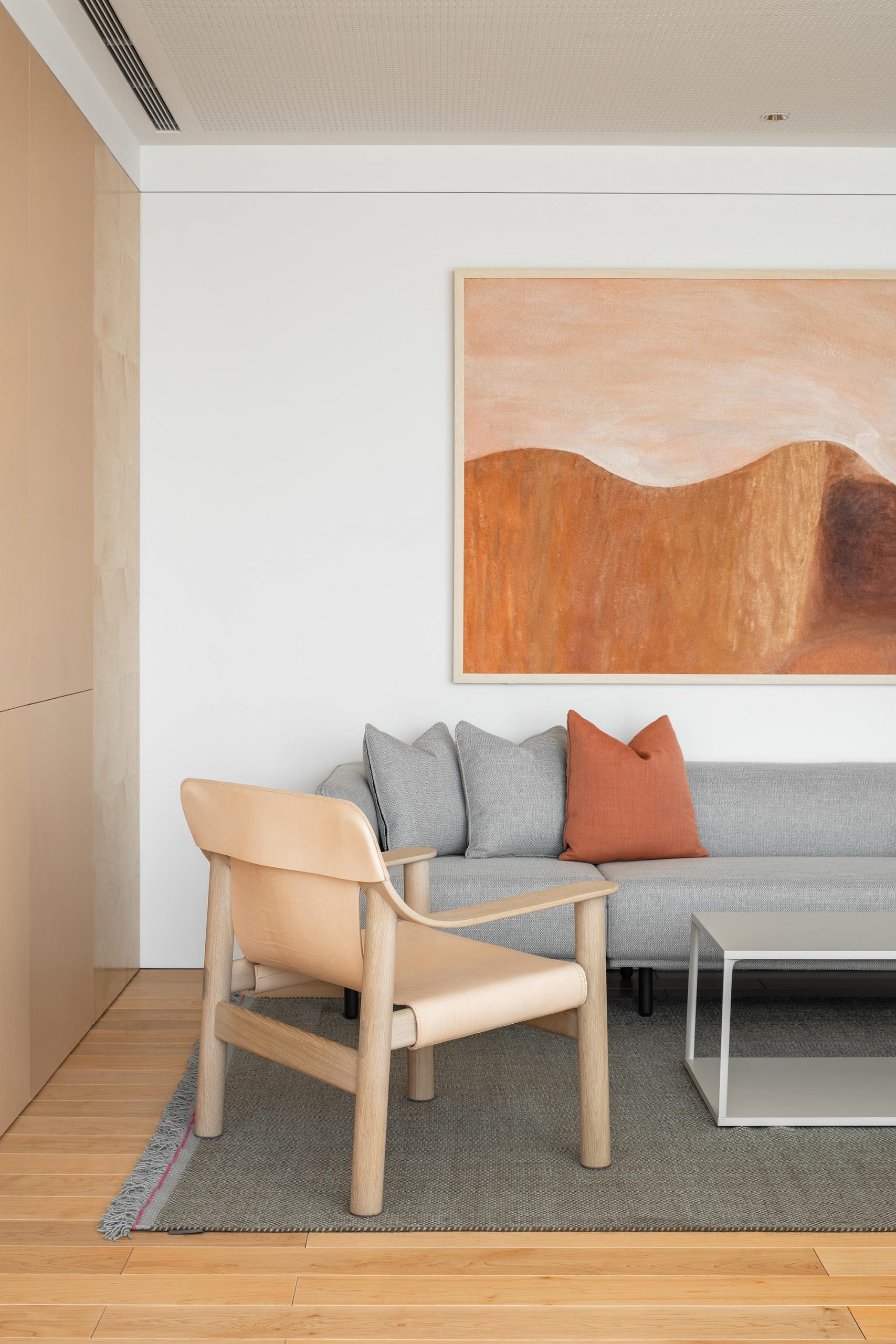 于接待区旁侧预留相对隐秘的休息区,简洁的架构下连通整体又彰显个性。悬挂的皮制艺术品以陕西皮影的皮革为设计灵感,同时融入ECCO皮料辅助完成。小场景的氛围中充盈着现代美学的气息,凸显丹麦文化和西安当地文化的融合。
