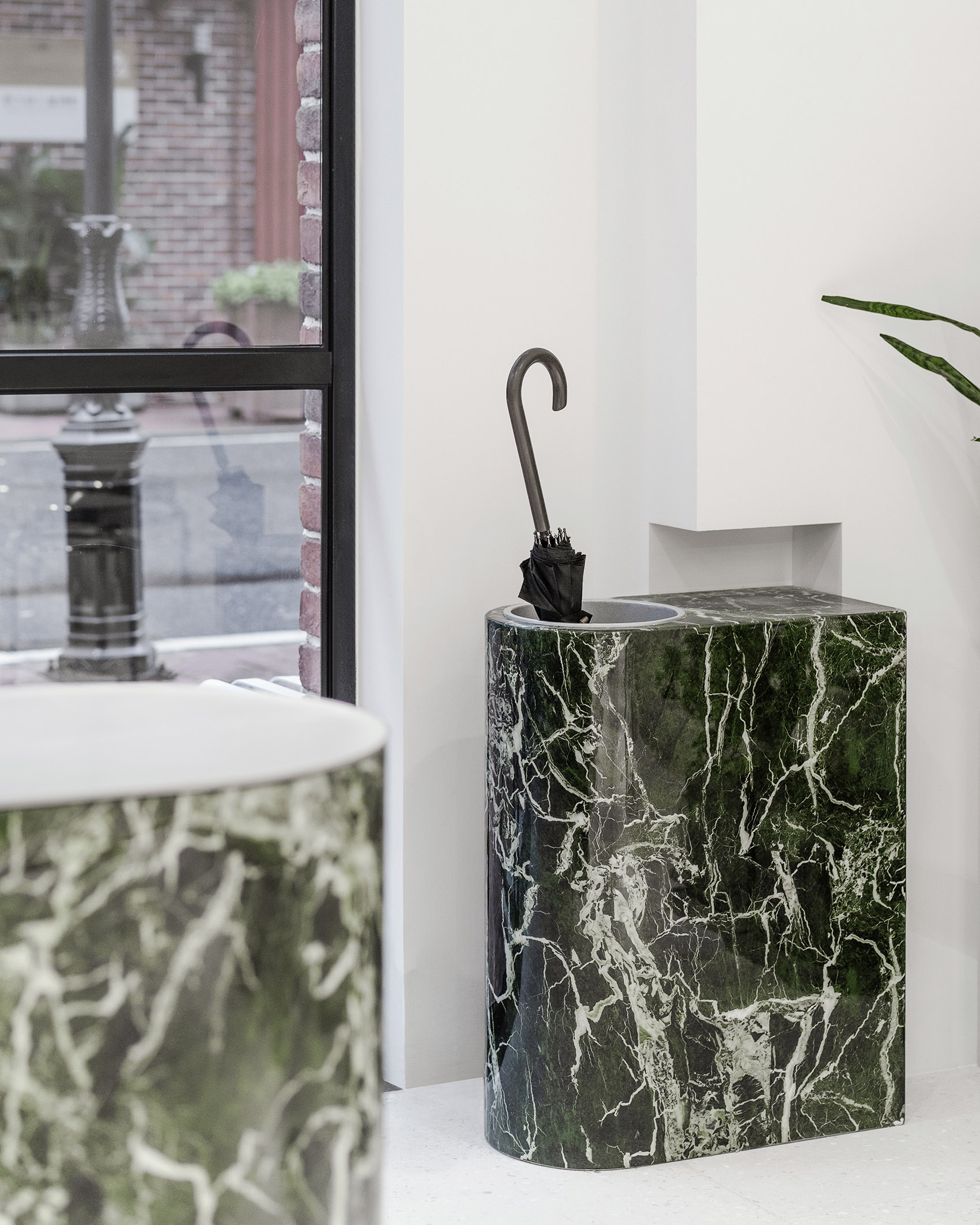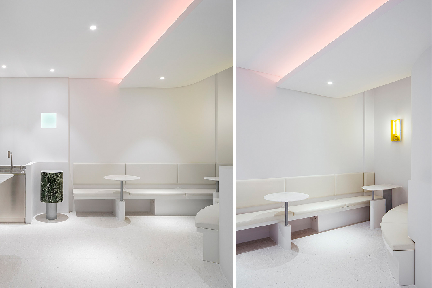 在项目进行之初与业主交流的过程中,业主提出希望我们能以白色为主基调设计一个干净明亮的、“温柔”的空间。我们将不同功能的白色道具进行块状处理,使其如蛋糕置于餐盘上。不同材料带来微妙的色彩变化。绿色大理石的道具、可变色的灯带成为点缀,并为空间提供了更多功能与气氛上的可能性。