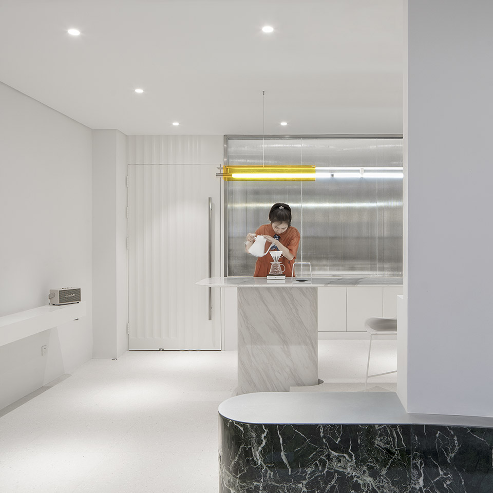 正对入口的吧台功能被简化,使其以轻盈的状态呈现。在满足进行手冲咖啡制作与蛋糕装盒工作的同时,拉近客人与工作人员间的距离,使交谈放松和平等。