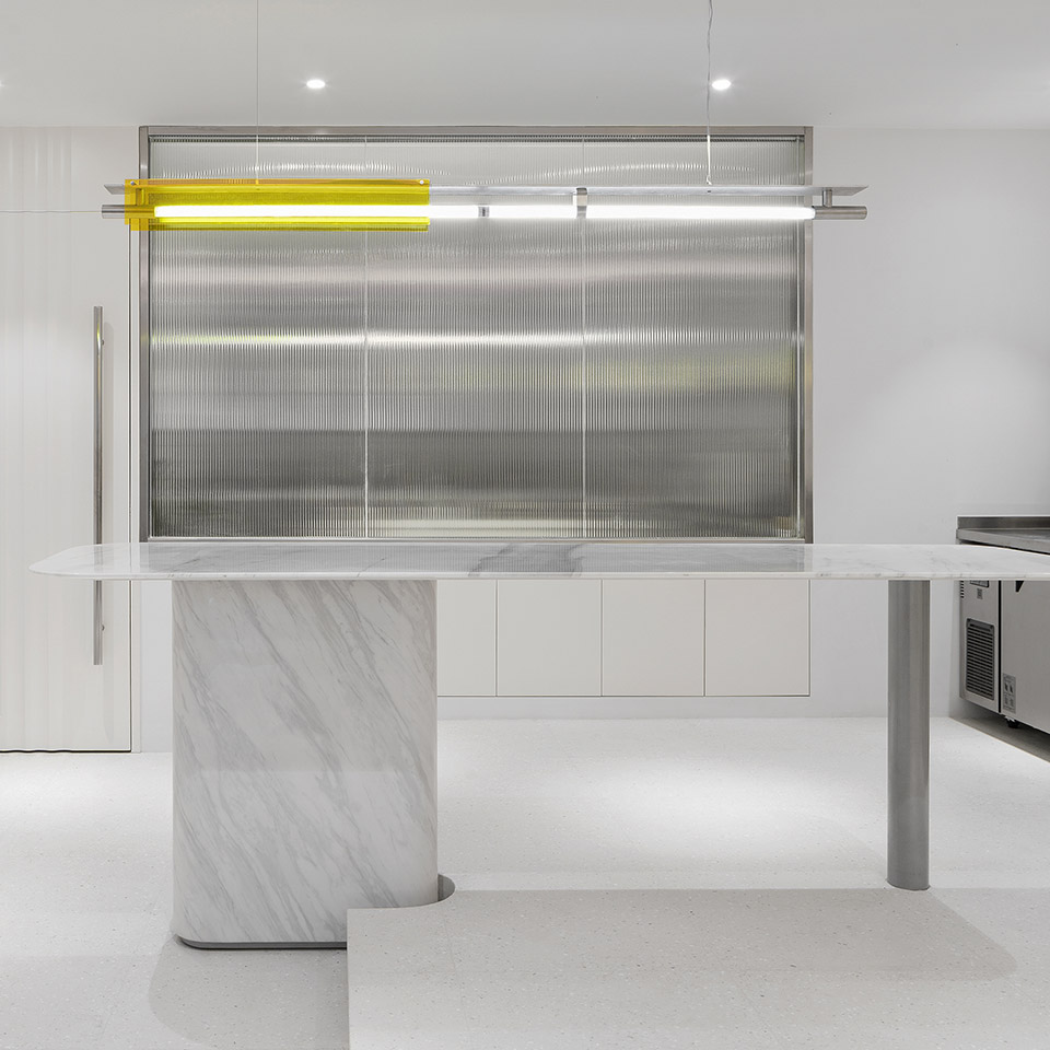 空间主材:大理石、浅色岩板、不锈钢、浅色人造革