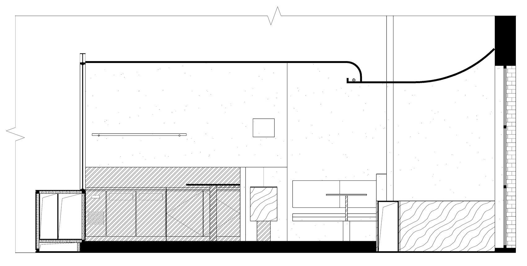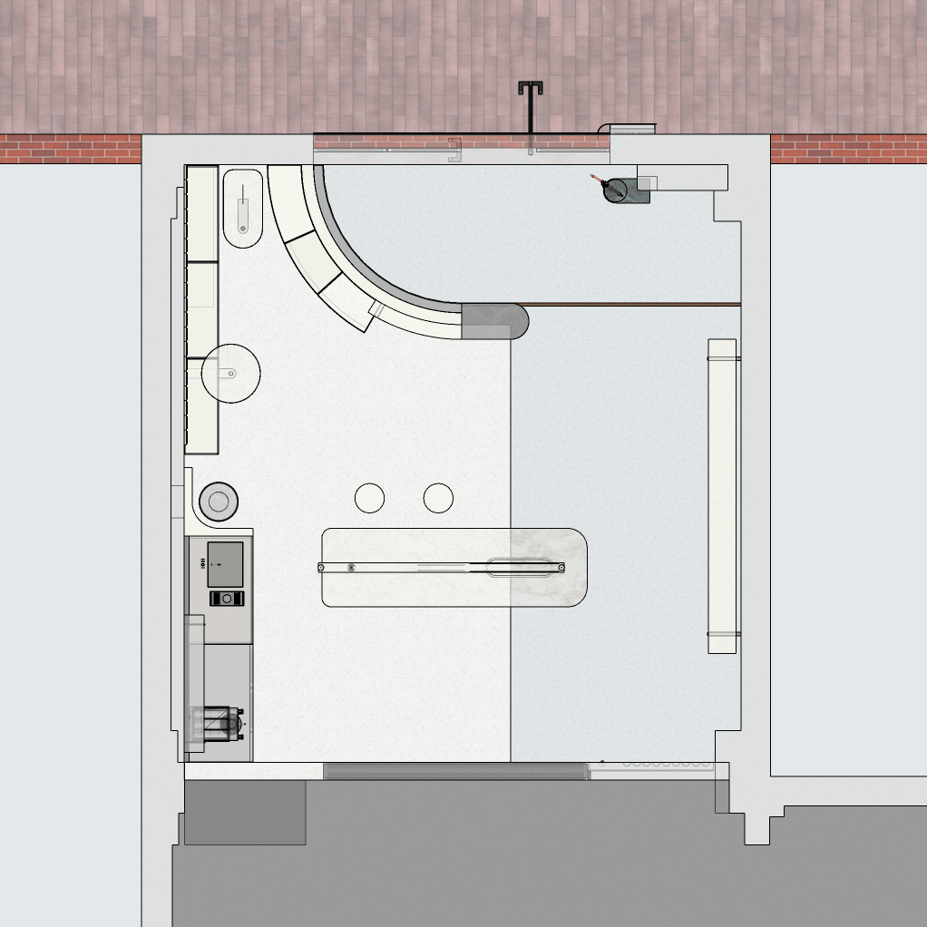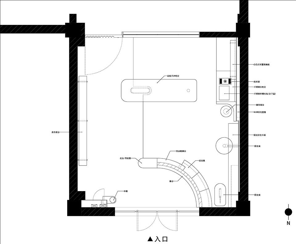 进门处设置了1/4圆的“屏风”和弧形天花板,压缩进门空间得到具有邀请感的入口,并使后方形成安全的谈话就餐区。路过的行人可以看到内部在吧台制作手冲咖啡的咖啡师从而获得这是一个休闲餐饮空间的明确信息。