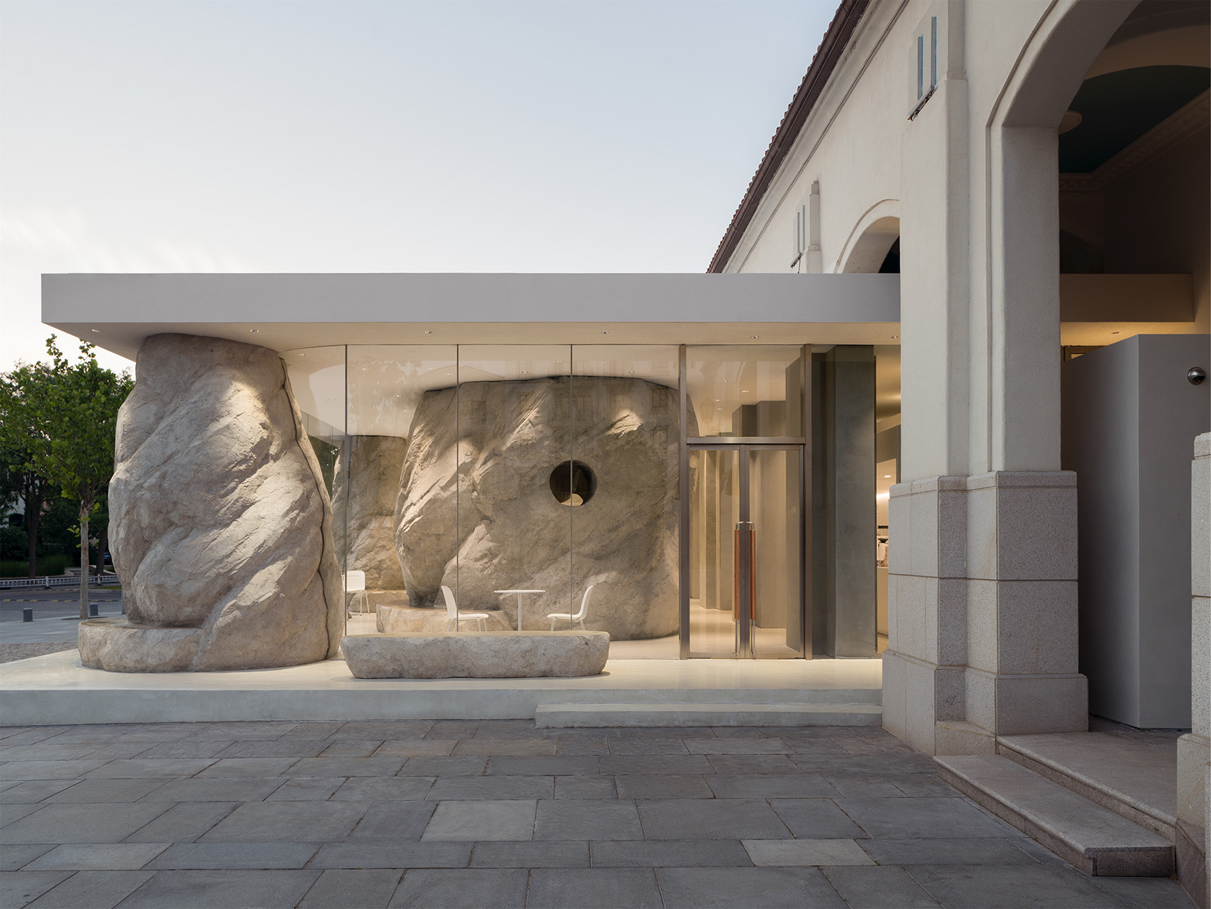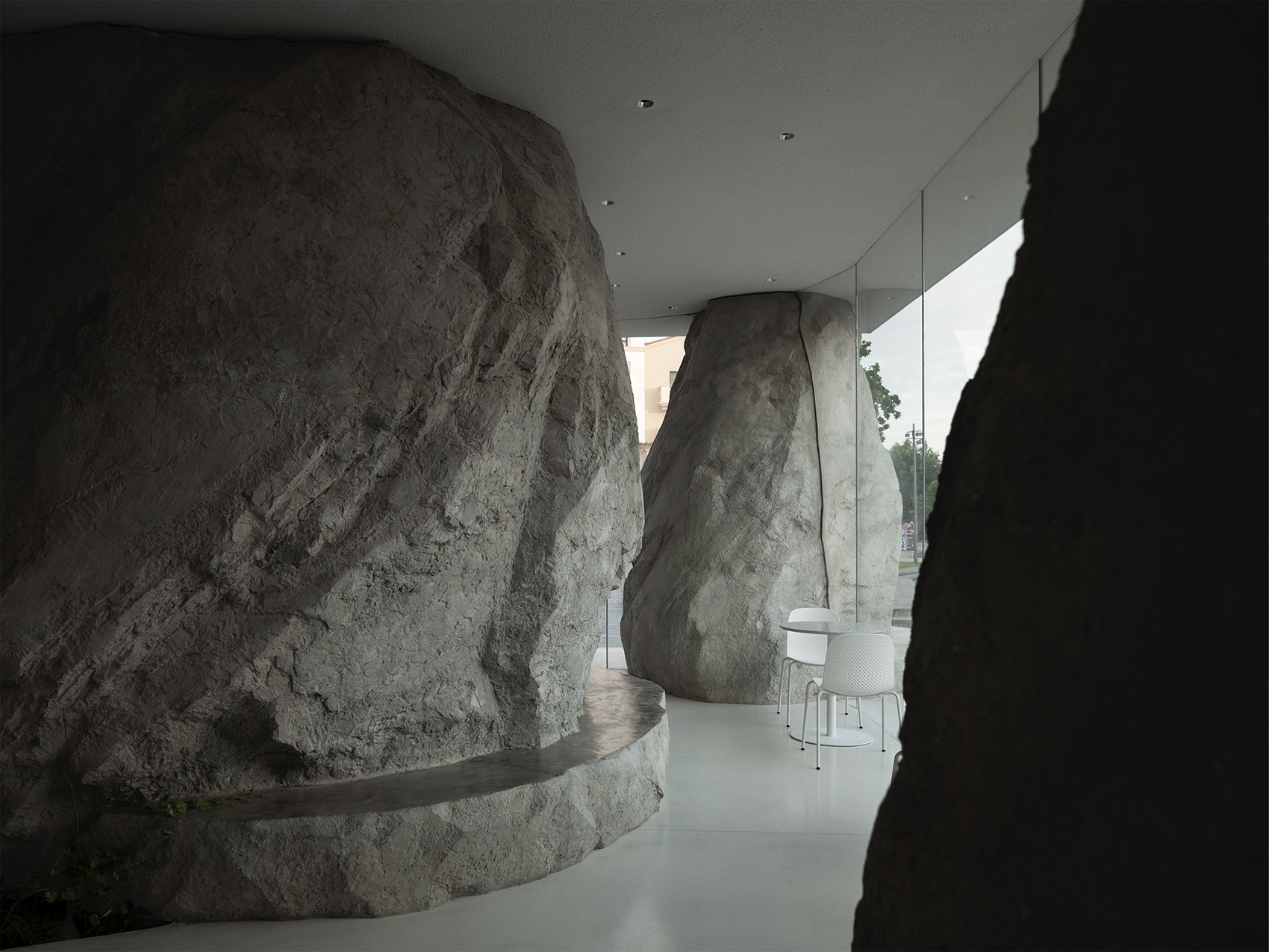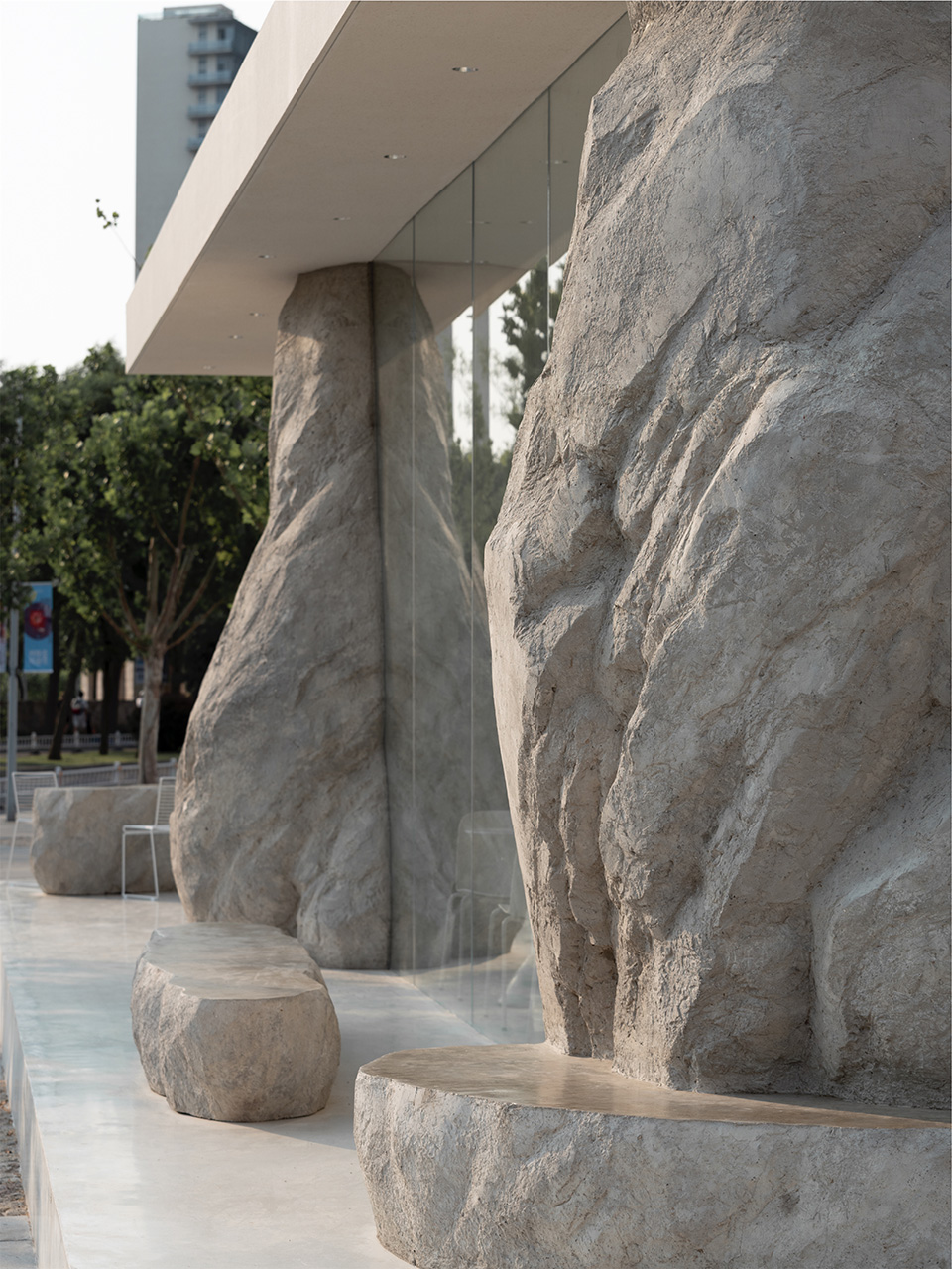 在开阔的小广场上,几块自然形态的山石散落其间,支撑起一片大屋檐。背靠原有的电影院北立面,建筑另外三个面没有设计实体墙,而是整体由玻璃幕墙围合而成,形成室内外融合一体的空间。山石有机的形态看似随机和偶然,实际上几个大小不一的石头既承担了隐藏钢结构柱的作用,也划分了不同的功能区。两个最大的山石内部是私密的就餐包间,其余造型在底部结合了固定座位的功能。散座区则在几座山石之间自由延展,整个平面是开放流动的,让客人在行走间获得不断变化的空间体验。石头造型由GRC浇筑而成,水泥的自然肌理既真实的展现了山石粗粝厚重的质感,又与周边超白玻璃的轻盈通透形成强烈对比,突出了造型的力量感。大面积的玻璃幕墙给室内空间带来充足的阳光,光影变化让空间由静入动,随时间变换着生机,给客人一种身处自然,休憩在山石间的感受。