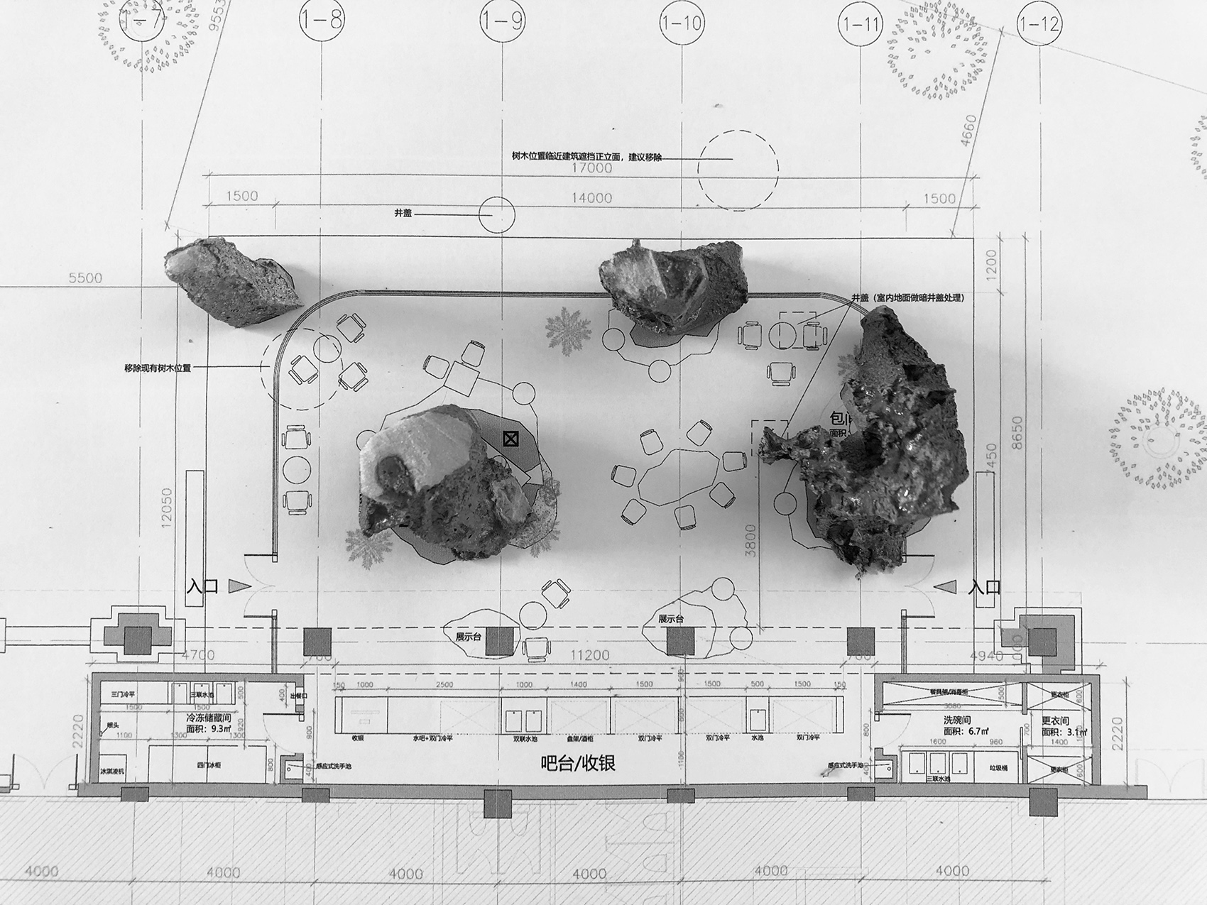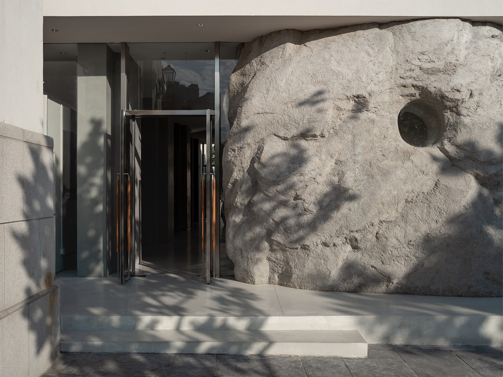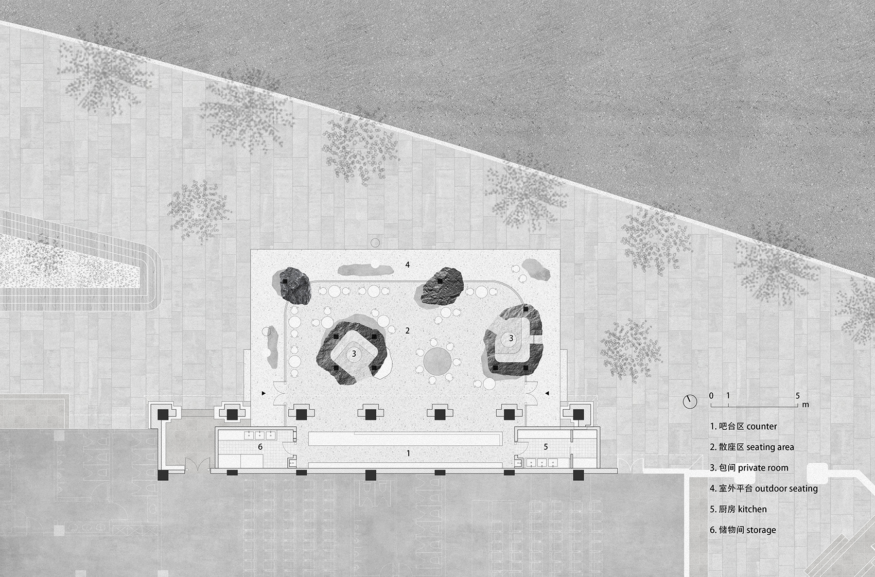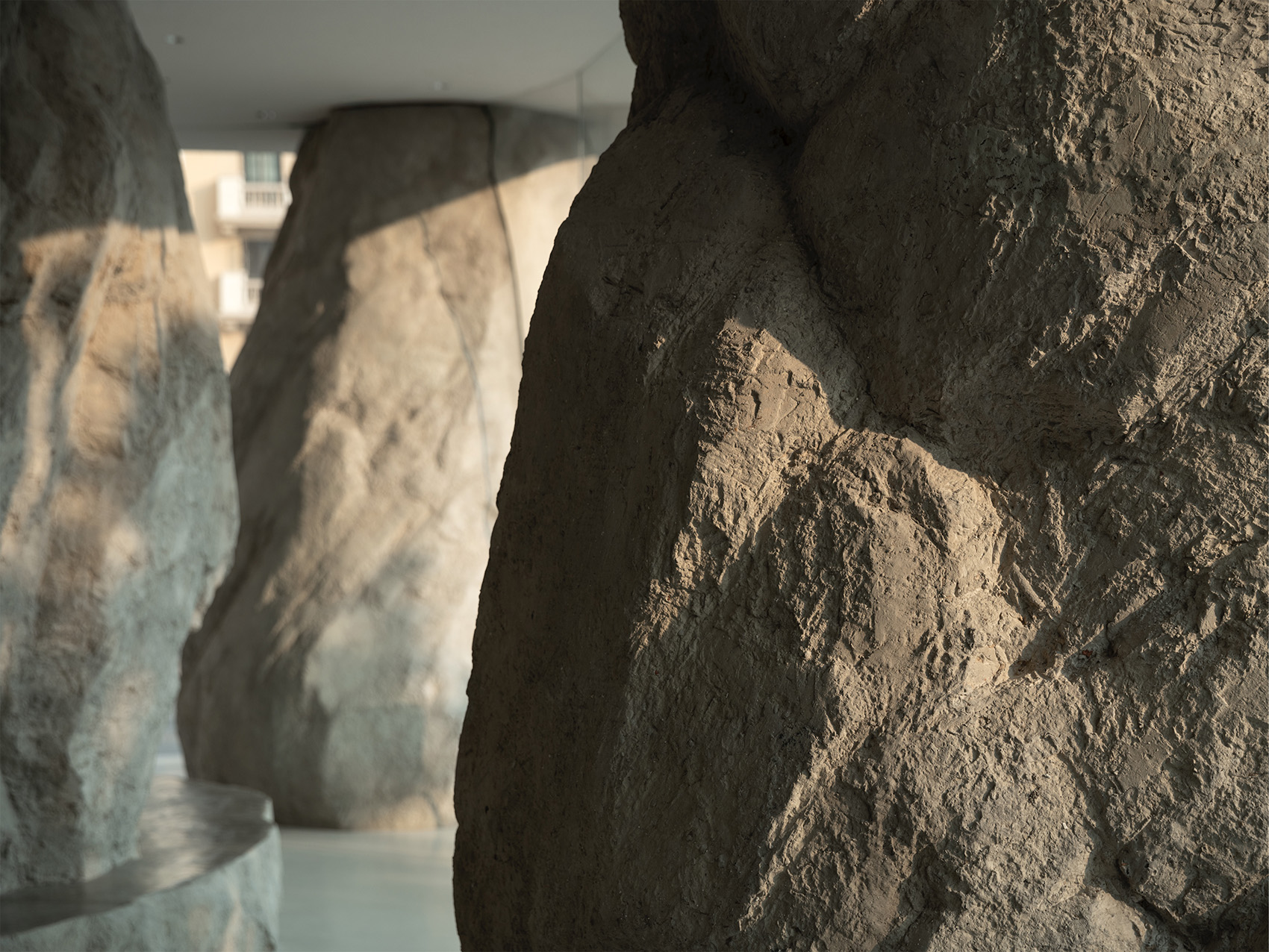 在开阔的小广场上,几块自然形态的山石散落其间,支撑起一片大屋檐。背靠原有的电影院北立面,建筑另外三个面没有设计实体墙,而是整体由玻璃幕墙围合而成,形成室内外融合一体的空间。山石有机的形态看似随机和偶然,实际上几个大小不一的石头既承担了隐藏钢结构柱的作用,也划分了不同的功能区。两个最大的山石内部是私密的就餐包间,其余造型在底部结合了固定座位的功能。散座区则在几座山石之间自由延展,整个平面是开放流动的,让客人在行走间获得不断变化的空间体验。石头造型由GRC浇筑而成,水泥的自然肌理既真实的展现了山石粗粝厚重的质感,又与周边超白玻璃的轻盈通透形成强烈对比,突出了造型的力量感。大面积的玻璃幕墙给室内空间带来充足的阳光,光影变化让空间由静入动,随时间变换着生机,给客人一种身处自然,休憩在山石间的感受。