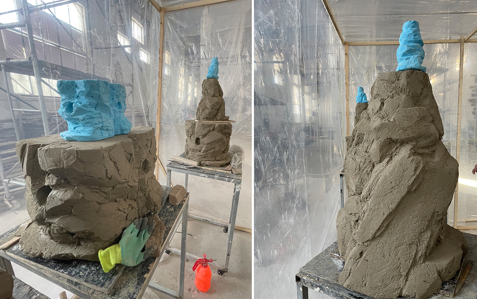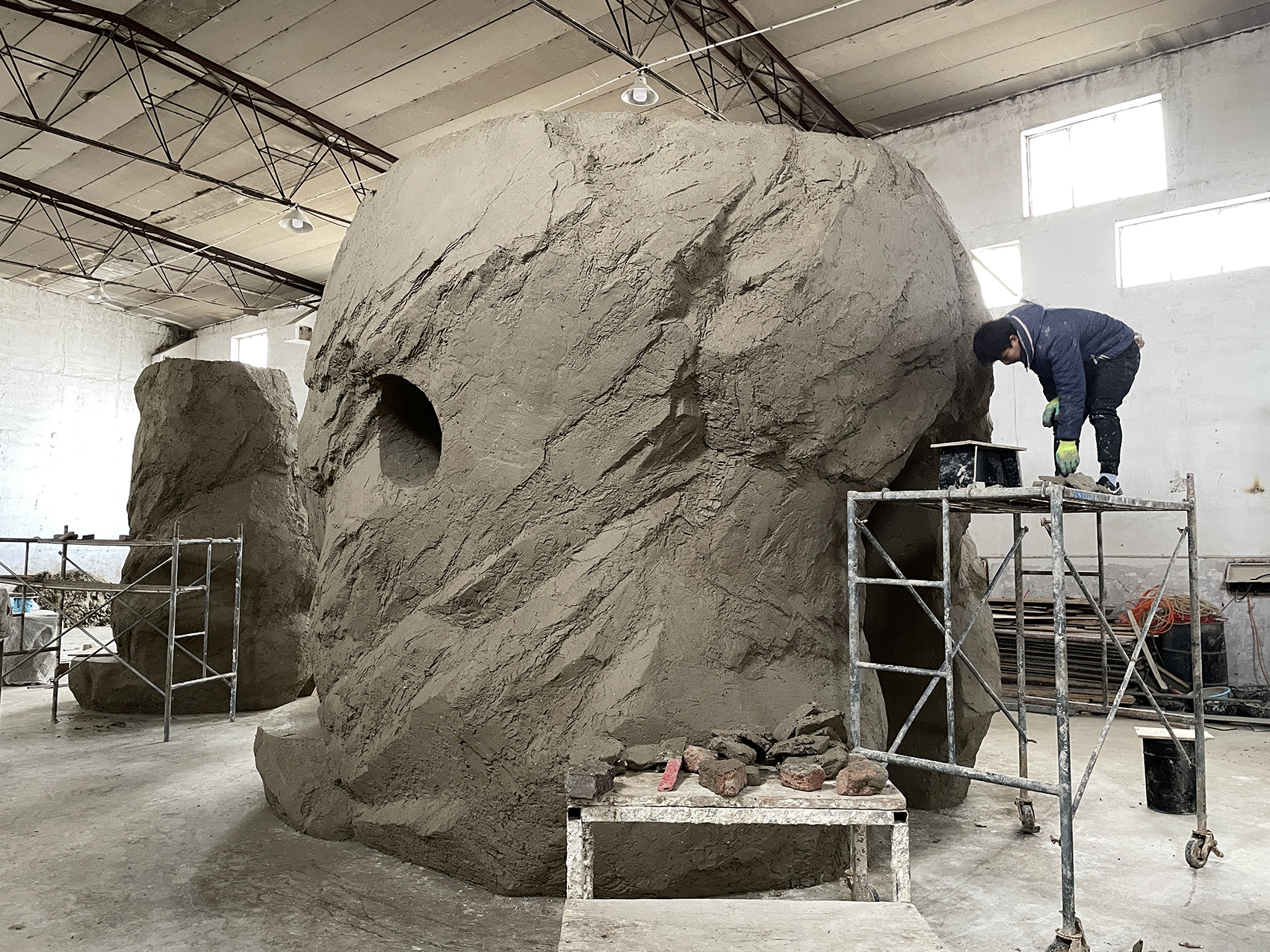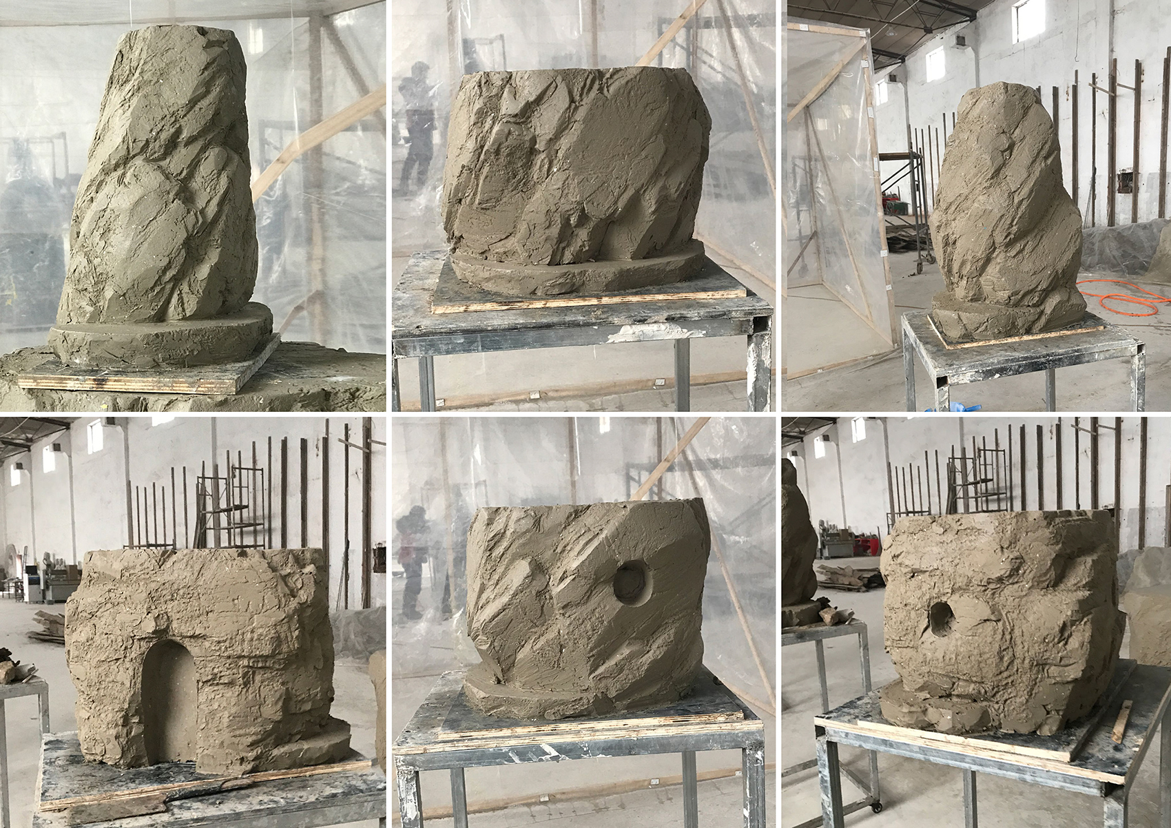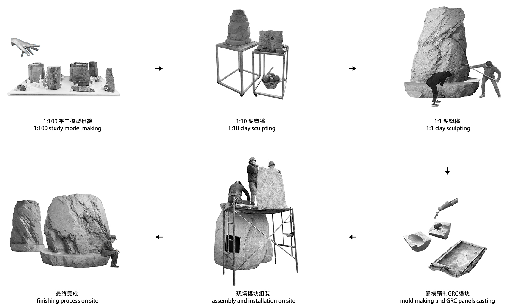 味从山海的设计和建造过程相对于常规建筑项目都有所突破。我们从设计初始就手工模型来推敲空间形态,从1:100的泡沫模型出发,通过多组不同模型研究空间构成。胶水腐蚀泡沫形成了自然的凹凸肌理,其生动的形态也偶然的帮助了我们的创作。随着方案的深入,逐步放大模型比例,最后用1:30的模型敲定了空间的组织和形态,转而开始在专业工厂进行制作。首先是1:10的手工泥塑模型,泥土这样的天然材料,让我们对空间的形态和质感有了更直观的认识和把握。随后在不断调整中继续放大模型比例,直到1:1的泥塑定稿。整个创作过程中没有借助电脑软件的帮助,都是设计师和施工方用手工完成的。此后工人将泥塑翻模,浇筑GRC模块,然后将成品模块运输到现场进行拼接组装,建筑最终落成。