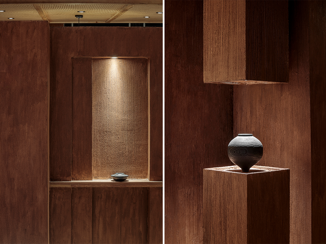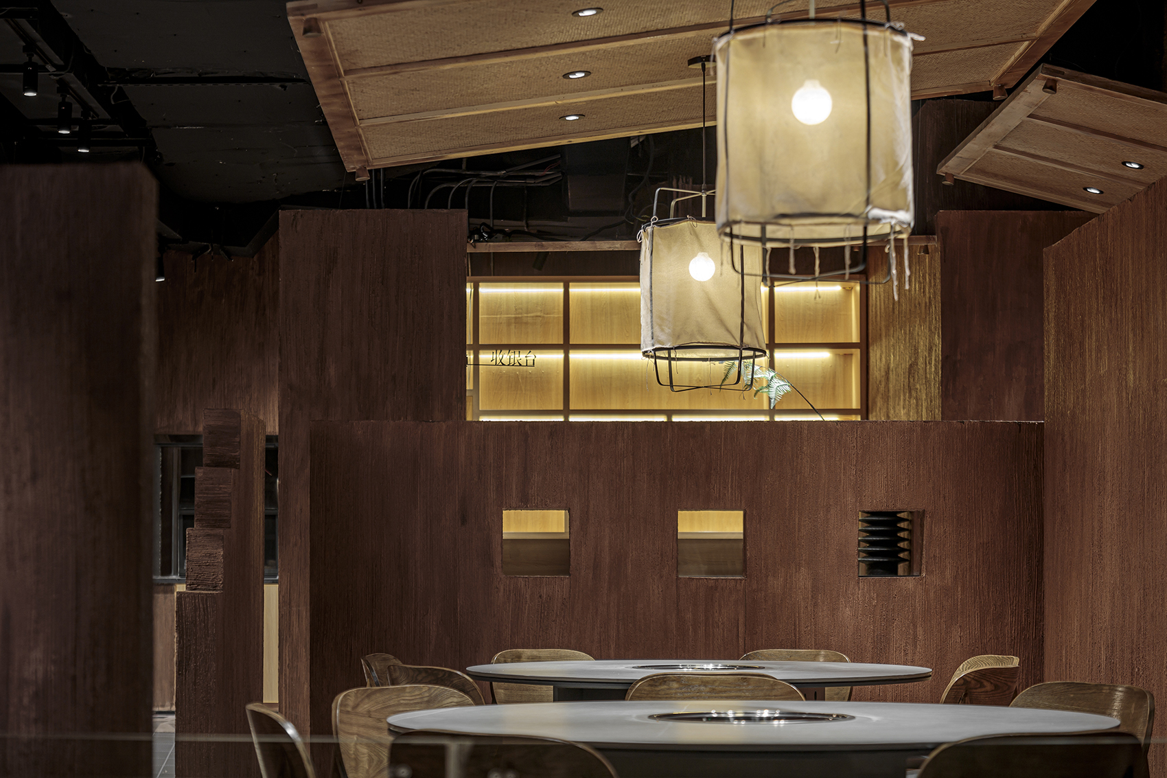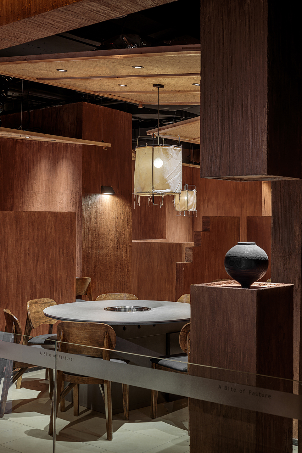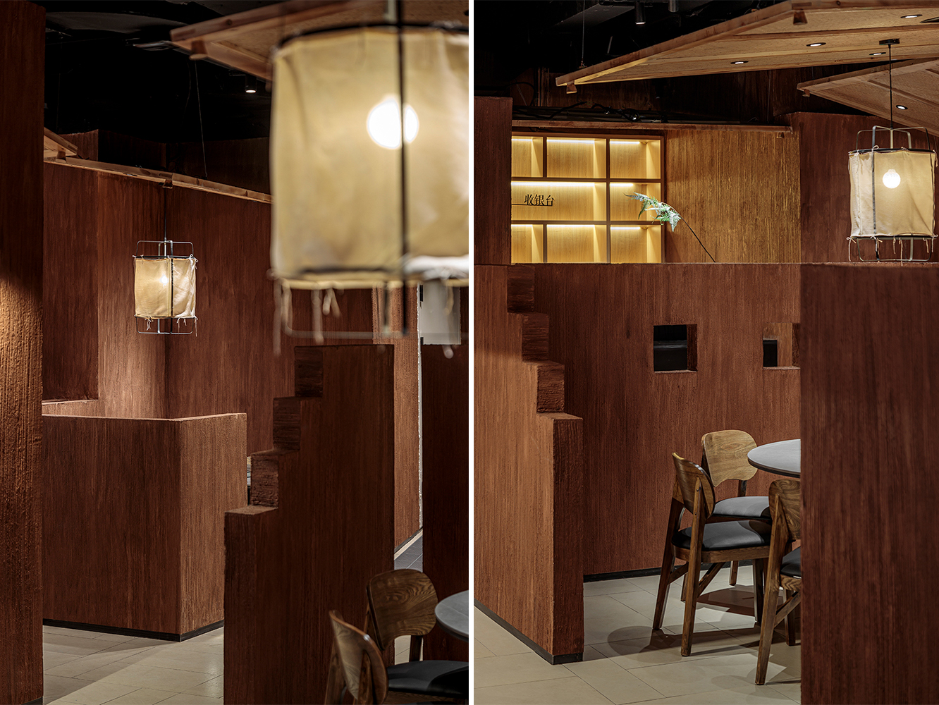 透着浓郁的泥土气息,步入这里的视觉已经被这质朴而熟悉的味道吸引。点点灯光照在斑驳的墙壁上好似牧民的毡房,阶梯状结构的设计间隔出一面面围墙,透过小窗看向外面的阳光。