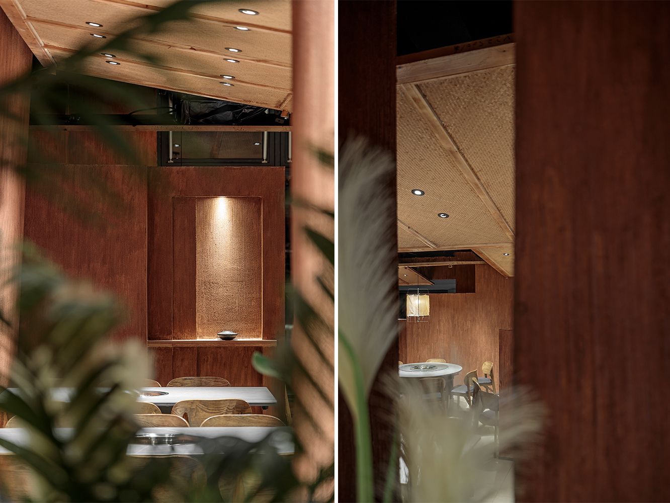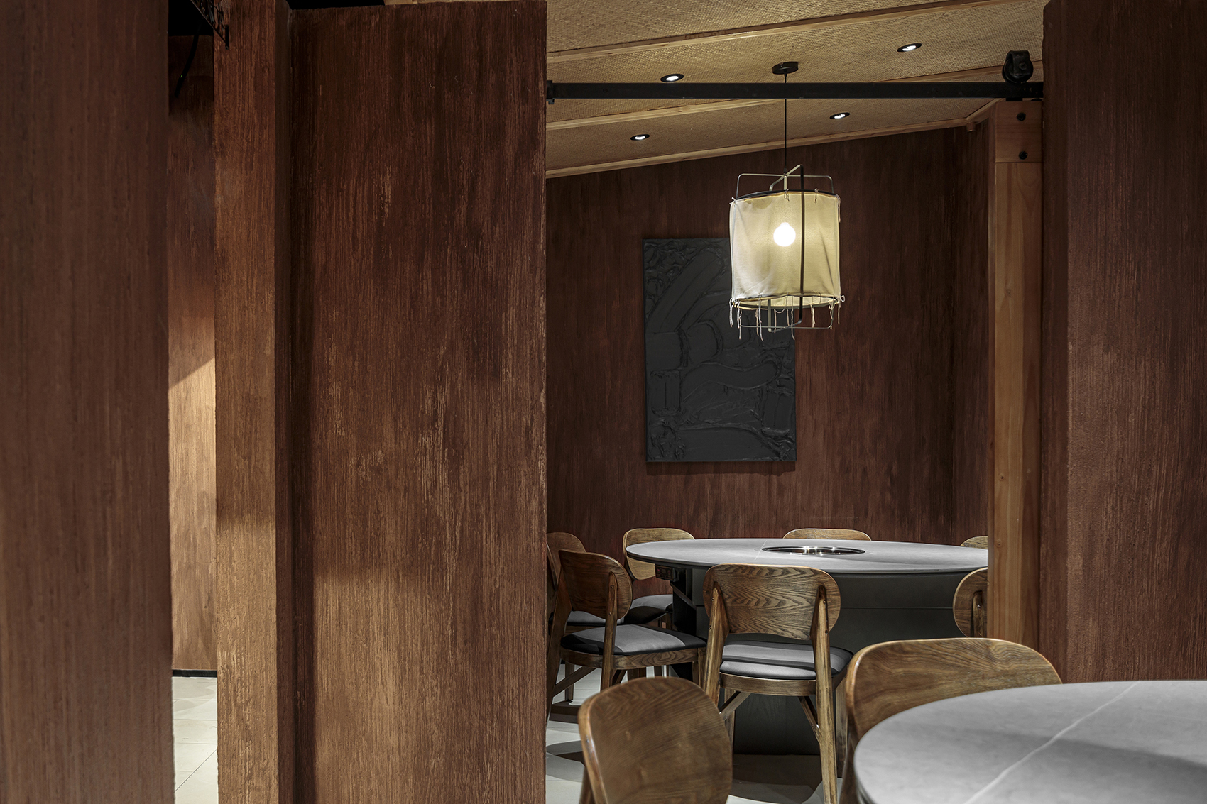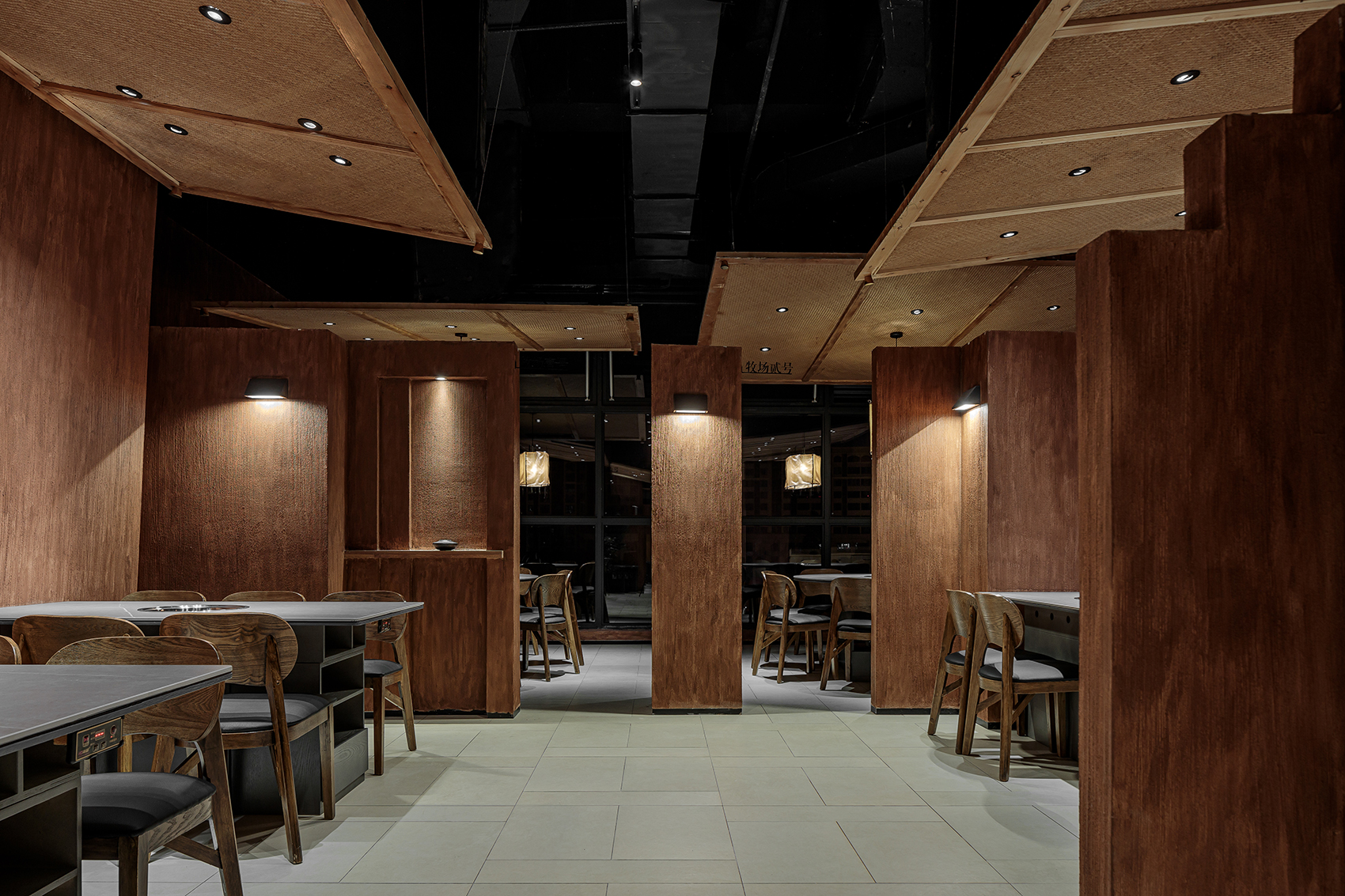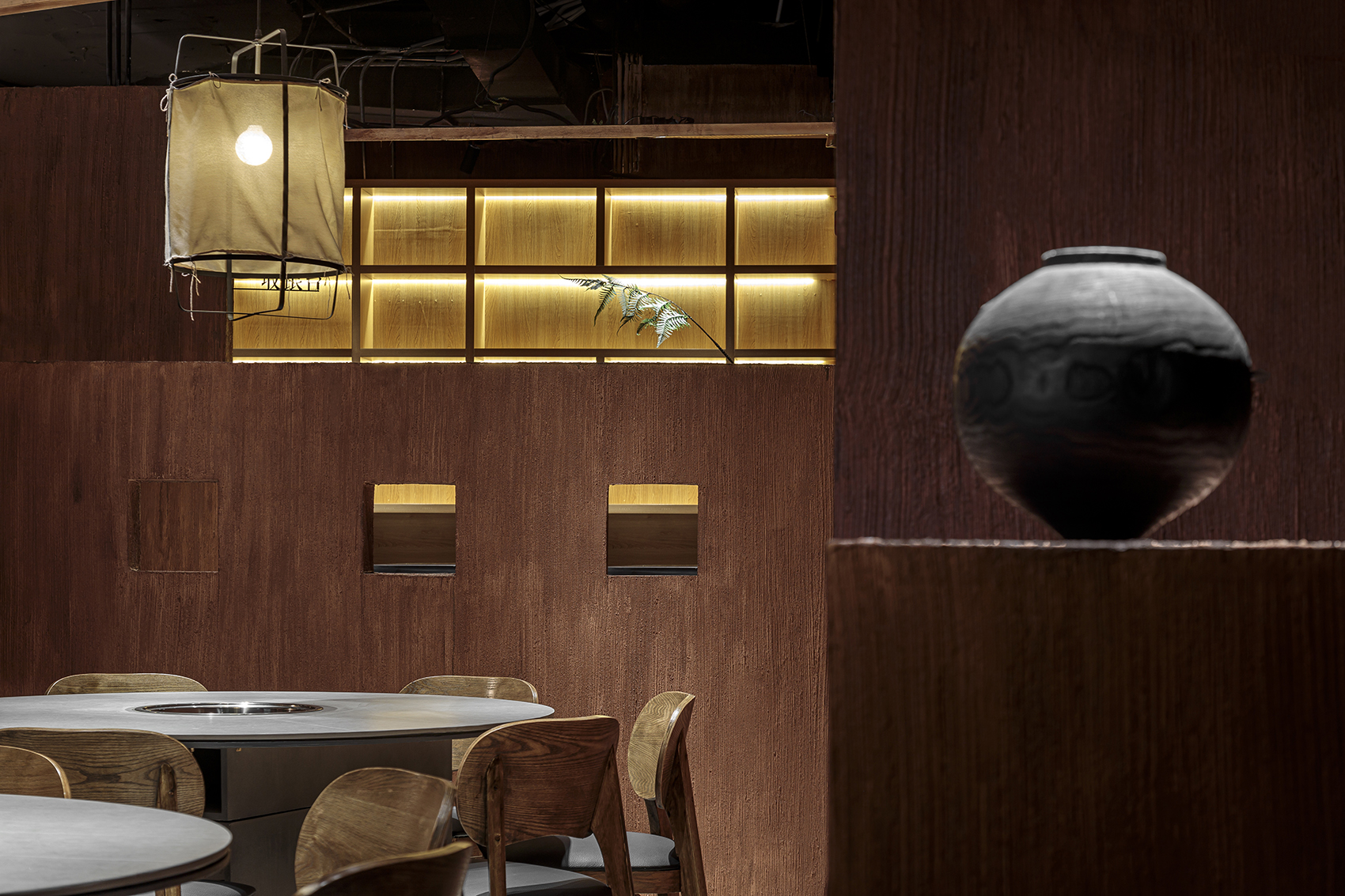透着浓郁的泥土气息,步入这里的视觉已经被这质朴而熟悉的味道吸引。点点灯光照在斑驳的墙壁上好似牧民的毡房,阶梯状结构的设计间隔出一面面围墙,透过小窗看向外面的阳光。