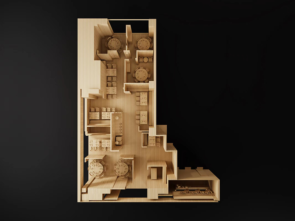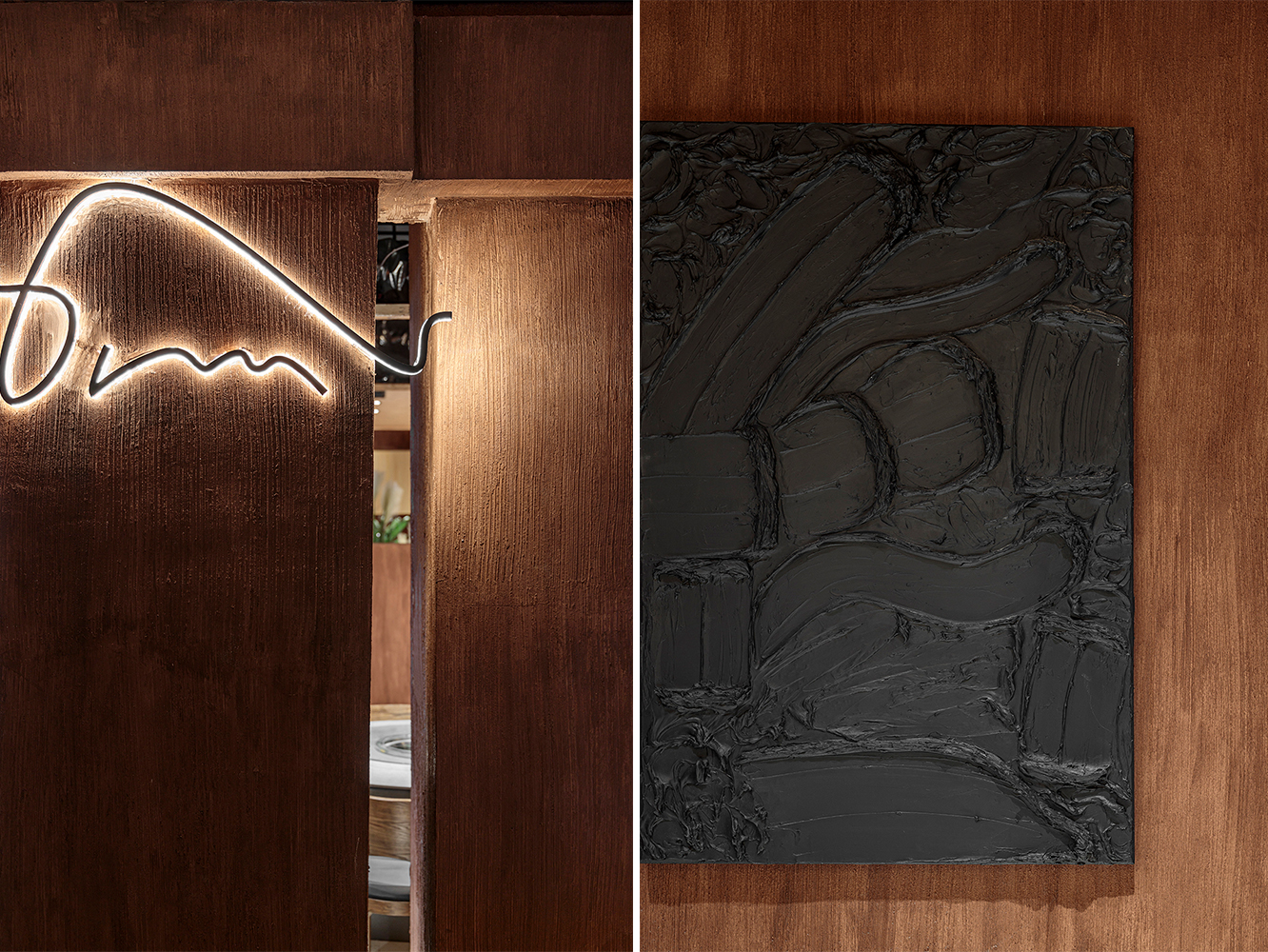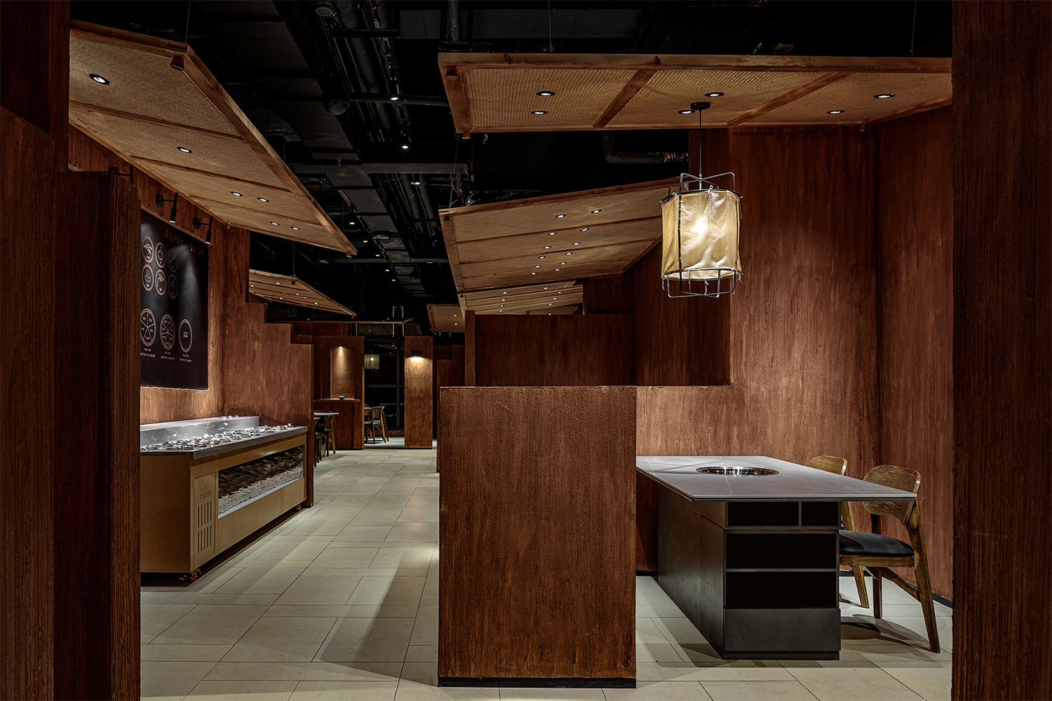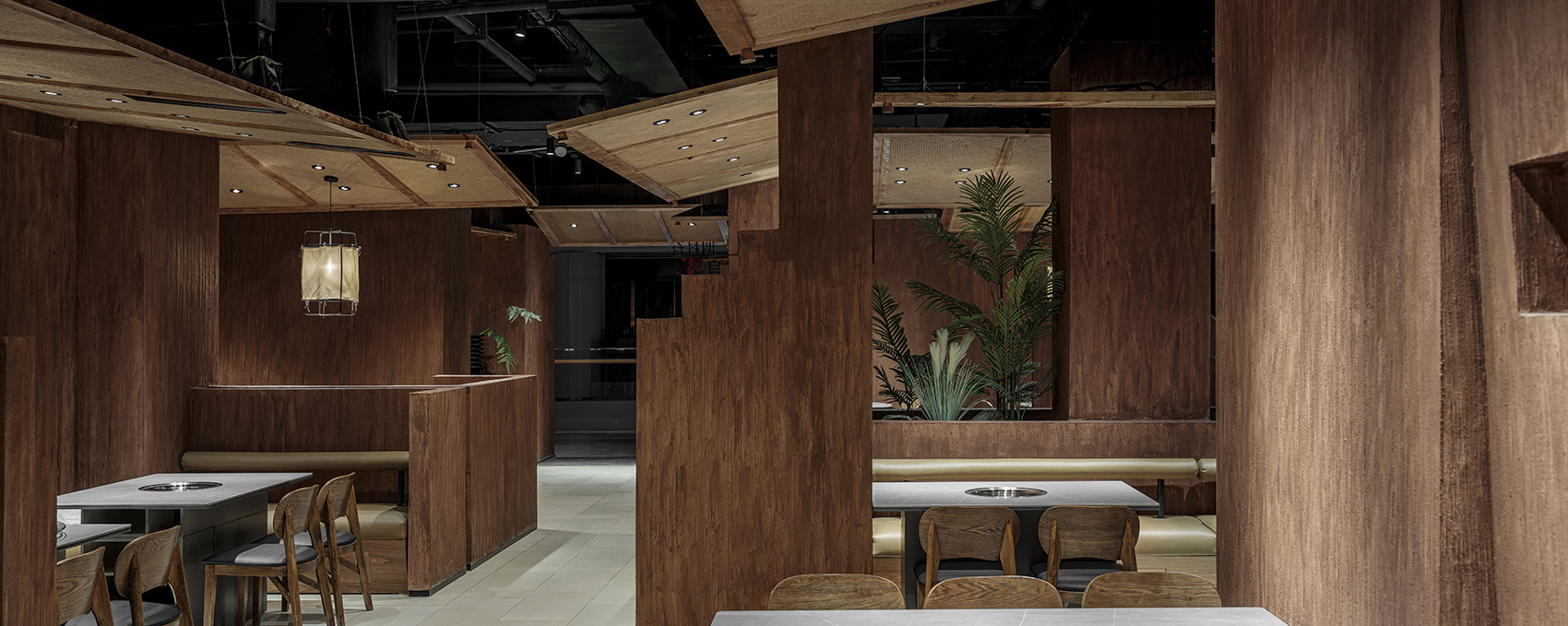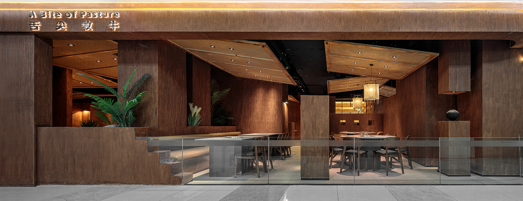 透着浓郁的泥土气息,步入这里的视觉已经被这质朴而熟悉的味道吸引。点点灯光照在斑驳的墙壁上好似牧民的毡房,阶梯状结构的设计间隔出一面面围墙,透过小窗看向外面的阳光。