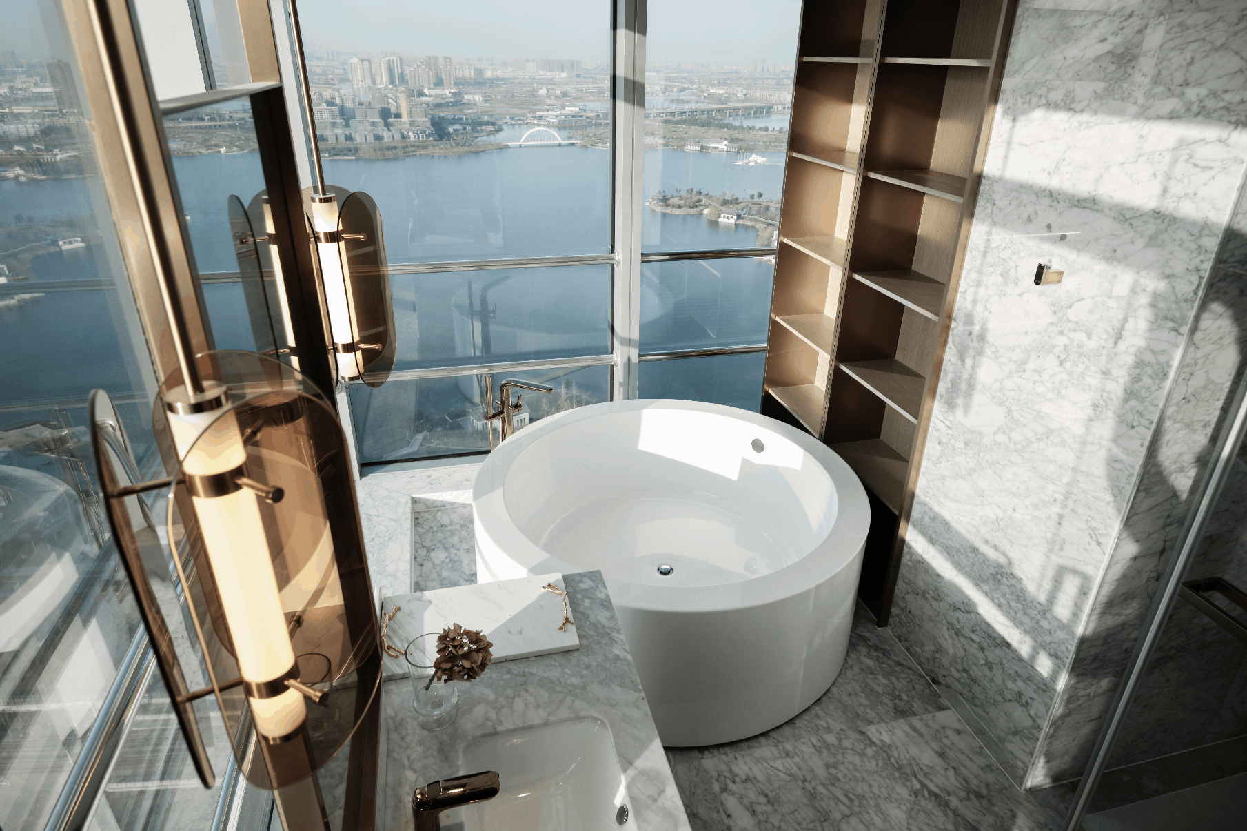 客房部分,位置得天独厚,醉人的城市天际线,全玻璃落地窗,感受拂晓与日落,设计师做的只是「 一抹精致搭配几处清雅 」