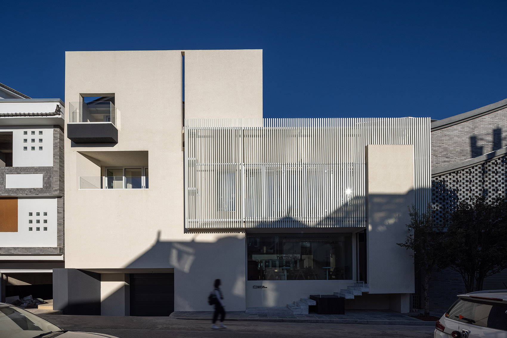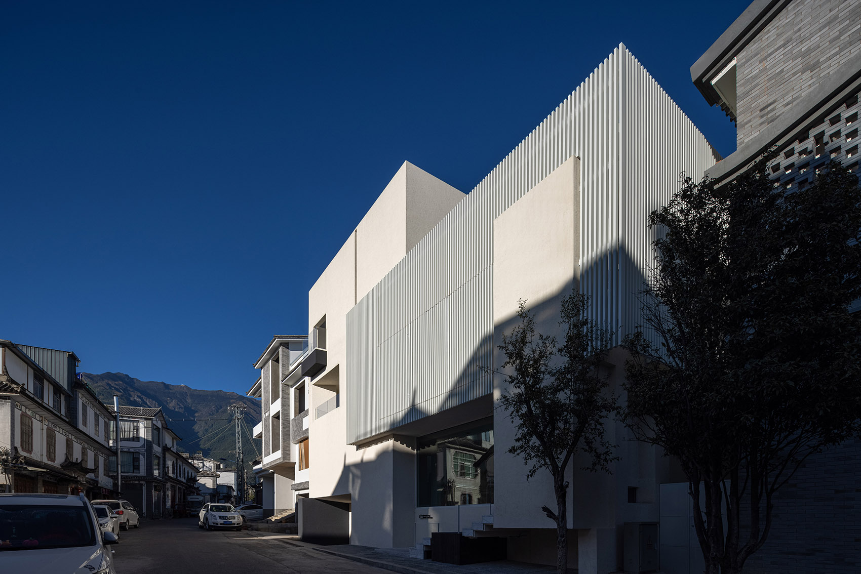 建筑外立面用白色涂料进行包裹,隔栅做装饰,与不远处的苍山美景交相辉映,犹如一片从苍山飘落下的雪花。设计师走访了当地的人文与环境,发现古城内分布着错落的小巷,家家户户的院落内都有一面照壁。因此将原本的入口改为了侧边进入的方式,增加了入户的仪式感。