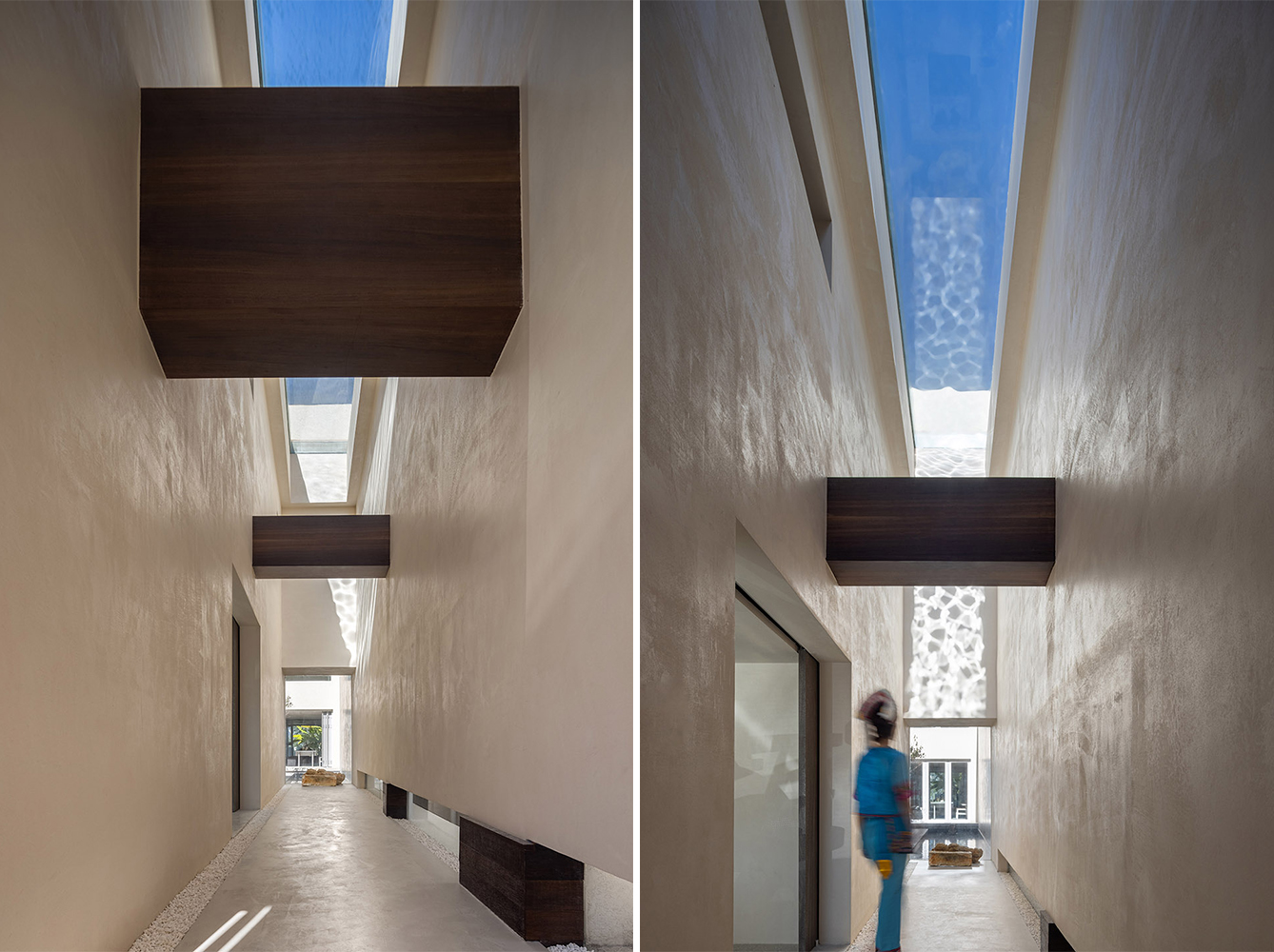 楼梯连接着空间内客人流动的方向,玻璃天窗让大理的蓝天白云映入室内,不用灯光的修饰,自然的光线是最好的设计。