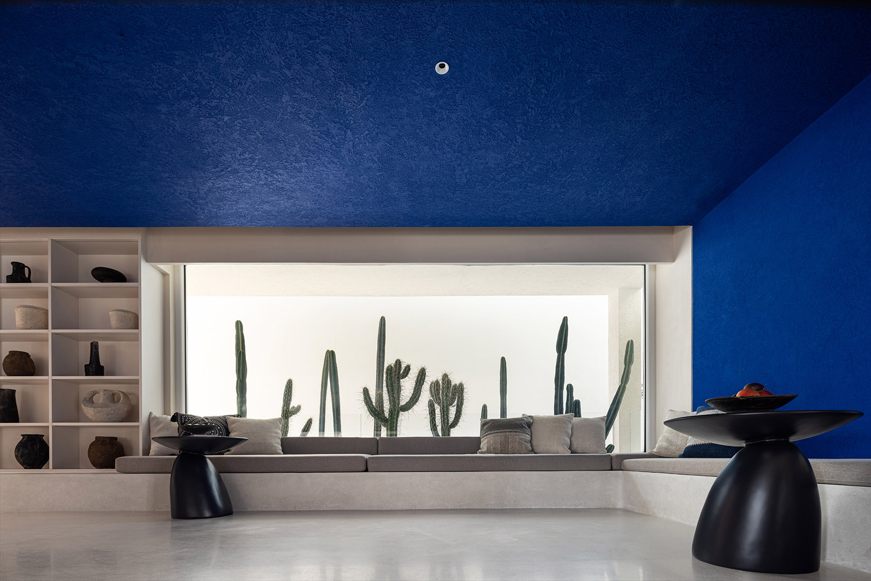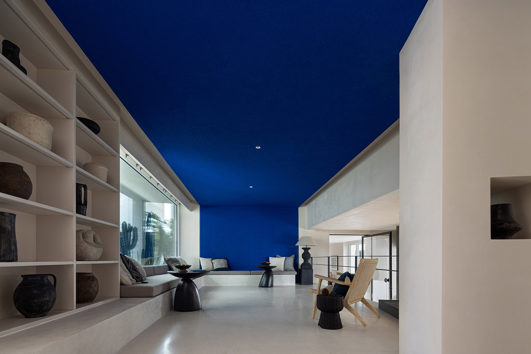 ▼蓝色墙面和天花的书吧