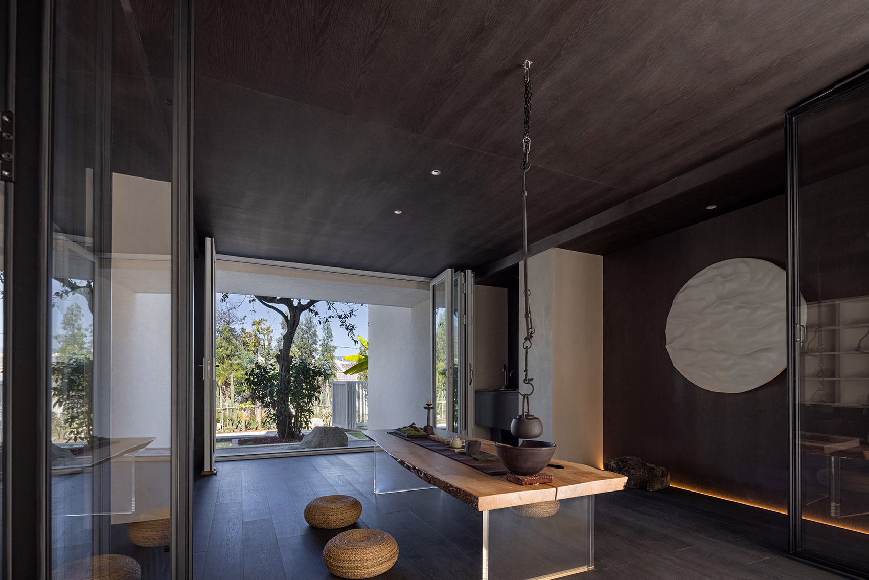 普洱茶是云南的特色代表之一,作为一种发酵茶,故设计师在茶室中以深色调为主。与墙面白色的月亮装置形成对比。面对着远处的苍山,品尝当地的普洱茶,感受独特的文化体验。
