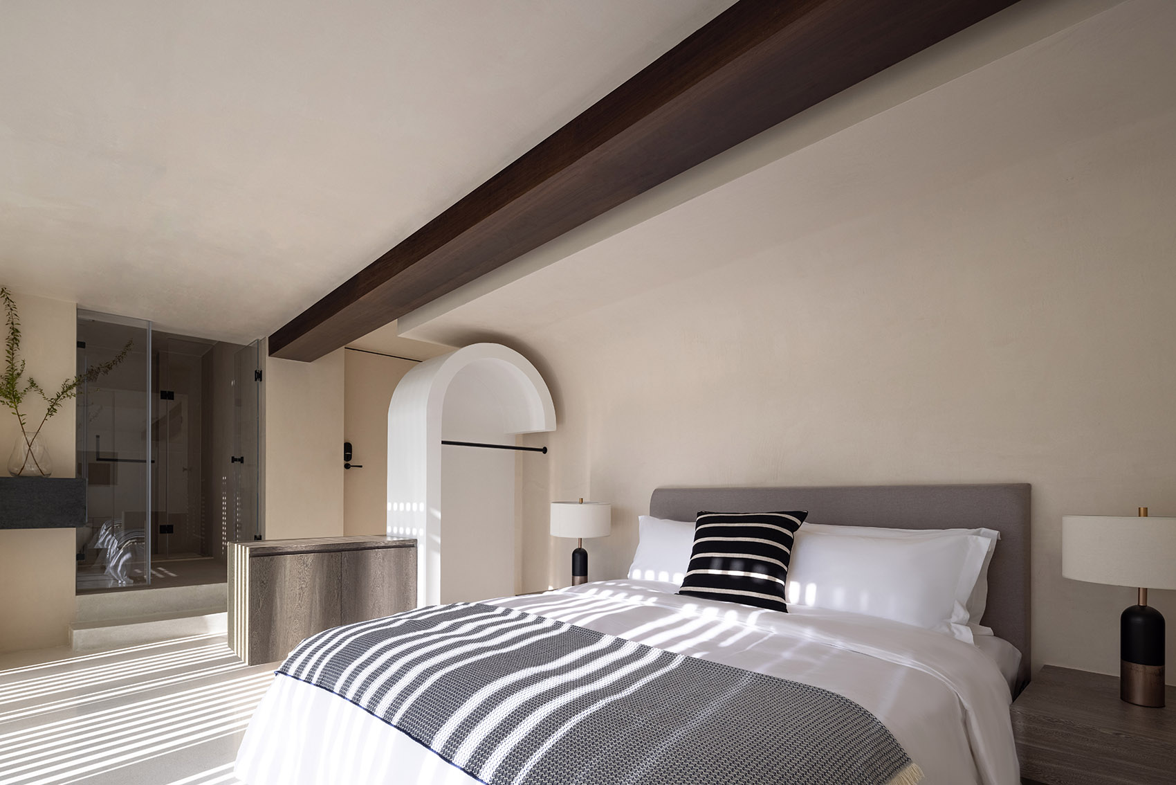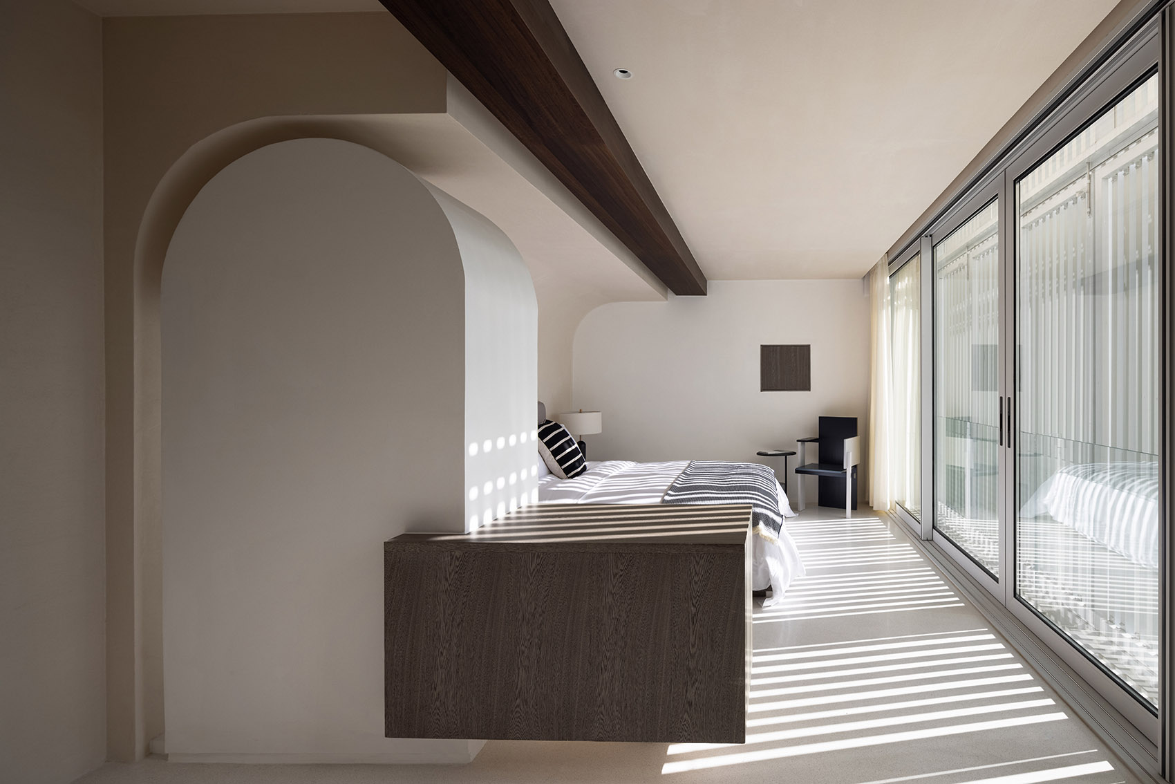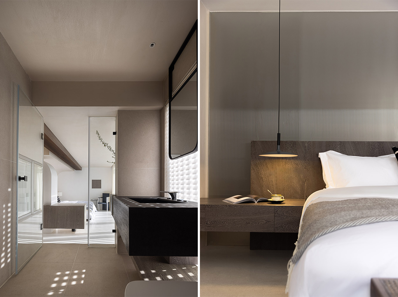 每间客房以专属色温号作为名称,通过色温号来传达白平衡的品牌内涵。米色涂料与蓝色肌理质感的体块相碰撞,蓝色是传统的染料亦是天空与海的颜色,包罗着天地万象。