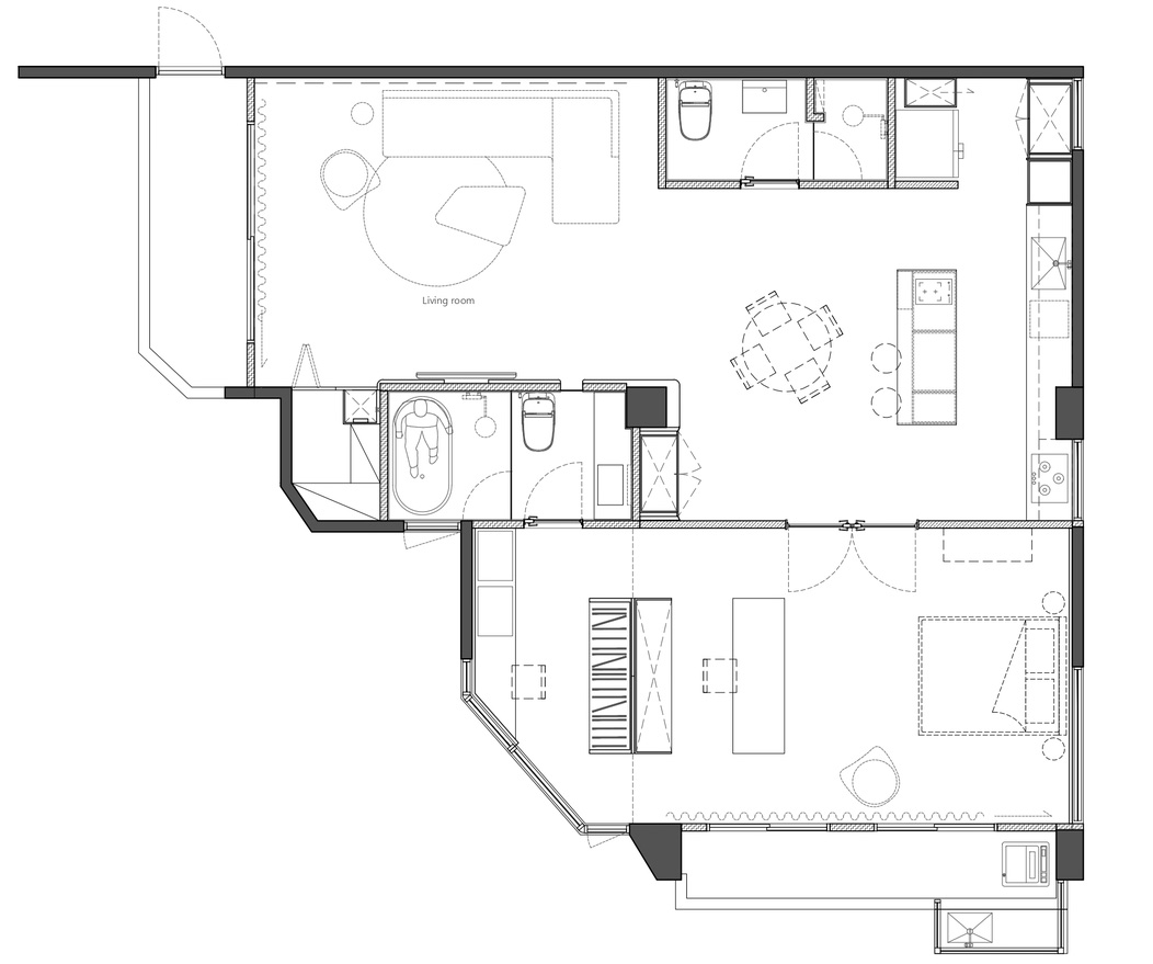 建筑以毫无退缩姿态面对各向街道,形成了室内畸零的格局,居住者往往感到空间的使用不方便。我们将住家的服务机能填充这些畸零区域,创造出完整开放的公共及私密空间,开放空间的设计重点以层次的表现为主,从阳台进入屋内感受到的是客厅、餐厅与厨房的连贯及开放性,透过各空间所对应的家具或周遭设计,由外而内、从前至后运用不同材料或家具的高度,呈现丰富但不紊乱的空间表情。