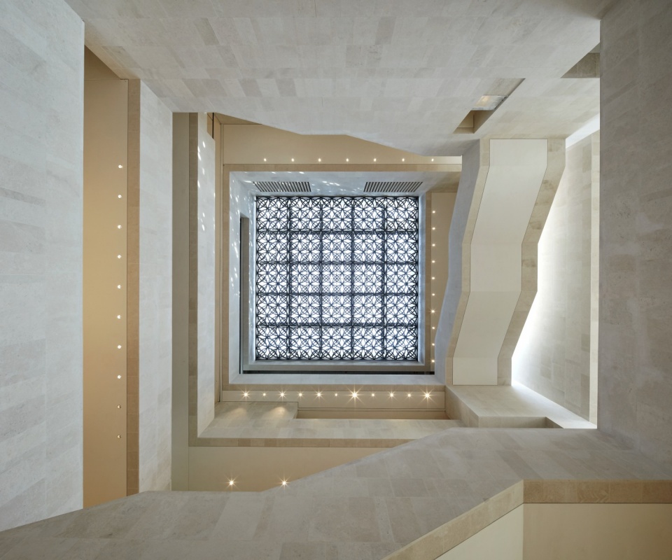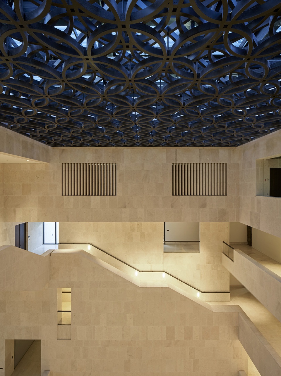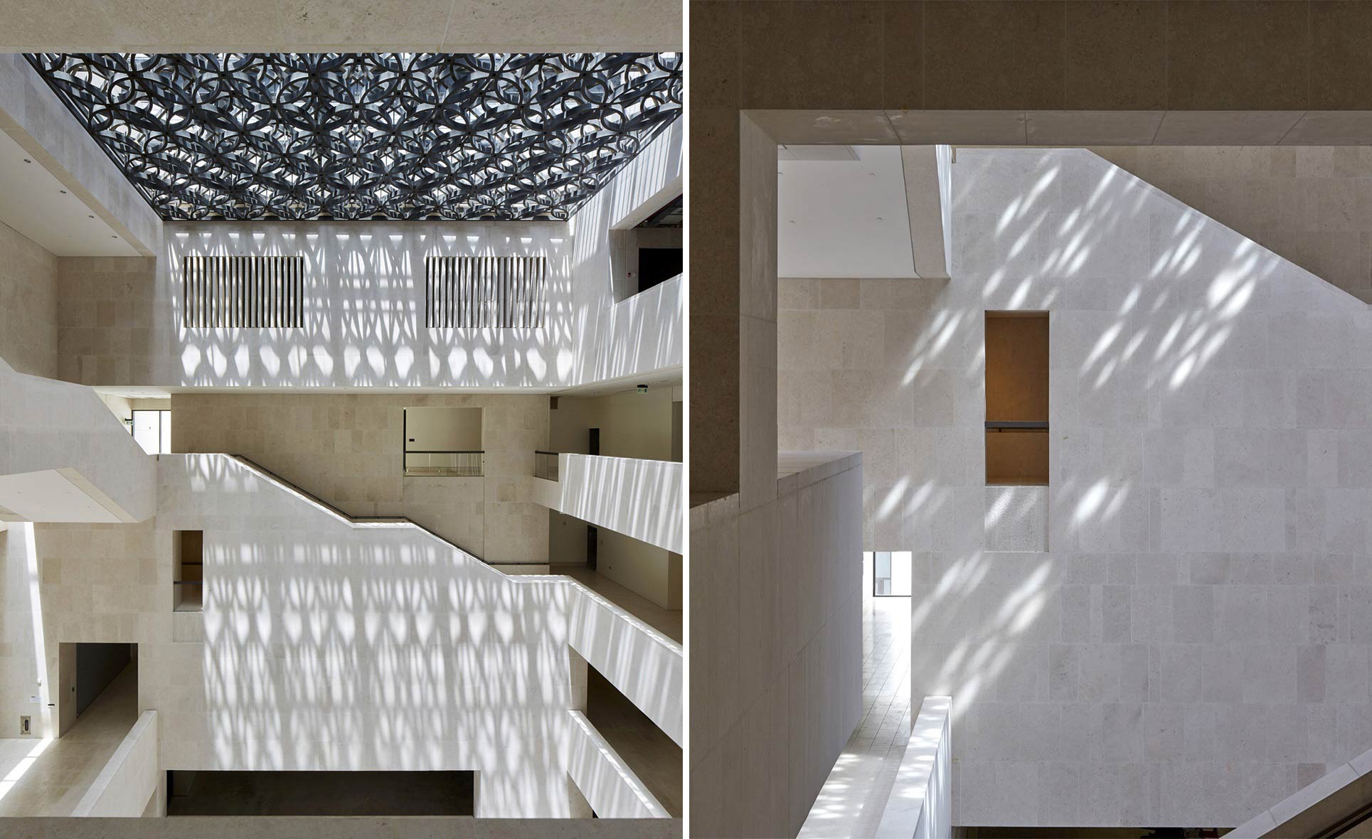 建筑内引入公共空间,这是一个富有层次的活动场所,也是赞颂设计、时尚、音乐、电影和当代艺术的空间。公共空间中心是宽敞的中庭,四周环绕宏伟的楼梯,上方是天窗,伊斯兰图案的格栅将阳光引入室内。John McAslan说:“这种光线斑驳的环境让人联想到邻近历史悠久的露天广场,这里提供了充满活力的艺术集市,伊斯兰建筑和现代建筑在此交融。”